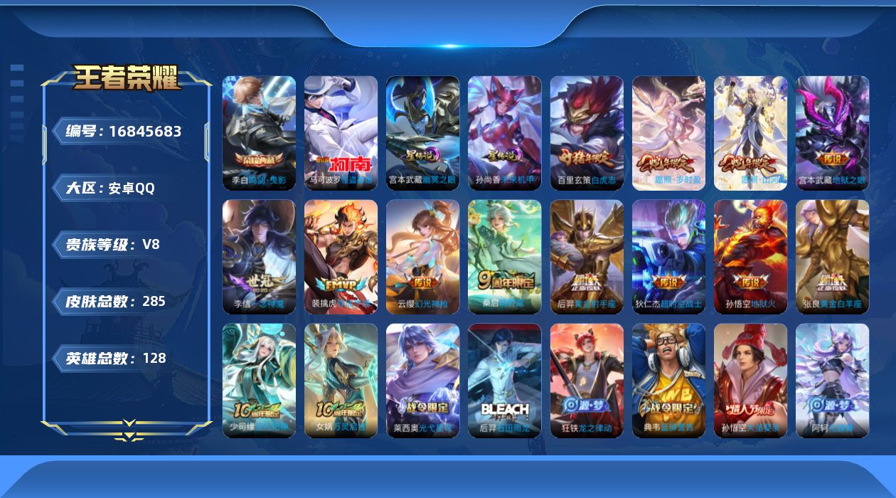 贵族等级:v8皮肤数:285传说品质16 生肖限定5 情人节限定1 珍品传说1 荣耀典藏1 英雄数:128