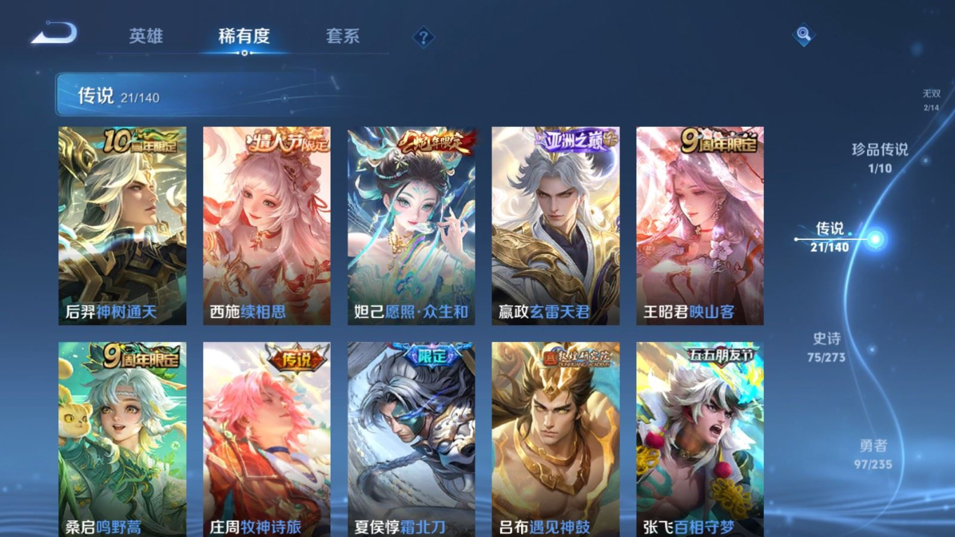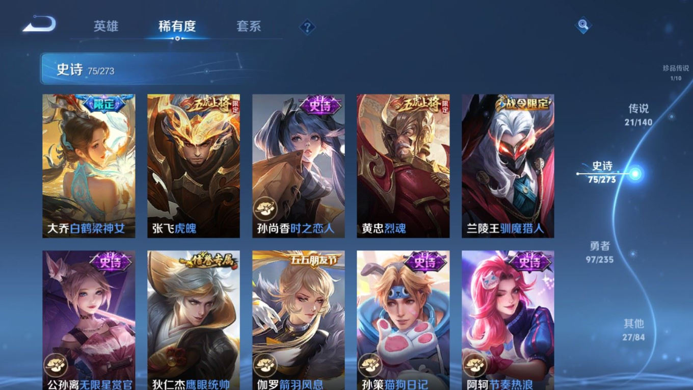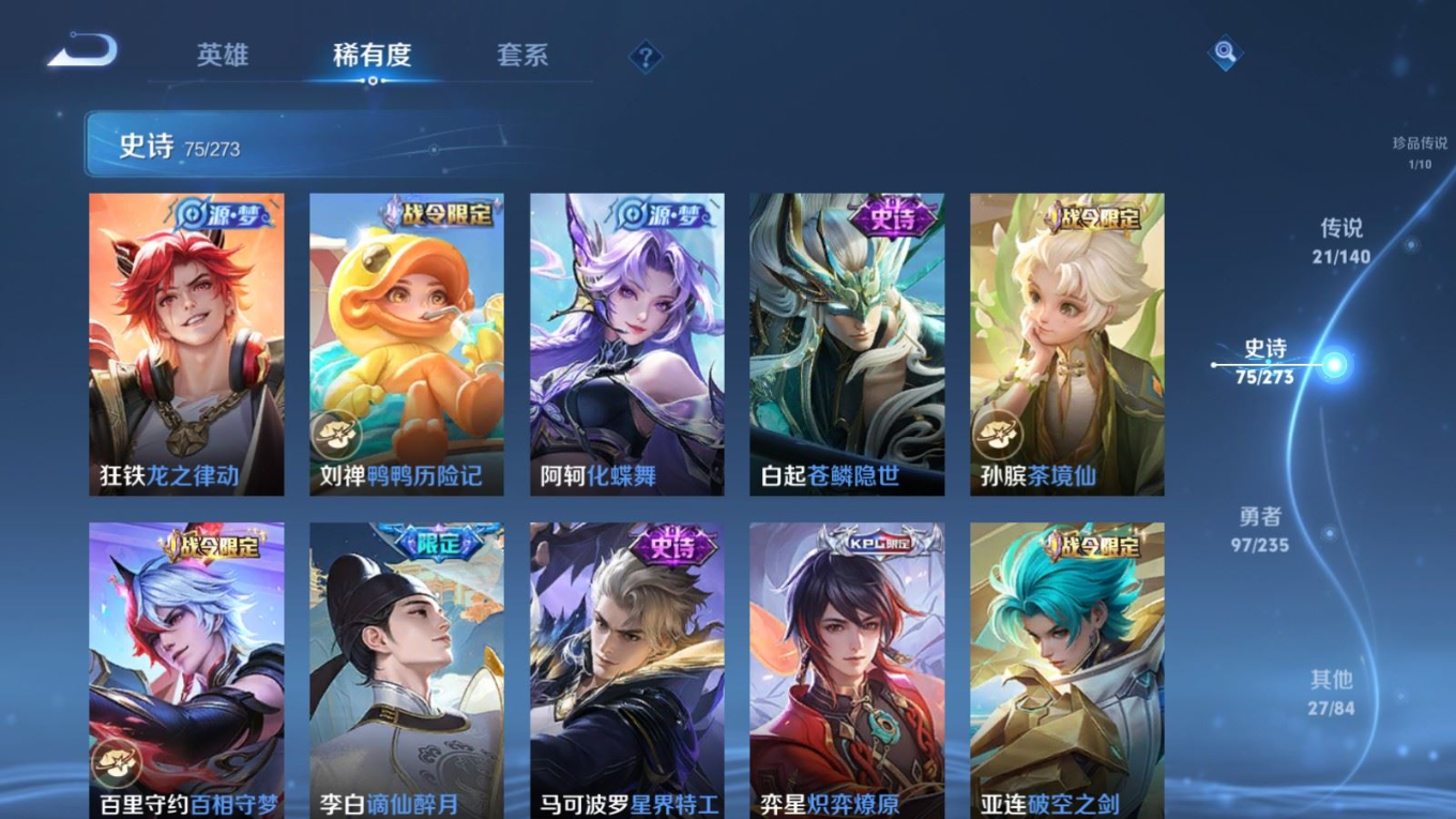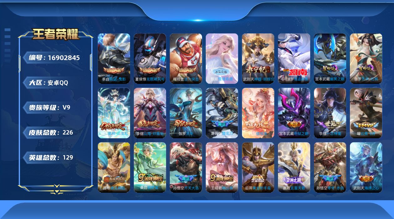贵族等级:v9皮肤数:229传说品质21 情人节限定2 无双2 生肖限定4 荣耀典藏3 珍品传说1 英雄数:129
