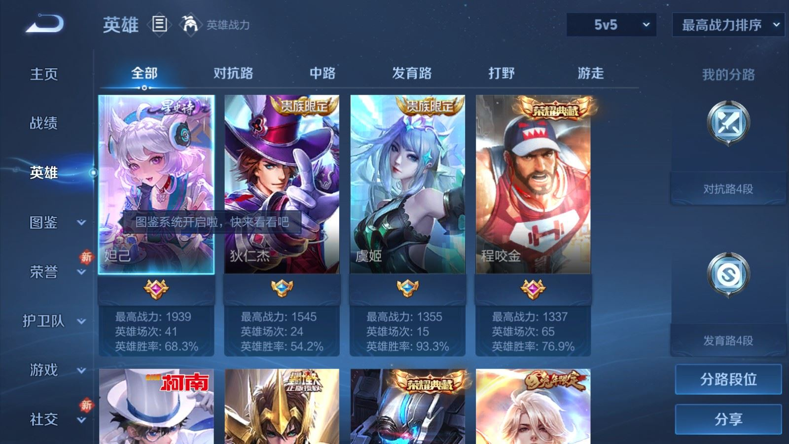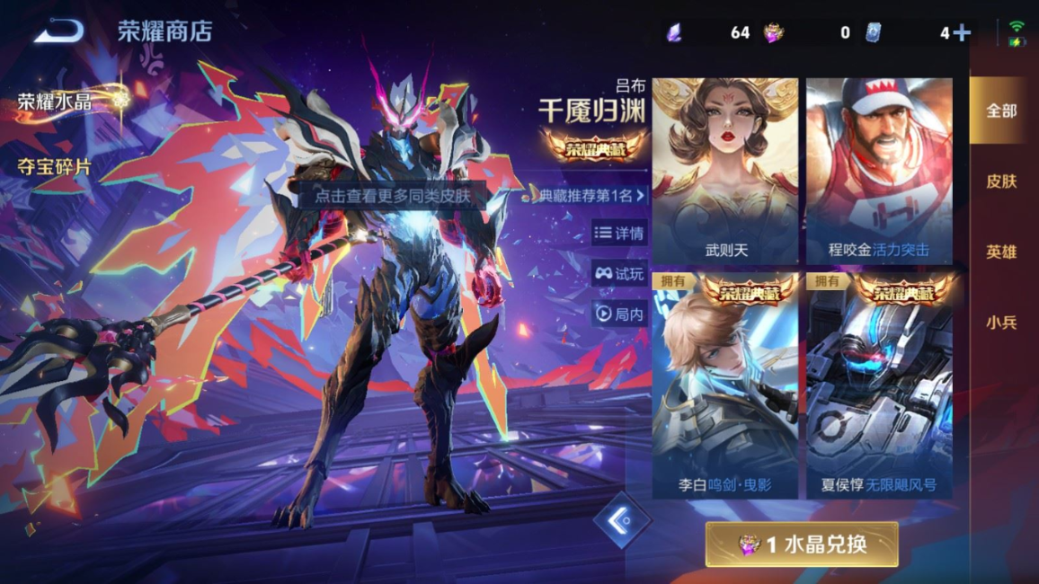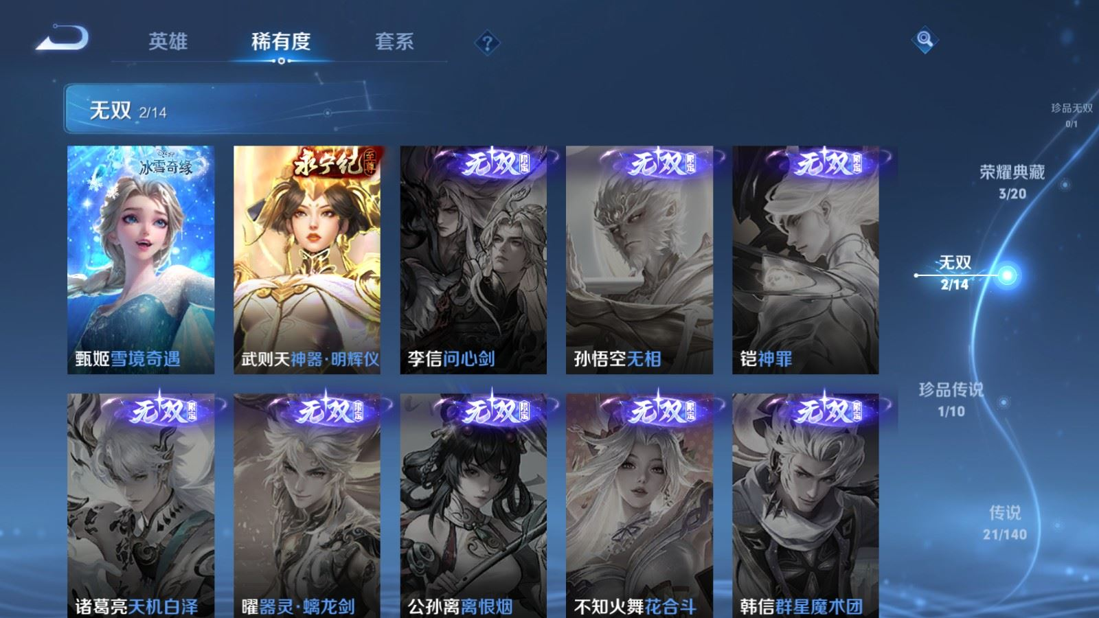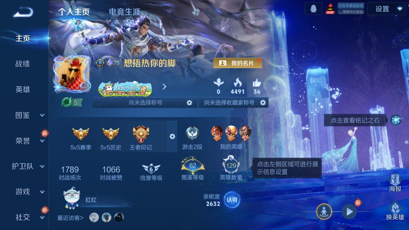贵族等级:v9皮肤数:229传说品质21 情人节限定2 无双2 生肖限定4 荣耀典藏3 珍品传说1 英雄数:129