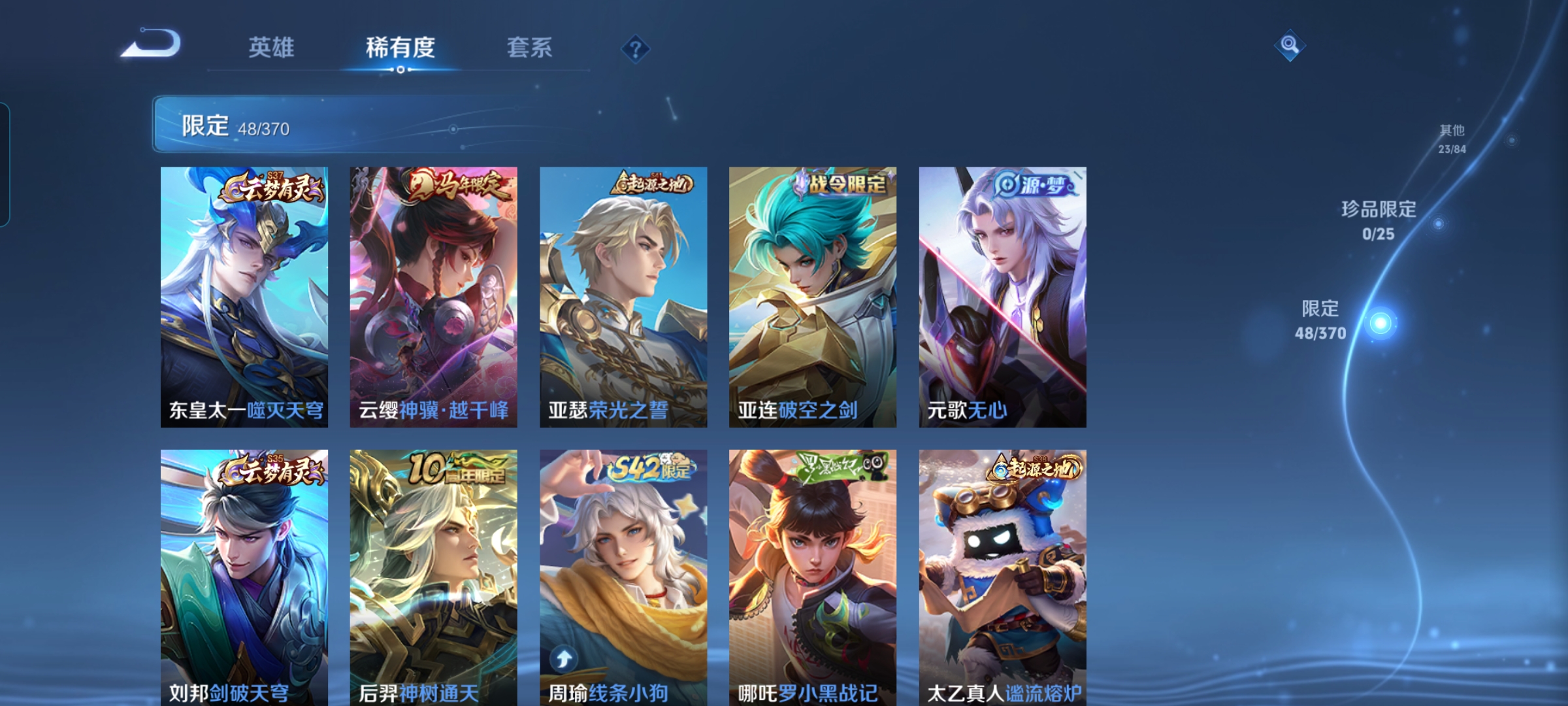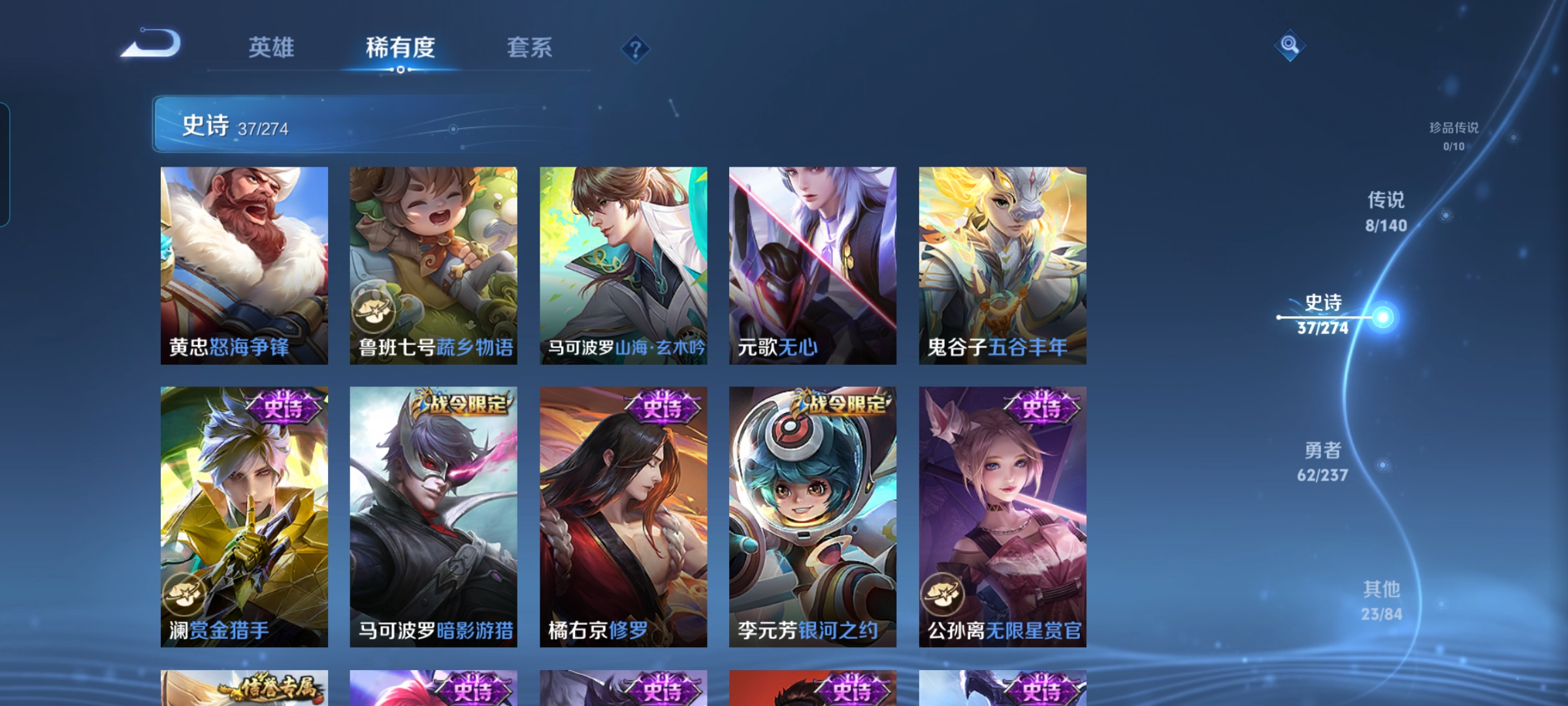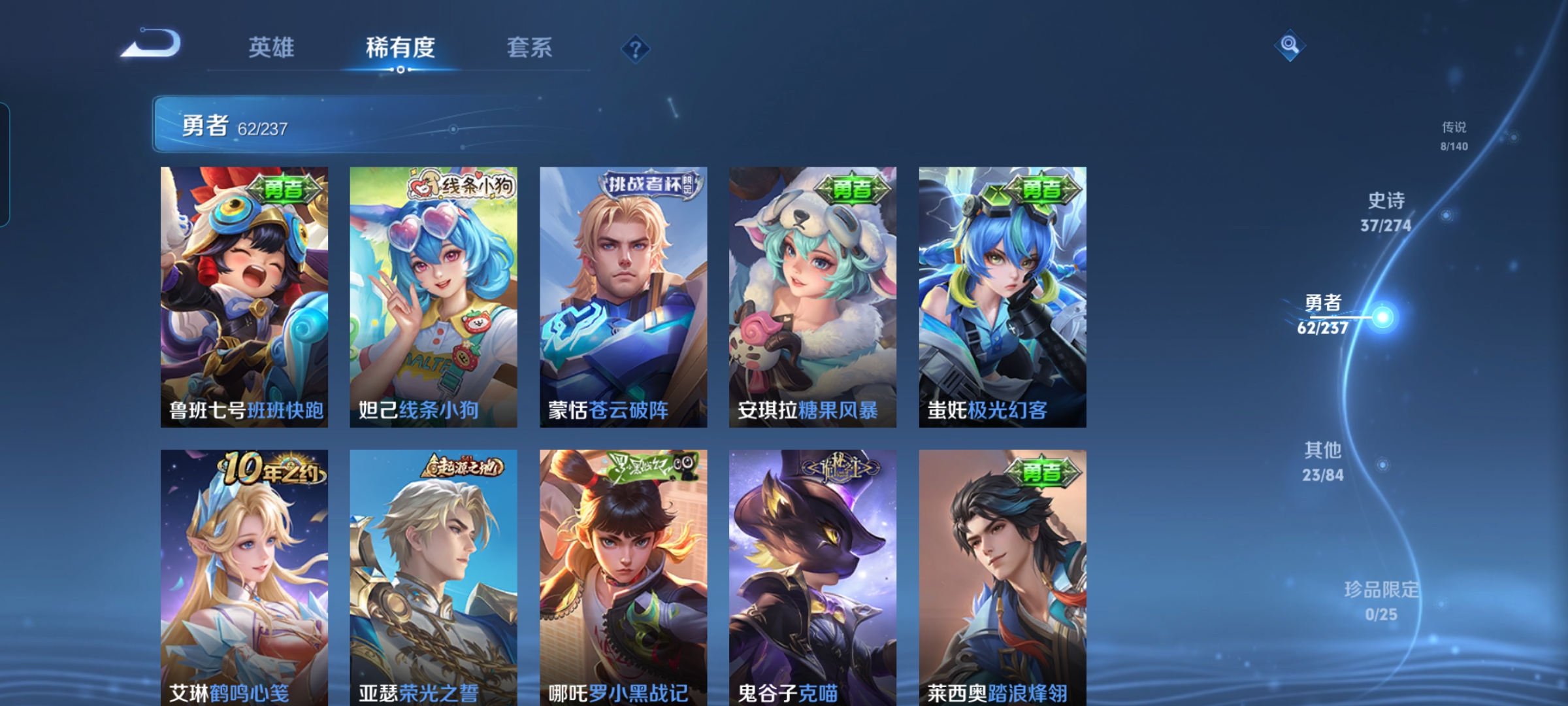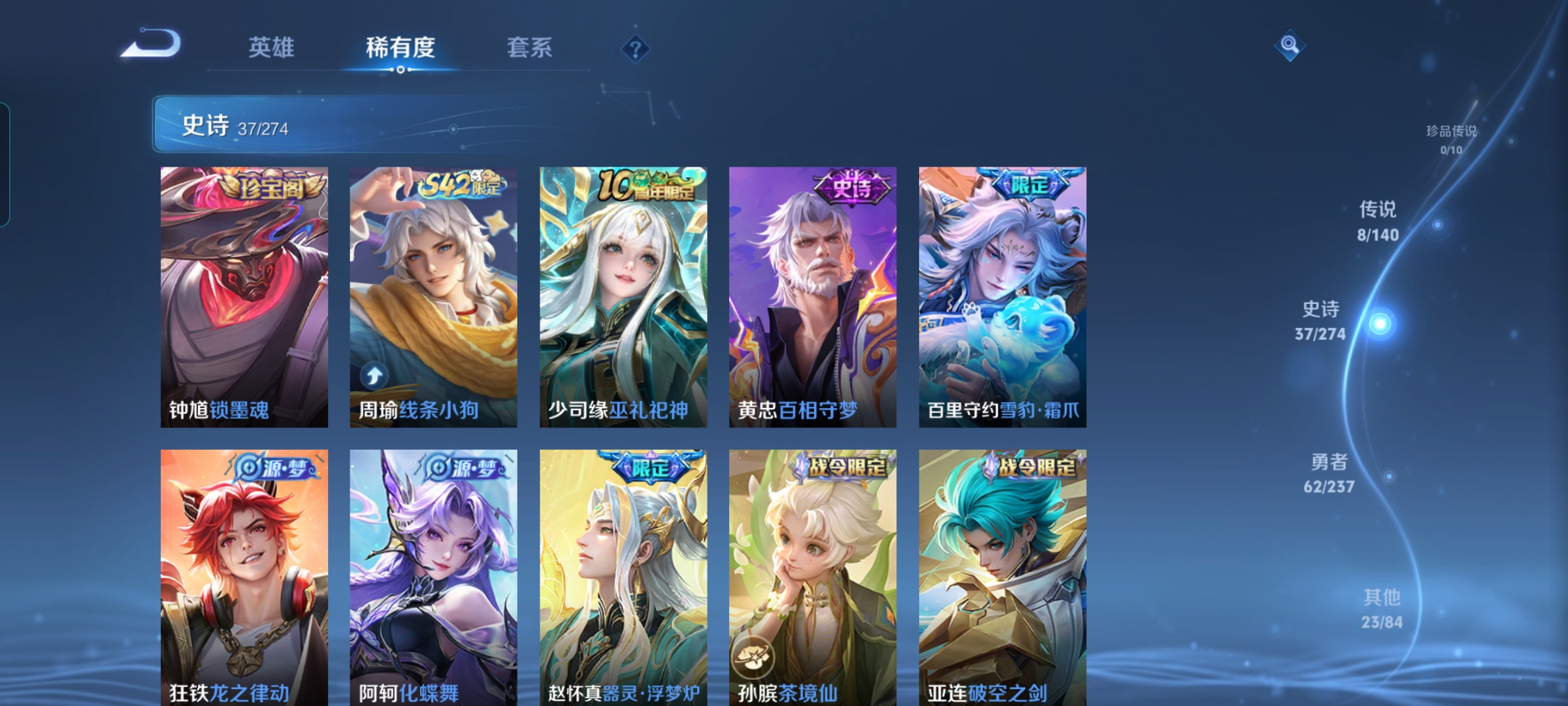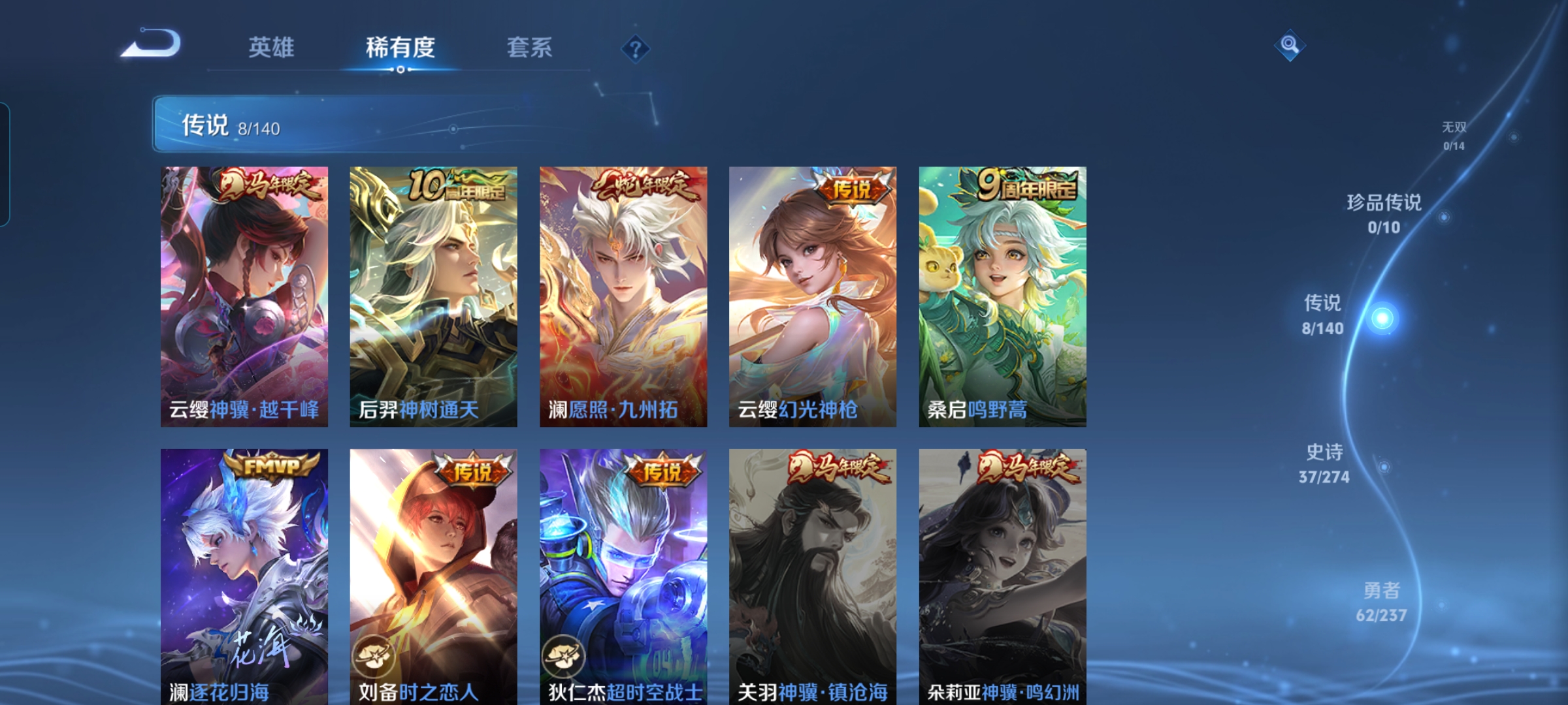 贵族等级:v6皮肤数:131传说品质8 生肖限定3 荣耀典藏1 英雄数:127