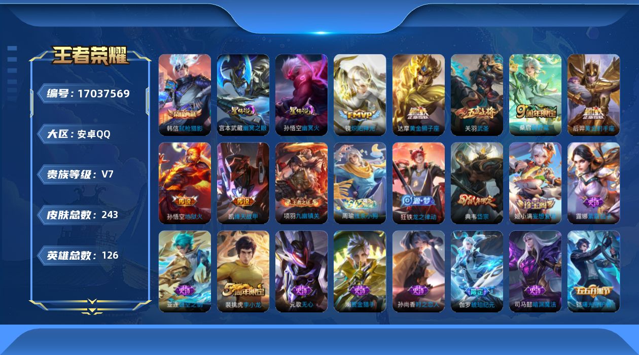 贵族等级:v7皮肤数:243传说品质7 生肖限定1 荣耀典藏1 英雄数:126