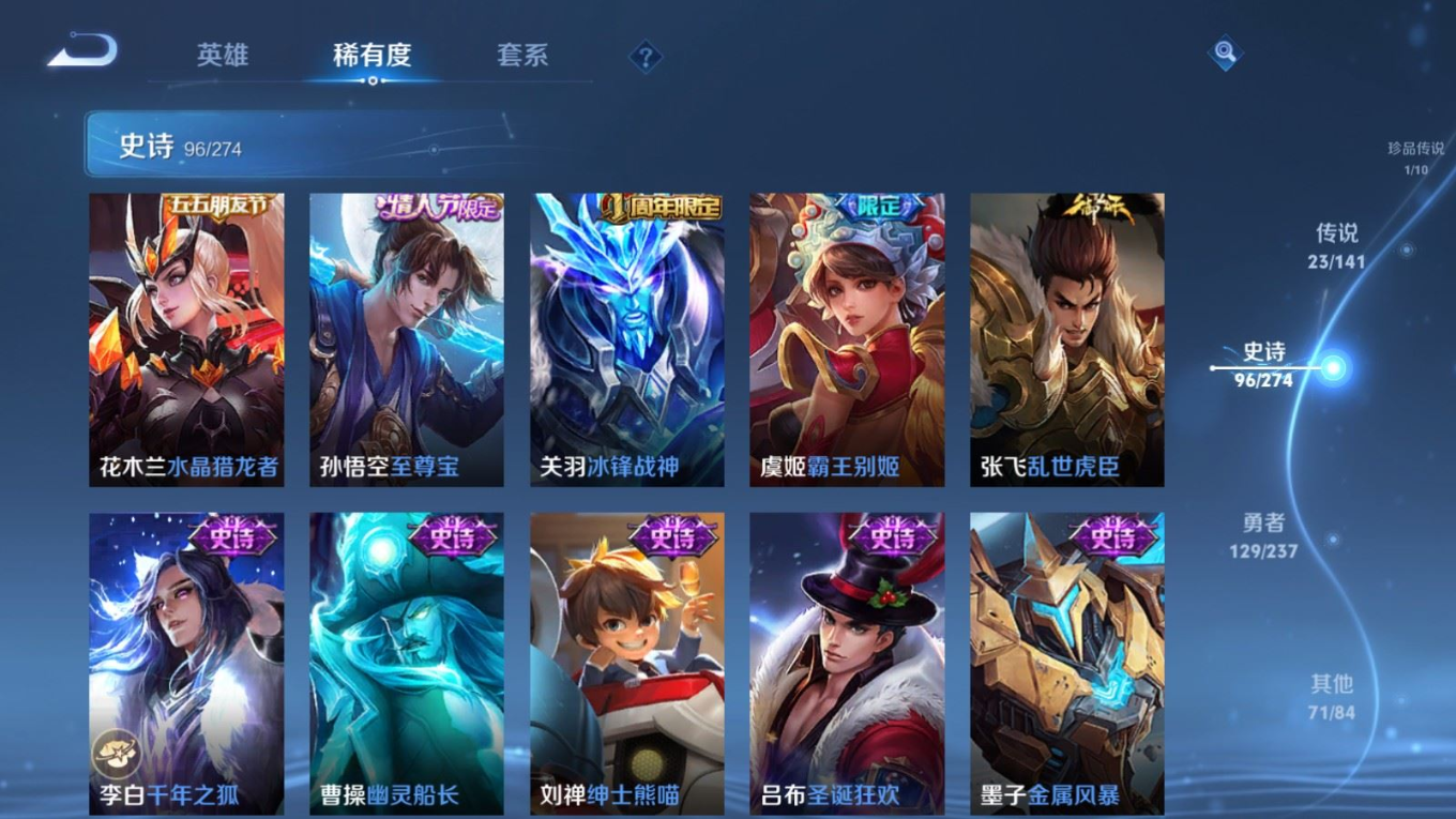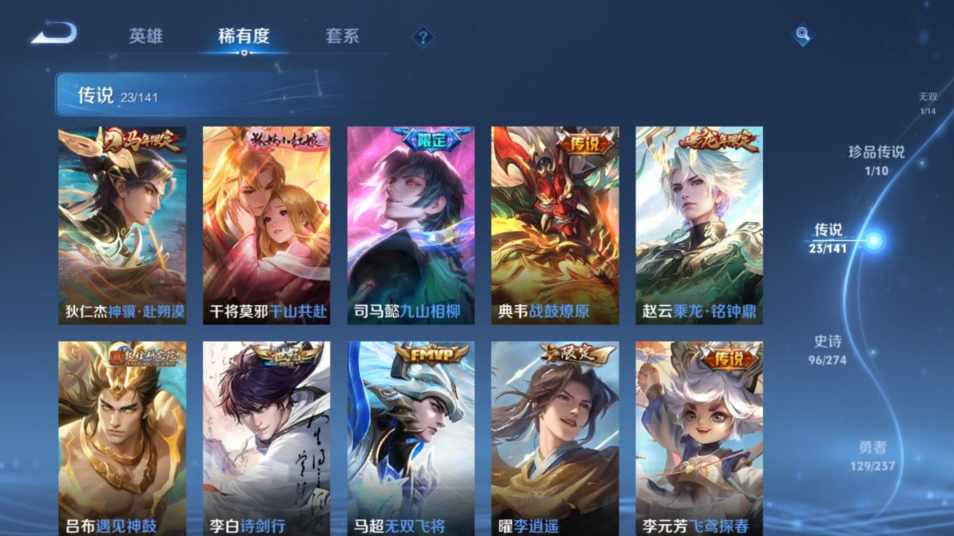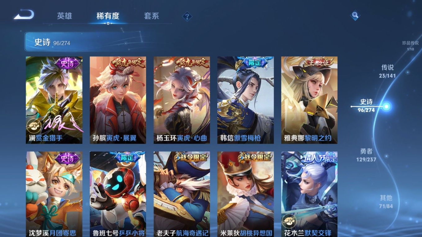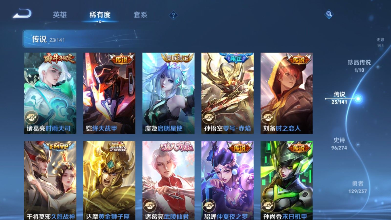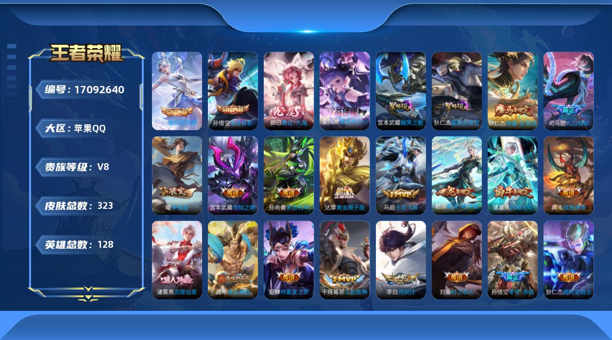 贵族等级:v8皮肤数:326生肖限定7 情人节限定5 传说品质23 荣耀典藏2 珍品传说1 无双1 英雄数:128