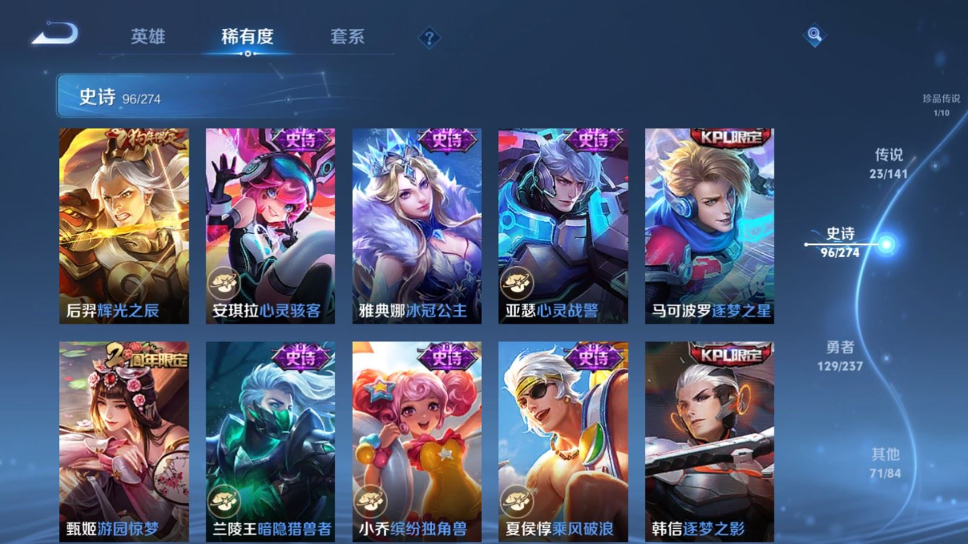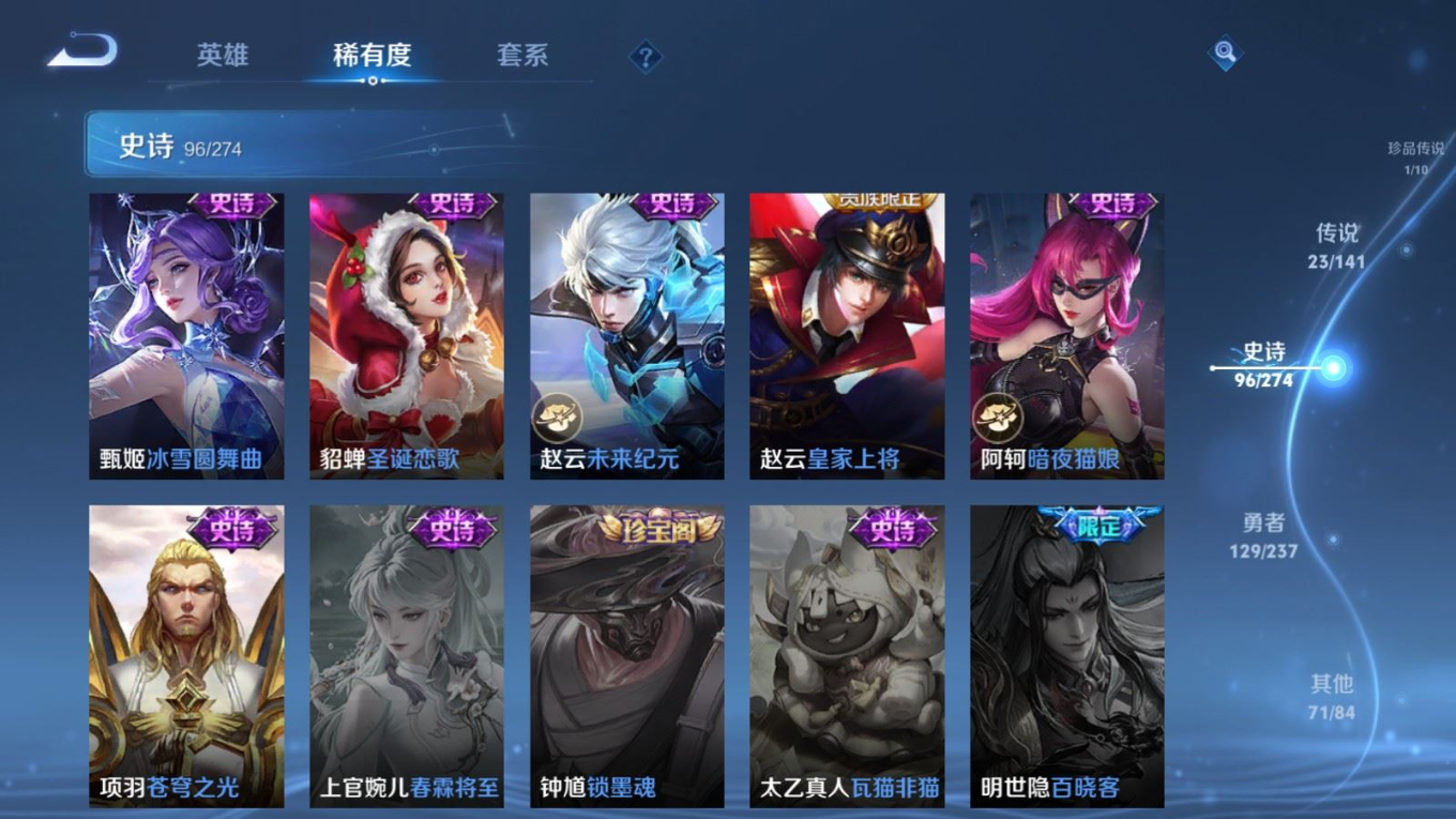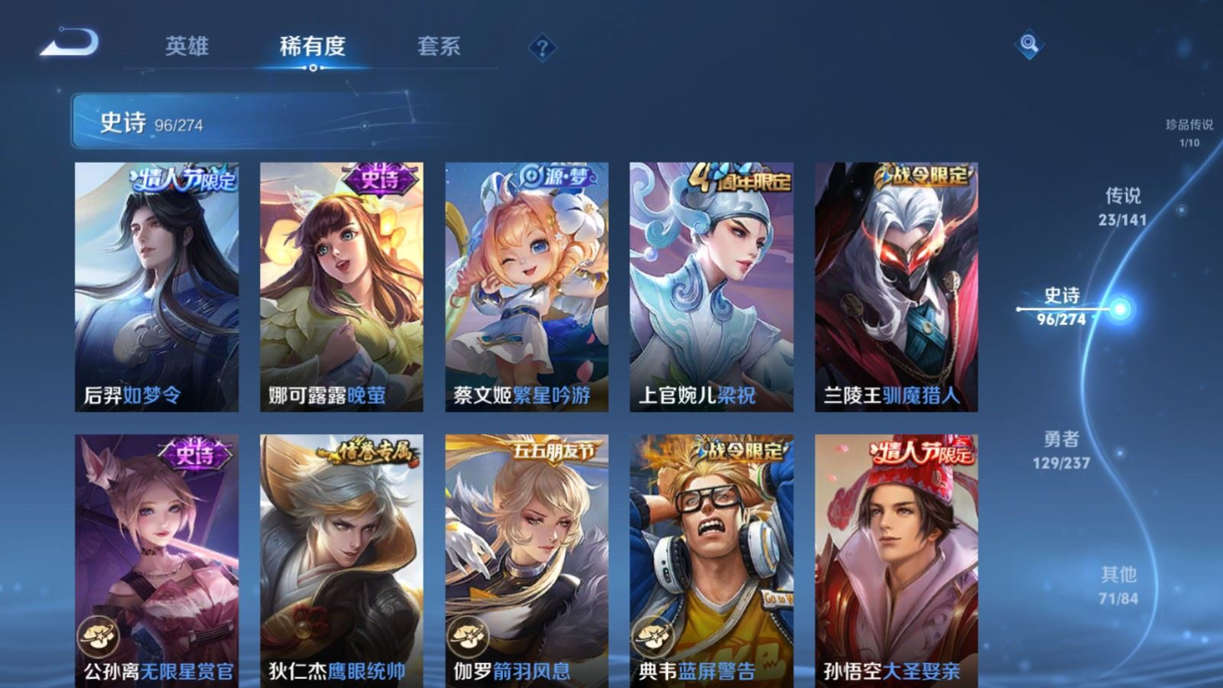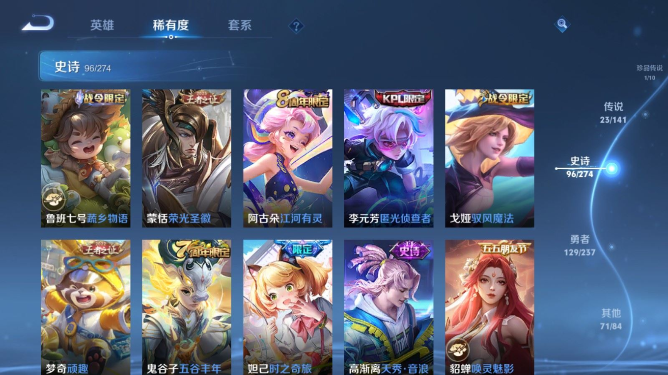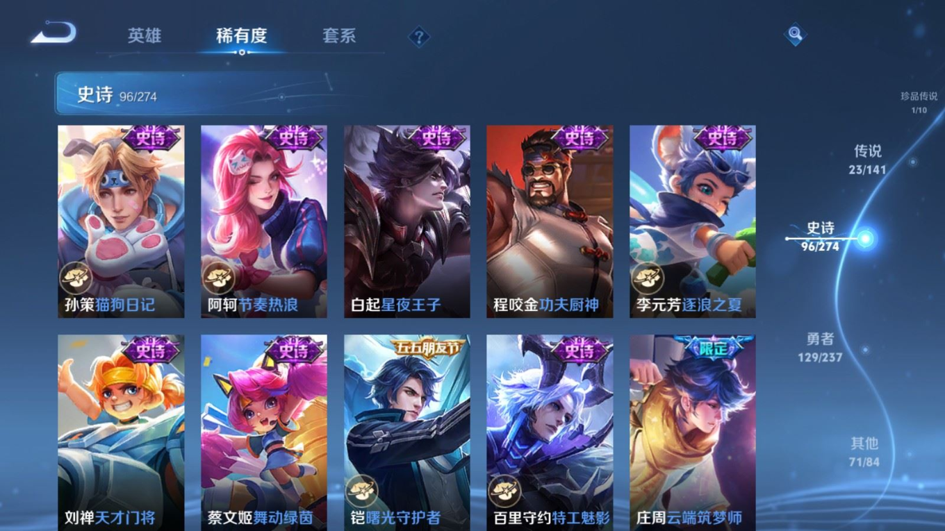贵族等级:v8皮肤数:326生肖限定7 情人节限定5 传说品质23 荣耀典藏2 珍品传说1 无双1 英雄数:128