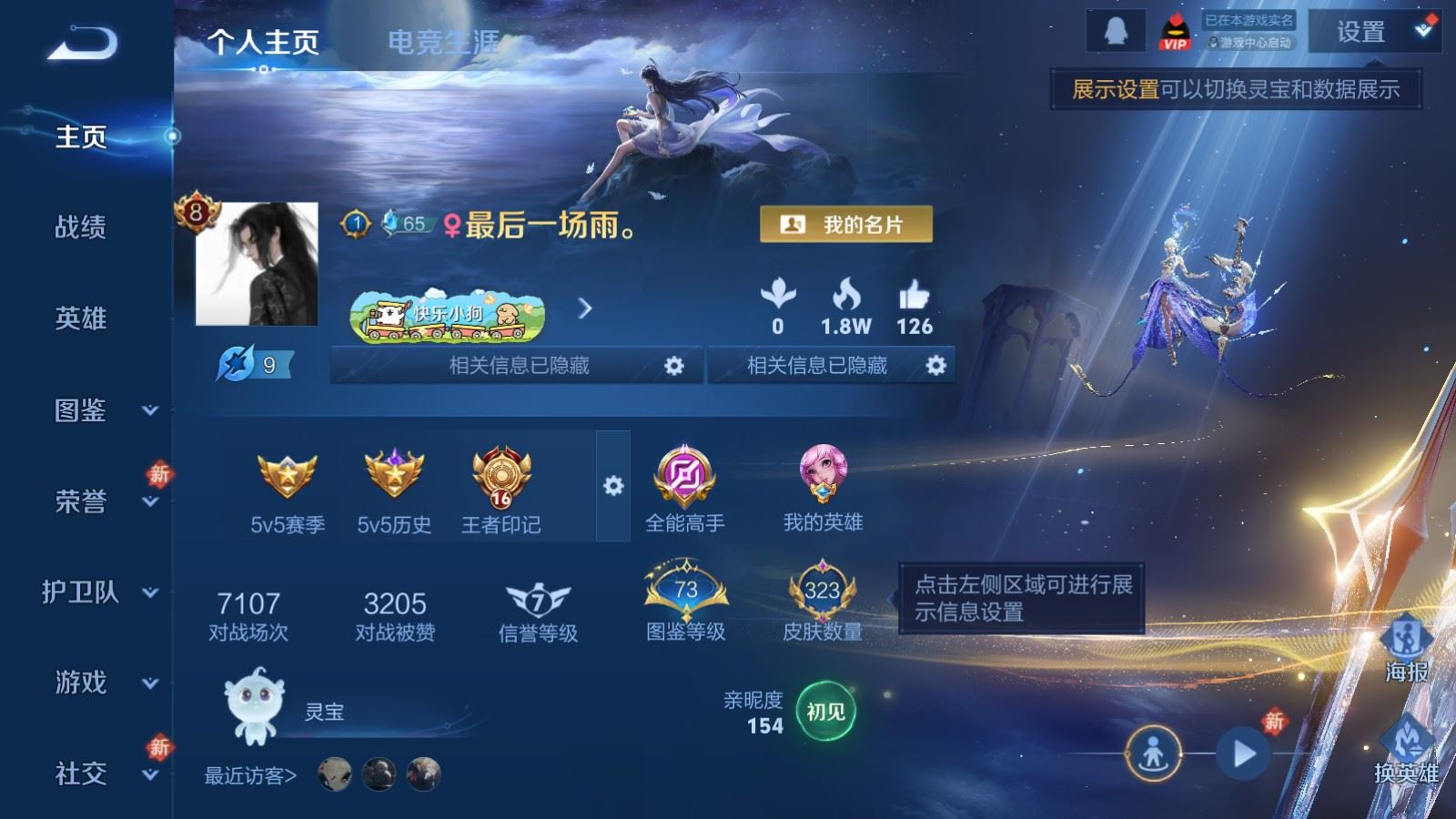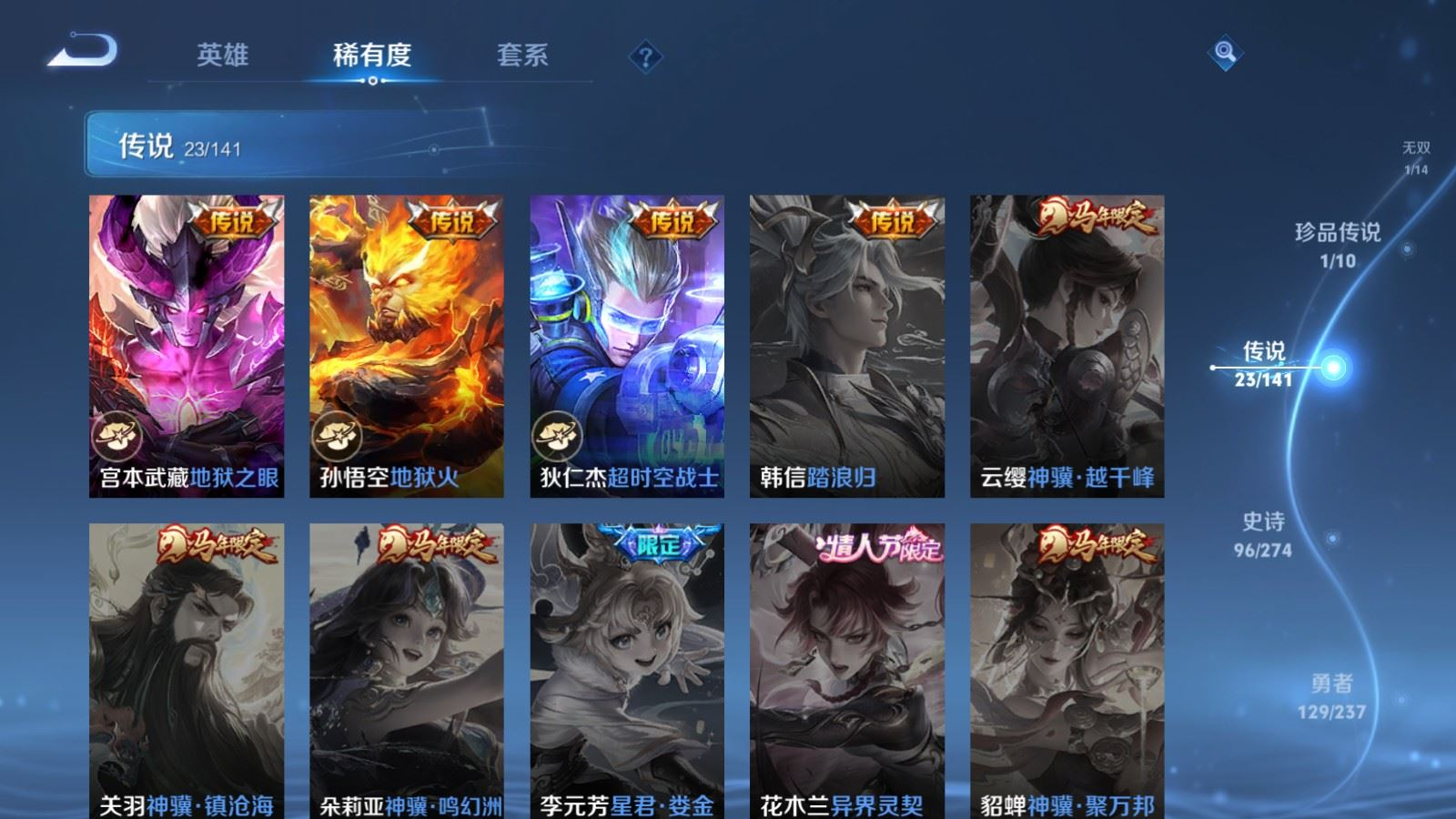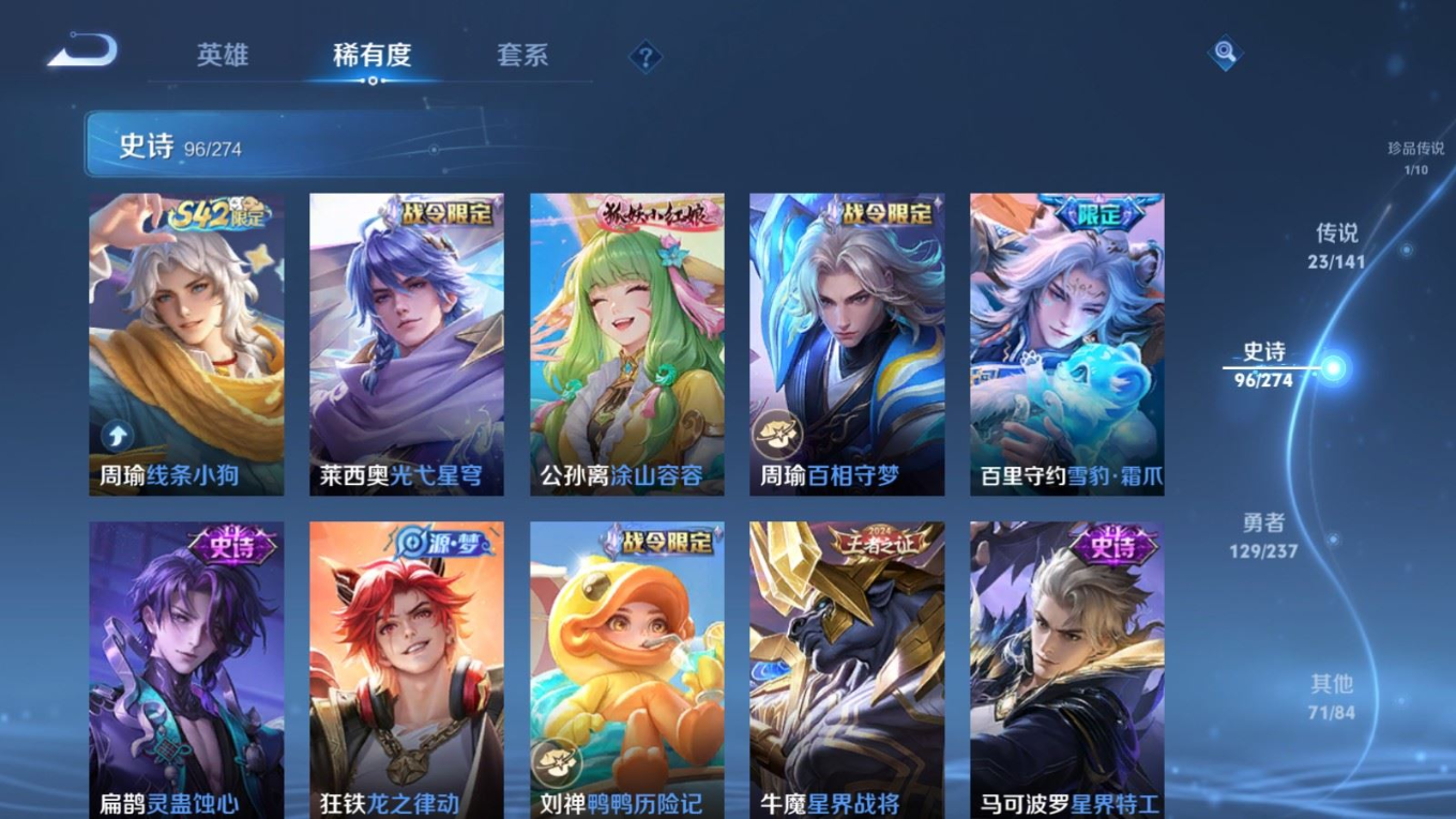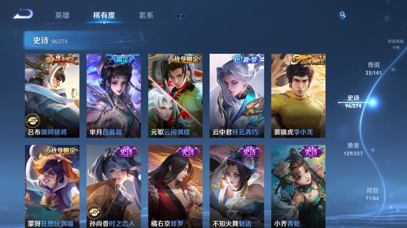 贵族等级:v8皮肤数:326生肖限定7 情人节限定5 传说品质23 荣耀典藏2 珍品传说1 无双1 英雄数:128