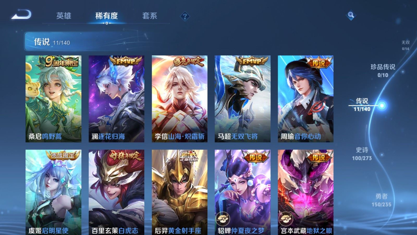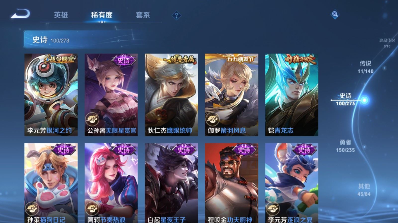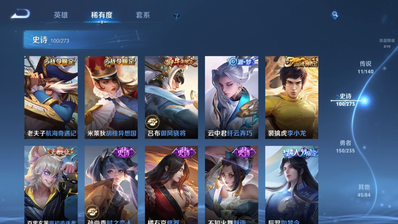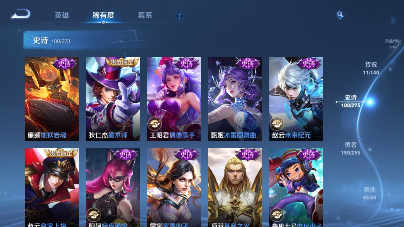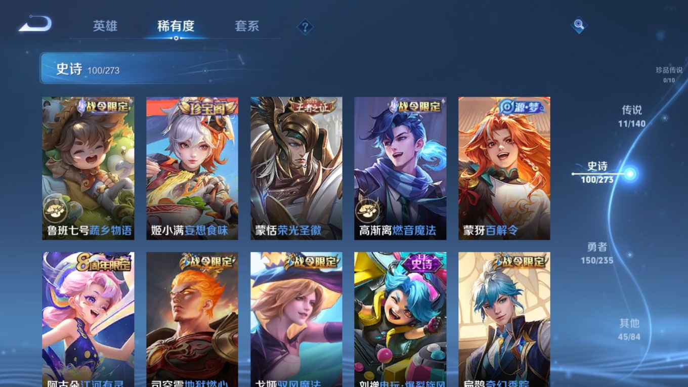 贵族等级:v8皮肤数:307传说品质11 情人节限定1 生肖限定4 荣耀典藏1 英雄数:128
