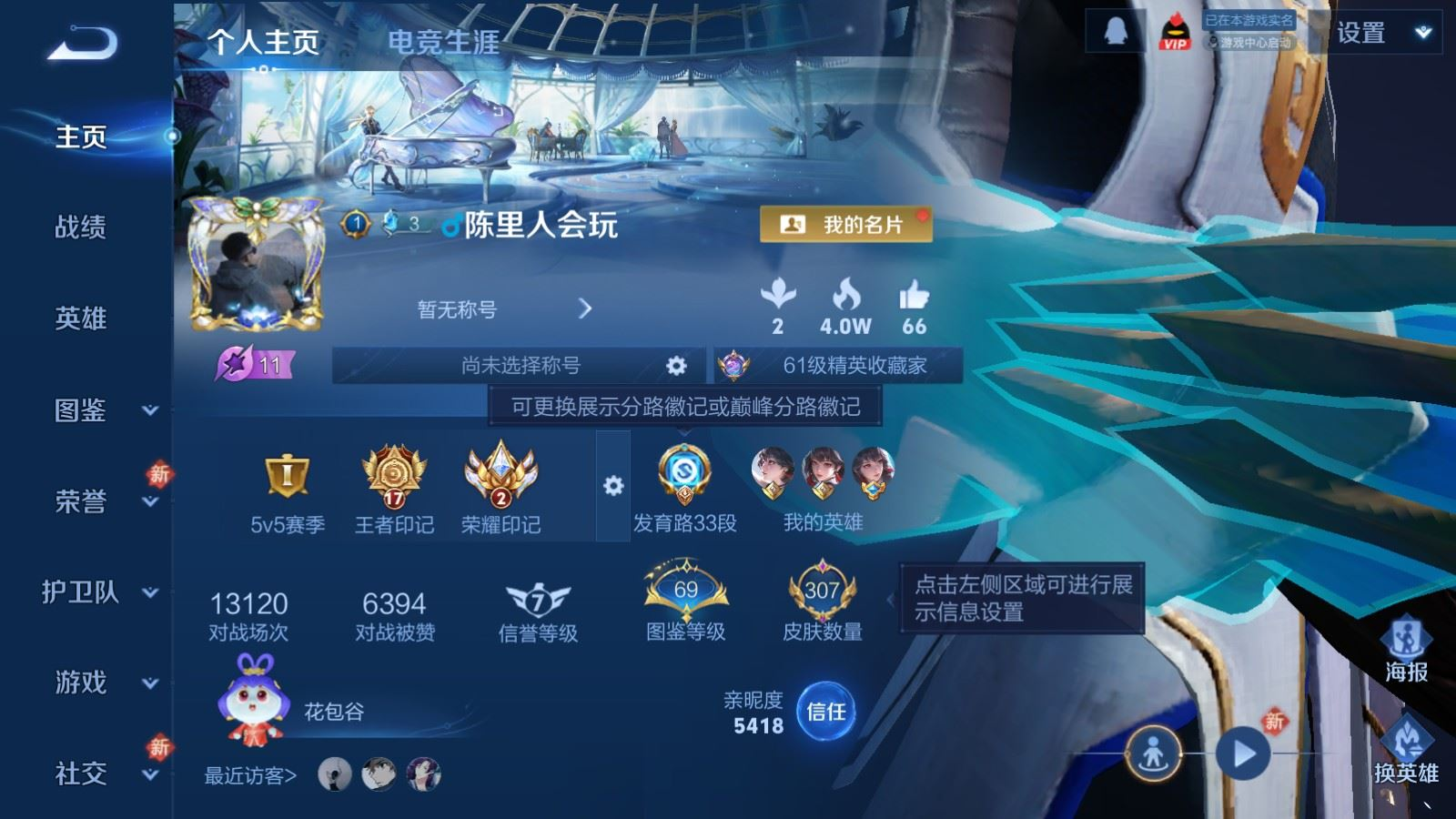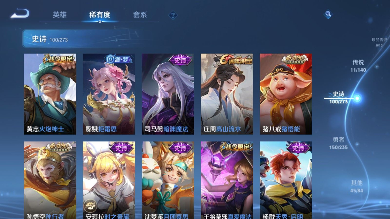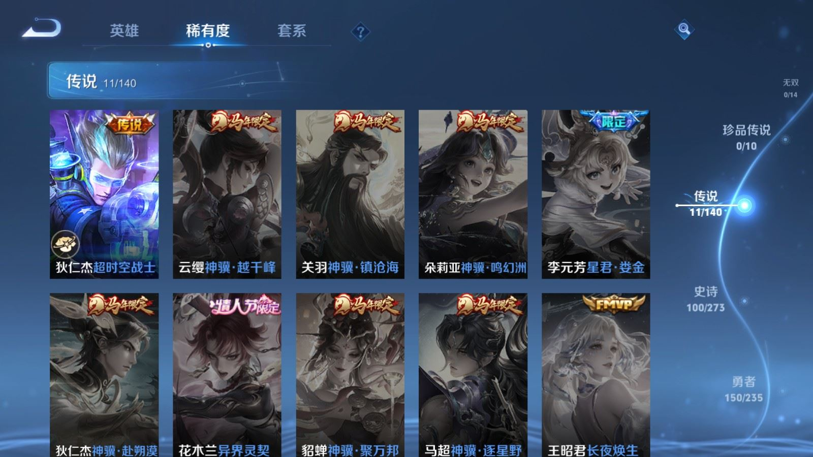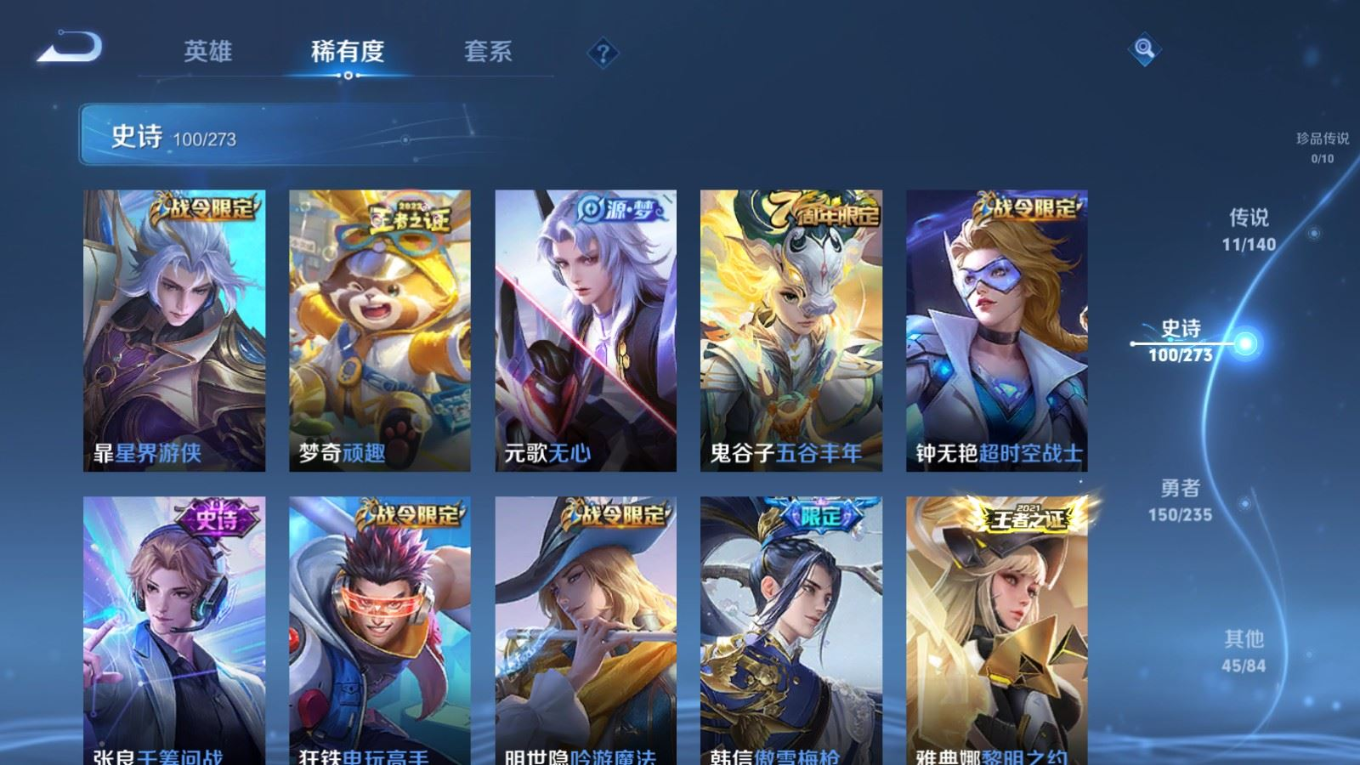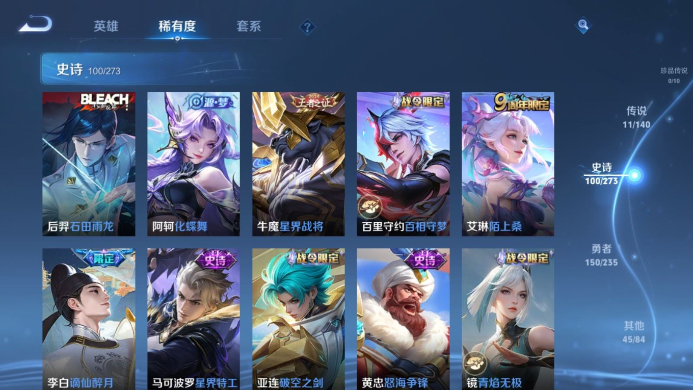 贵族等级:v8皮肤数:307传说品质11 情人节限定1 生肖限定4 荣耀典藏1 英雄数:128