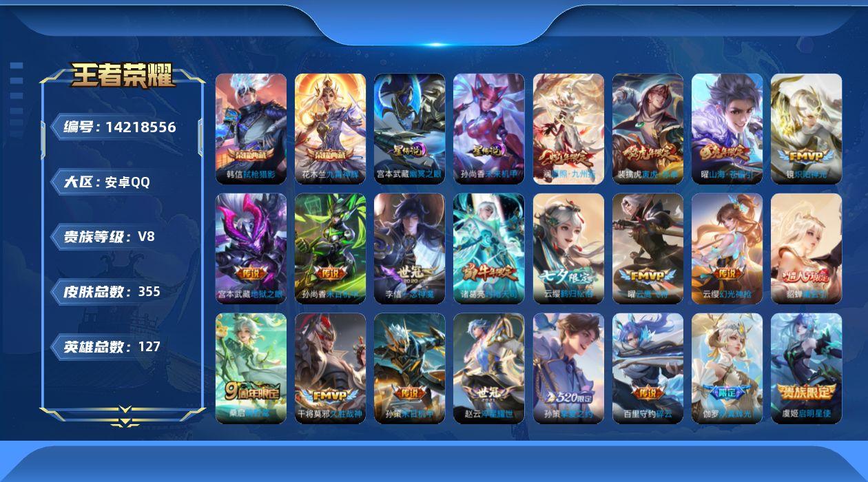 贵族等级:v8皮肤数:355传说品质21 生肖限定7 荣耀典藏2 情人节限定1 英雄数:127