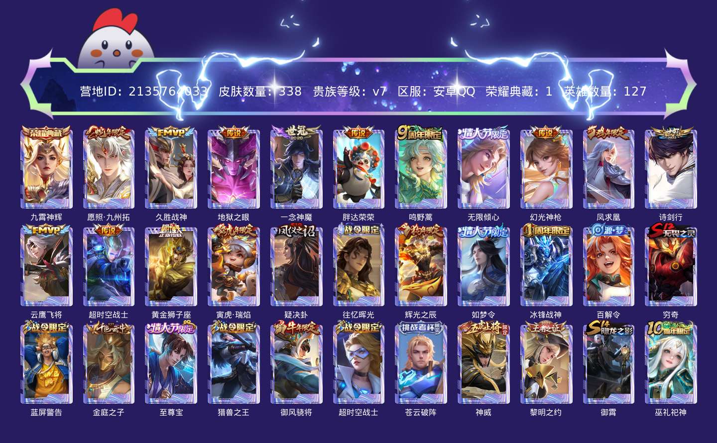 贵族等级:v7皮肤数:338生肖限定8 情人节限定3 传说品质14 荣耀典藏1 英雄数:127
