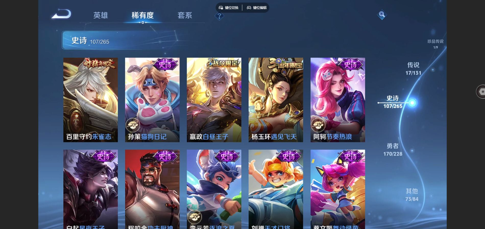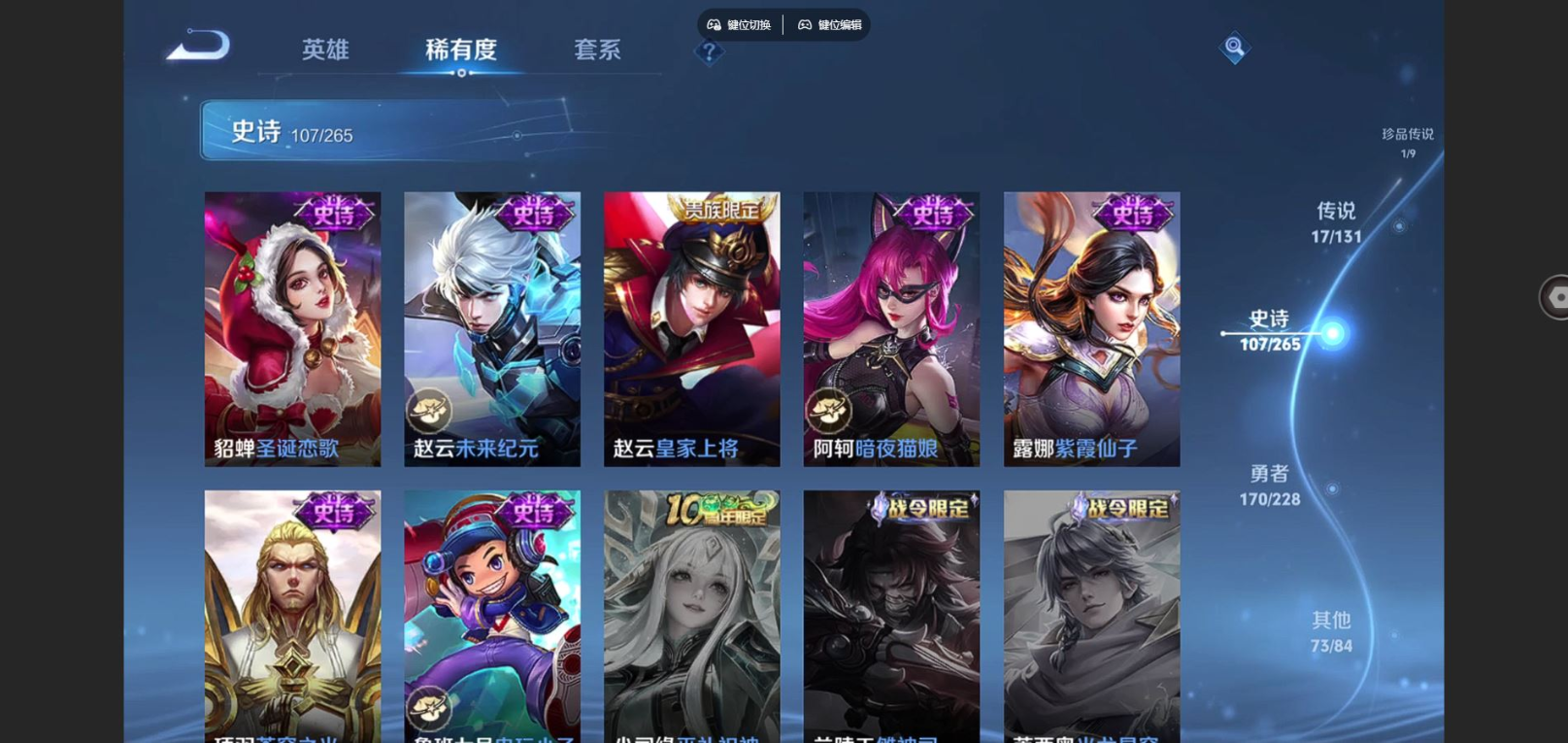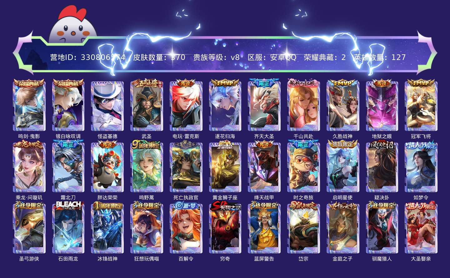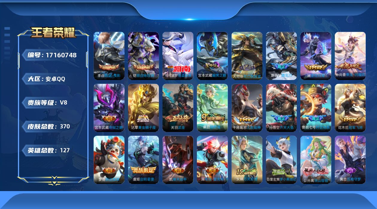 贵族等级:v8皮肤数:370情人节限定3 传说品质17 生肖限定5 珍品传说1 荣耀典藏2 英雄数:127