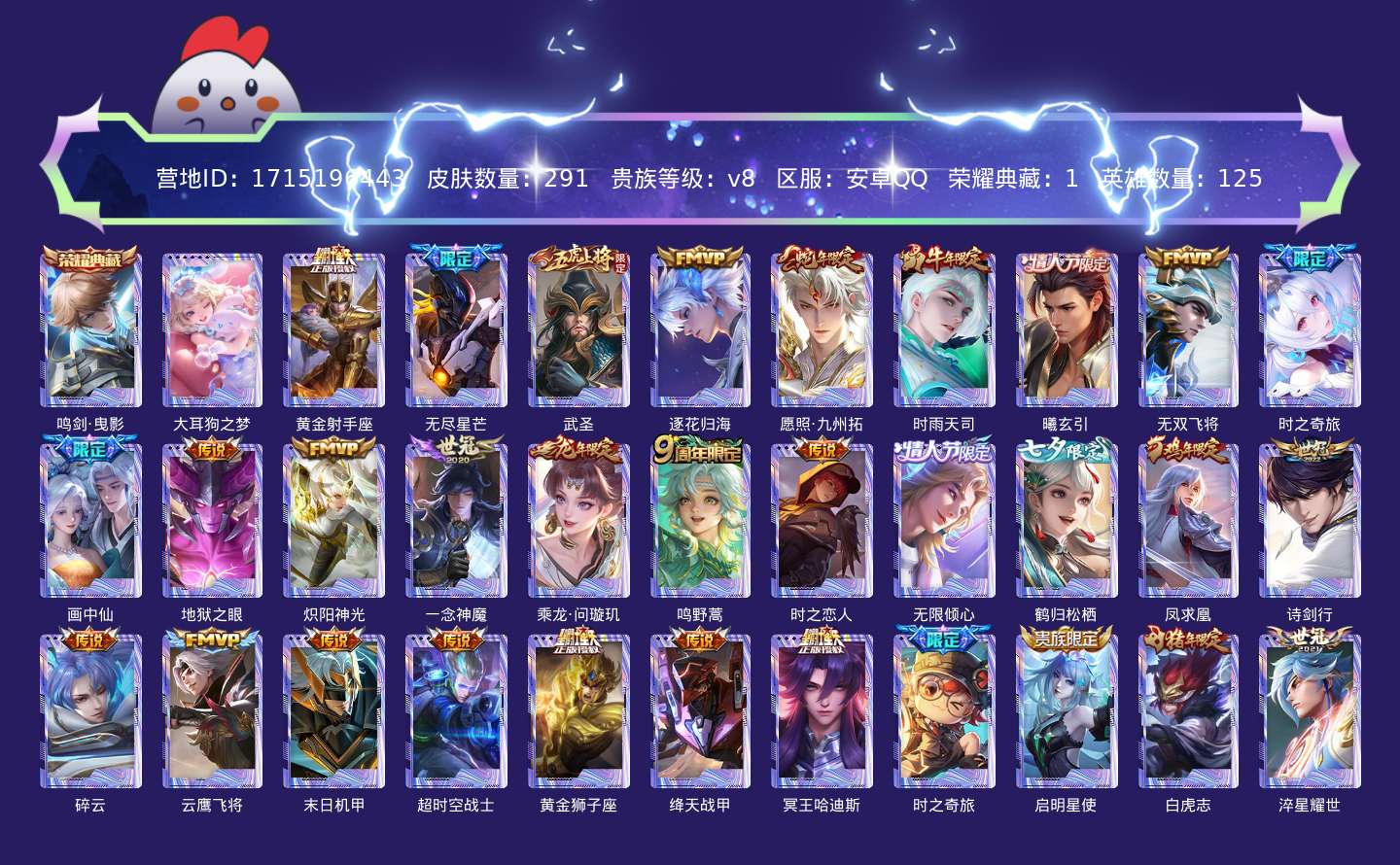 传说品质_后羿_黄金射手座传说品质_后羿_无尽星芒传说品质_关羽_武圣传说品质_澜_逐花归海传说品质_澜_愿照·九州拓传说品质_诸葛亮_时雨天司传说品质_吕布_曦玄引传说品质_马超_无双飞将传说品质_大乔_时之奇旅传说品质_干将莫邪_画中仙传说品质_宫本武藏_地狱之眼传说品质_镜_炽阳神光传说品质_李信_一念神魔传说品质_孙尚香_乘龙·问璇玑传说品质_桑启_鸣野蒿传说品质_刘备_时之恋人传说品质_项羽_无限倾心传说品质_云缨_鹤归松栖传说品质_李白_凤求凰传说品质_李白_诗剑行传说品质_百里守约_碎云传说品质_曜_云鹰飞将传说品质_孙策_末日机甲传说品质_狄仁杰_超时空战士传说品质_达摩_黄金狮子座传说品质_铠_绛天战甲传说品质_铠_冥王哈迪斯传说品质_鲁班七号_时之奇旅传说品质_虞姬_启明星使传说品质_百里玄策_白虎志传说品质_赵云_淬星耀世传说品质_裴擒虎_寅虎·赤拳传说品质_王昭君_乞巧织情