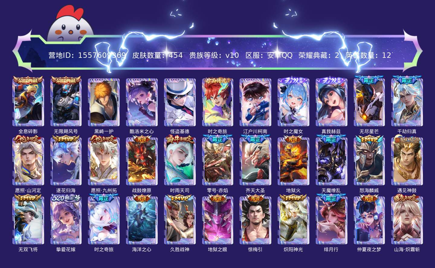 贵族等级:v10皮肤数:454情人节限定4 传说品质57 生肖限定13 荣耀典藏2 珍品传说5 无双2 英雄数:127