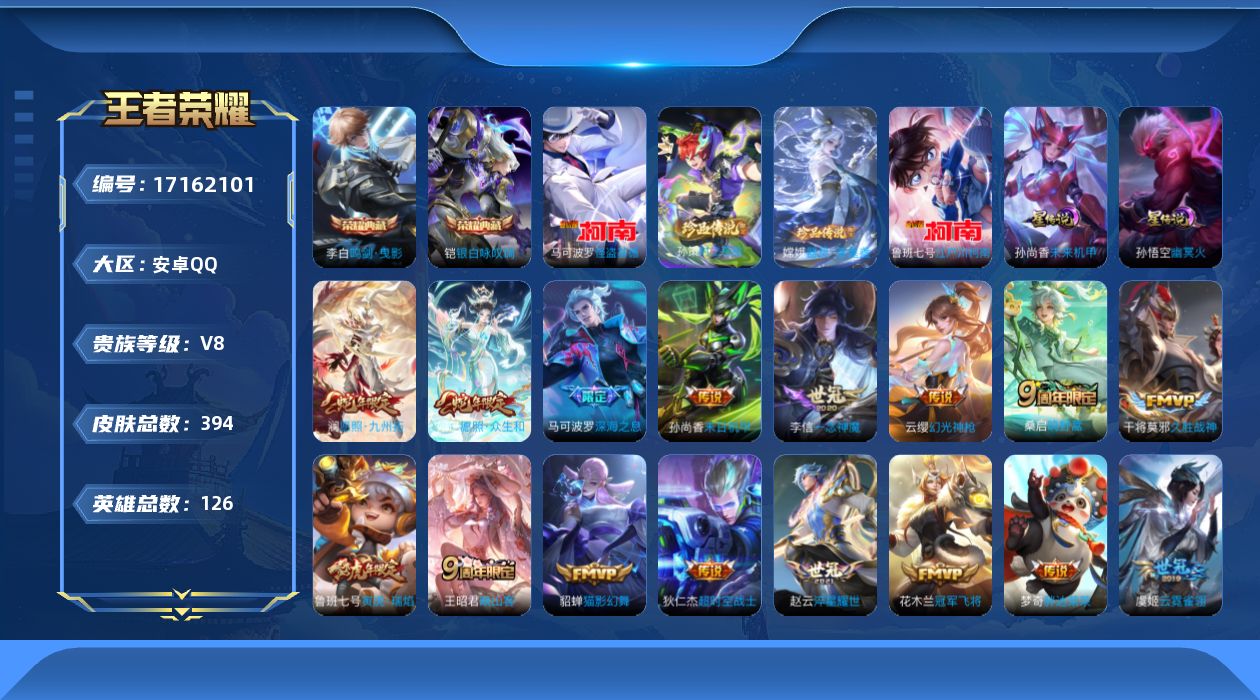 贵族等级:v8皮肤数:394传说品质19 生肖限定7 情人节限定3 珍品传说4 荣耀典藏2 英雄数:126