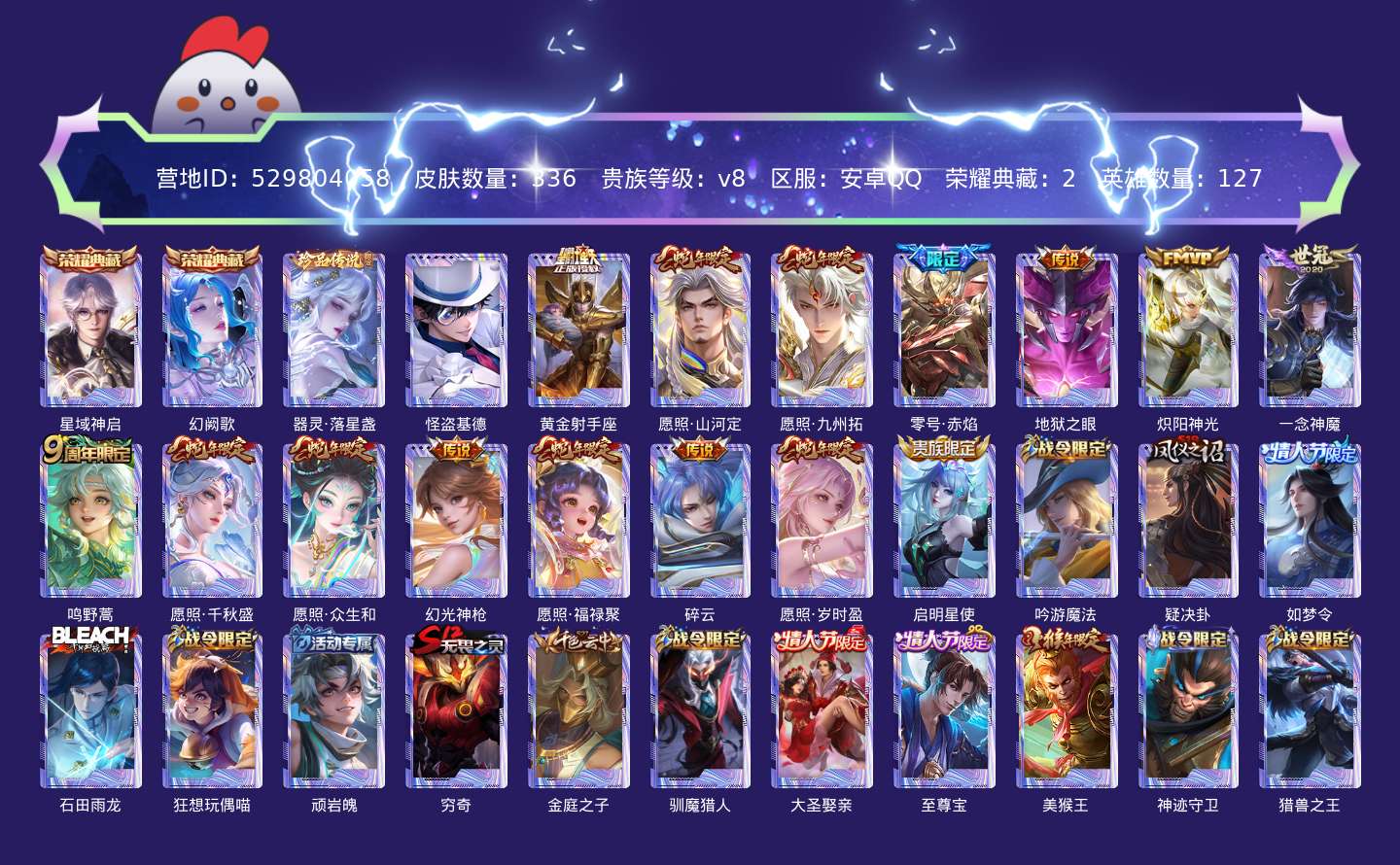 贵族等级:v8皮肤数:336传说品质15 情人节限定4 生肖限定11 荣耀典藏2 珍品传说2 英雄数:127