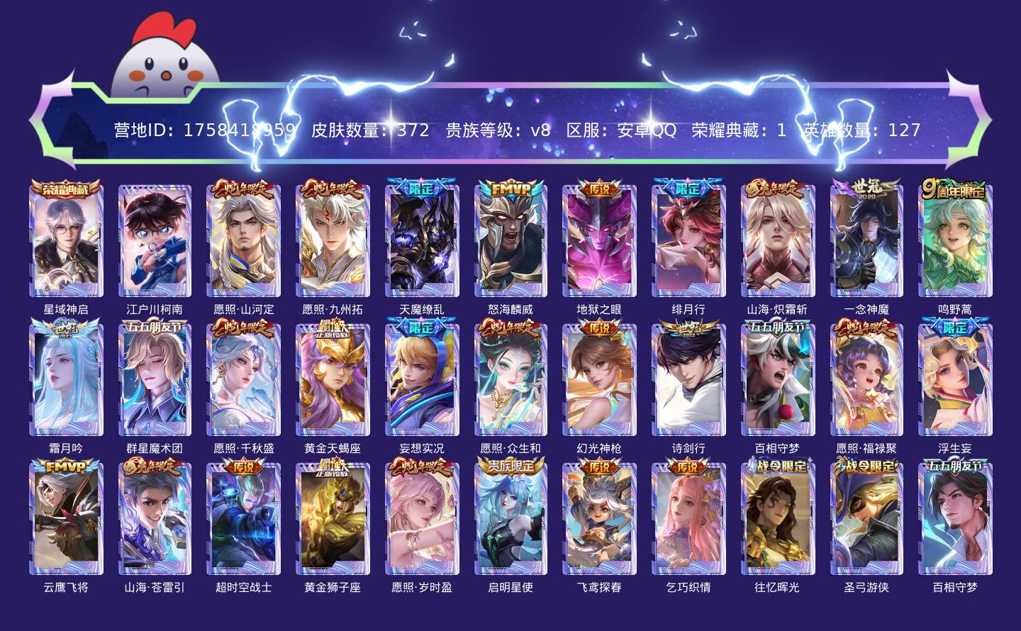 传说品质_司空震_愿照·山河定传说品质_澜_愿照·九州拓传说品质_吕布_天魔缭乱传说品质_吕布_怒海麟威传说品质_宫本武藏_地狱之眼传说品质_不知火舞_绯月行传说品质_李信_一念神魔传说品质_李信_山海·炽霜斩传说品质_桑启_鸣野蒿传说品质_露娜_霜月吟传说品质_云中君_群星魔术团传说品质_女娲_愿照·千秋盛传说品质_墨子_黄金天蝎座传说品质_马可波罗_妄想实况传说品质_妲己_愿照·众生和传说品质_云缨_幻光神枪传说品质_李白_诗剑行传说品质_张飞_百相守梦传说品质_蔡文姬_愿照·福禄聚传说品质_夏洛特_浮生妄传说品质_曜_云鹰飞将传说品质_曜_山海·苍雷引传说品质_狄仁杰_超时空战士传说品质_达摩_黄金狮子座传说品质_虞姬_愿照·岁时盈传说品质_虞姬_启明星使传说品质_李元芳_飞鸢探春传说品质_王昭君_乞巧织情