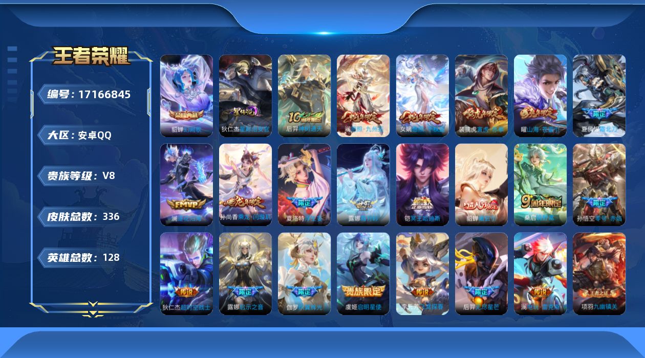 贵族等级:v8皮肤数:336情人节限定4 传说品质22 生肖限定6 荣耀典藏1 英雄数:128