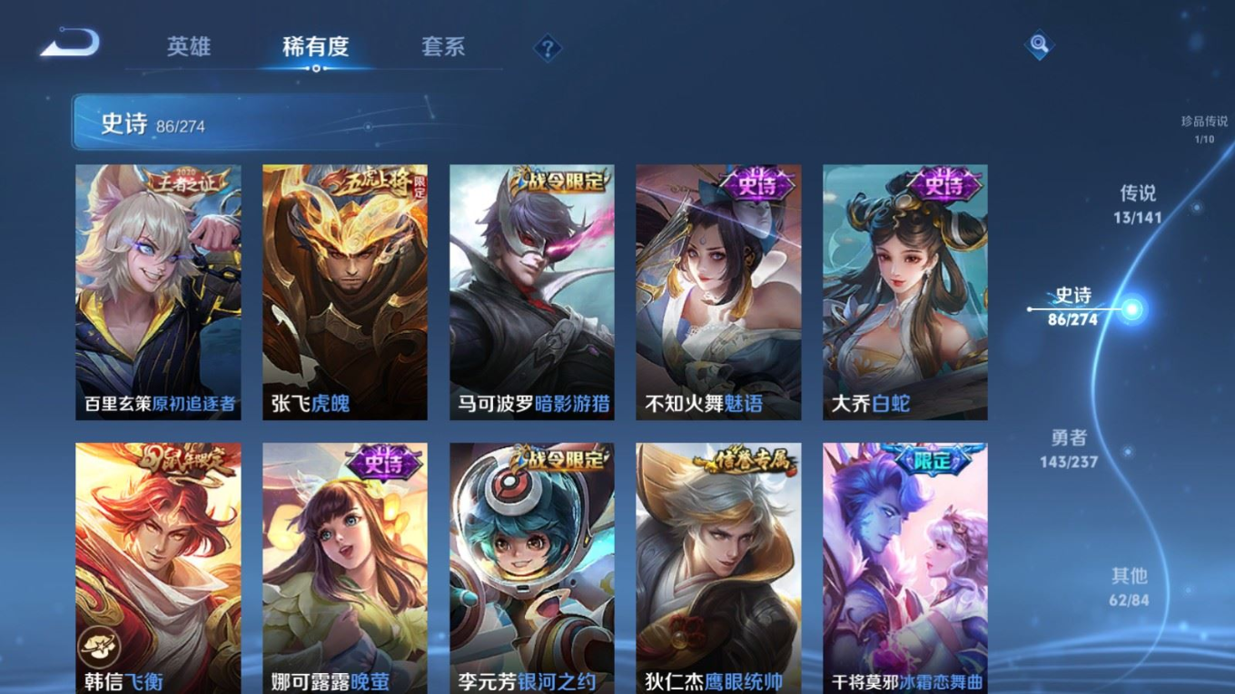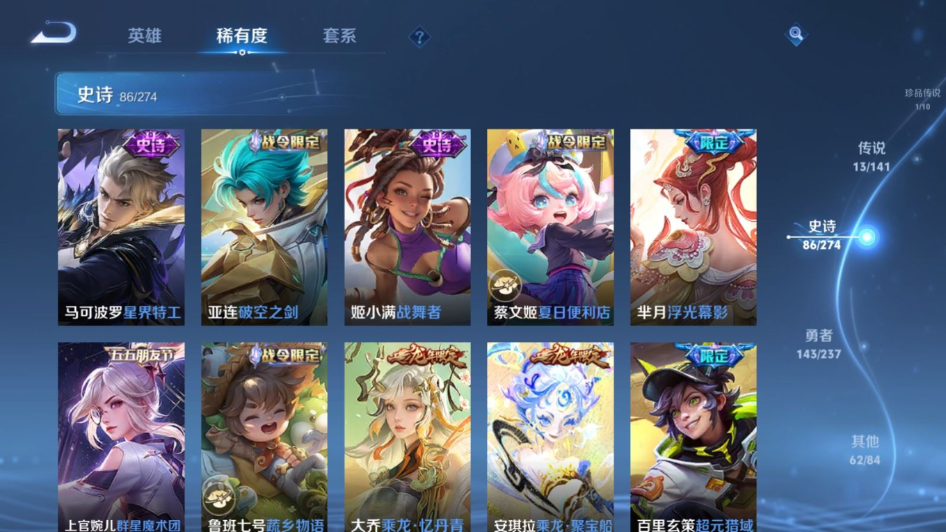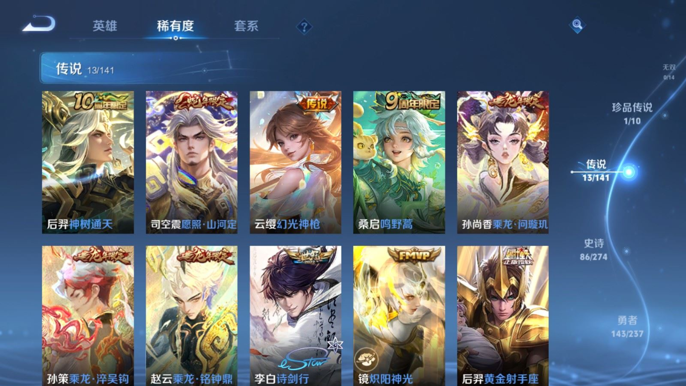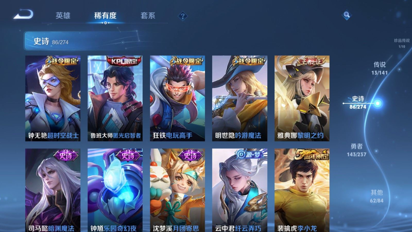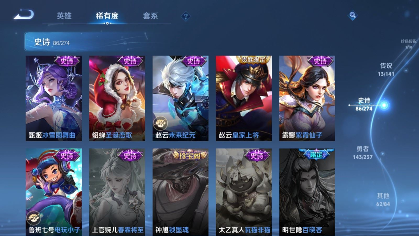 贵族等级:v7皮肤数:306传说品质13 荣耀典藏1 生肖限定8 情人节限定1 珍品传说1 英雄数:126