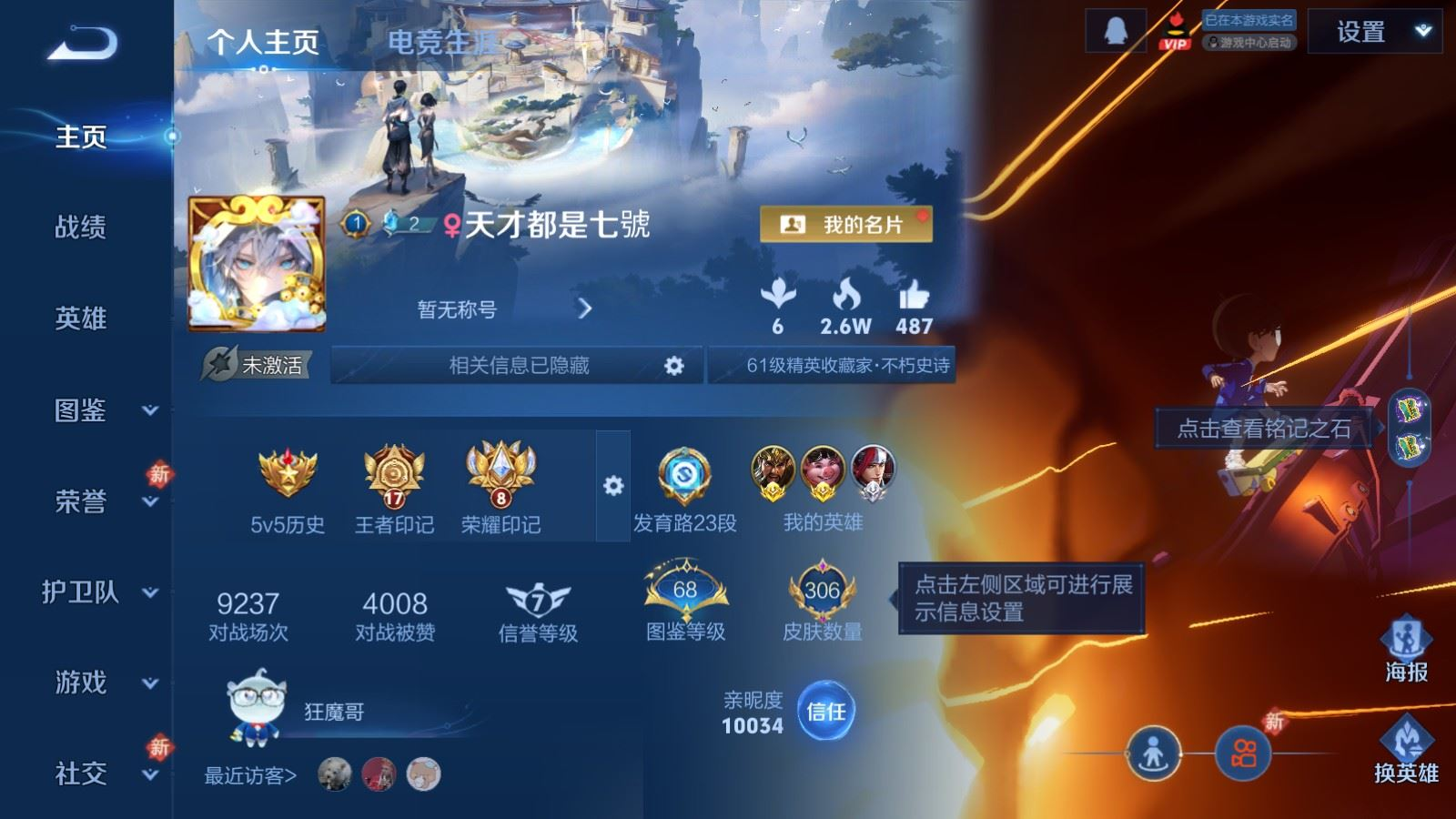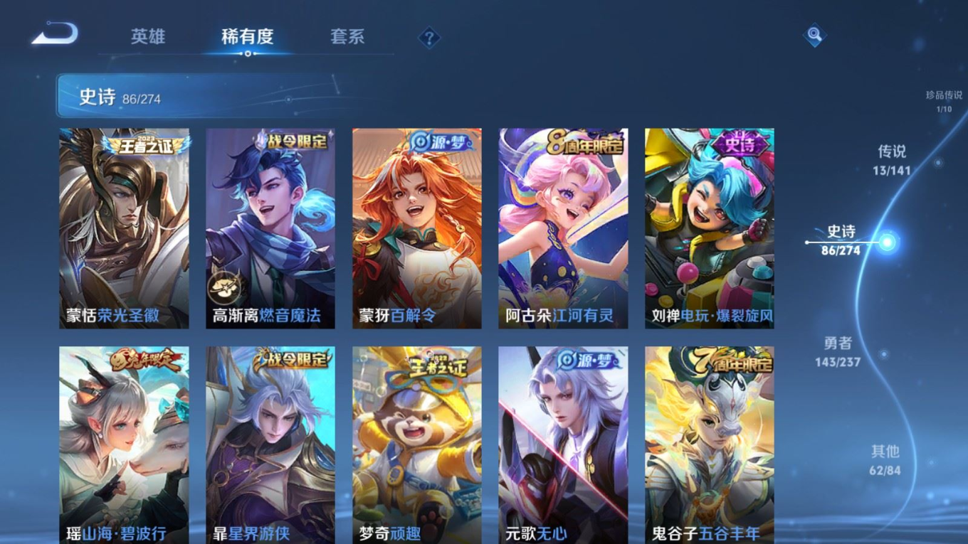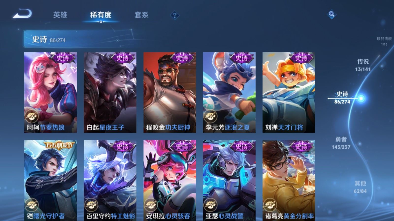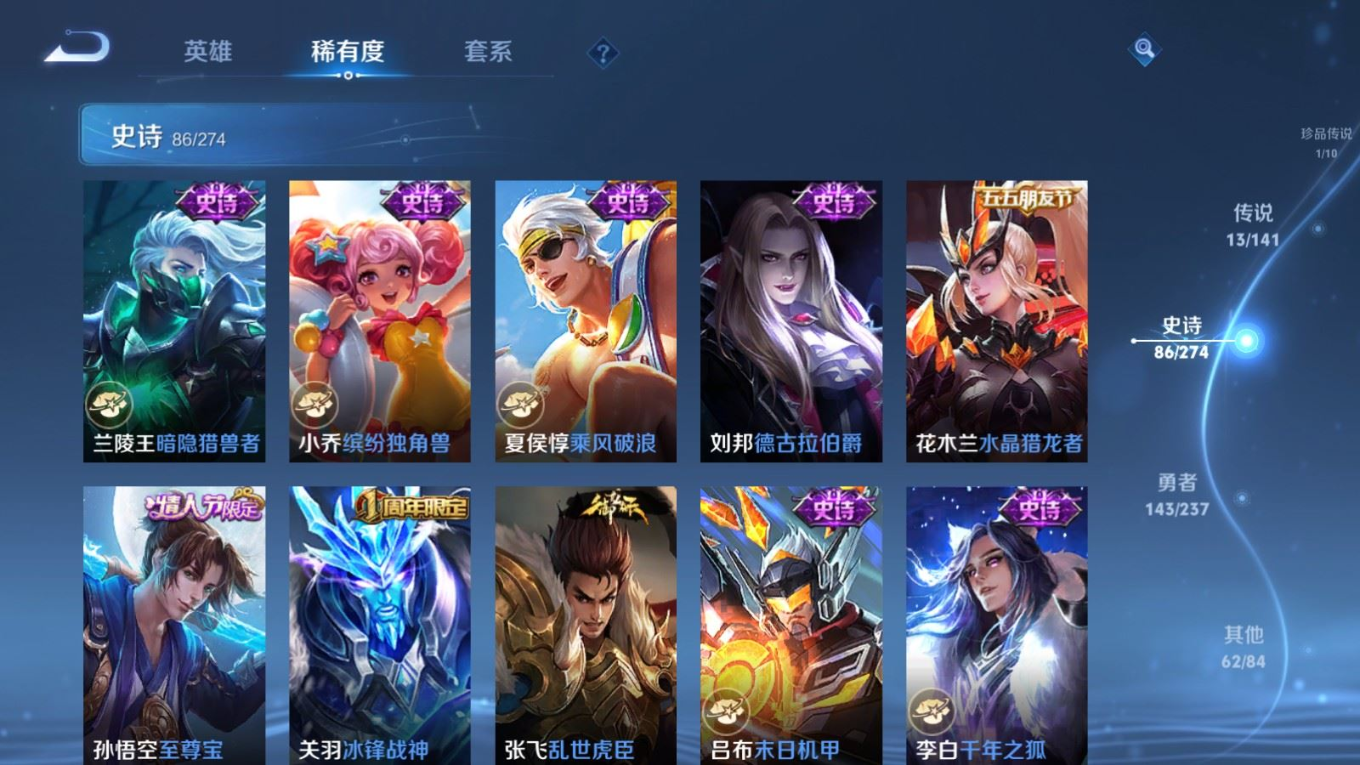 贵族等级:v7皮肤数:306传说品质13 荣耀典藏1 生肖限定8 情人节限定1 珍品传说1 英雄数:126