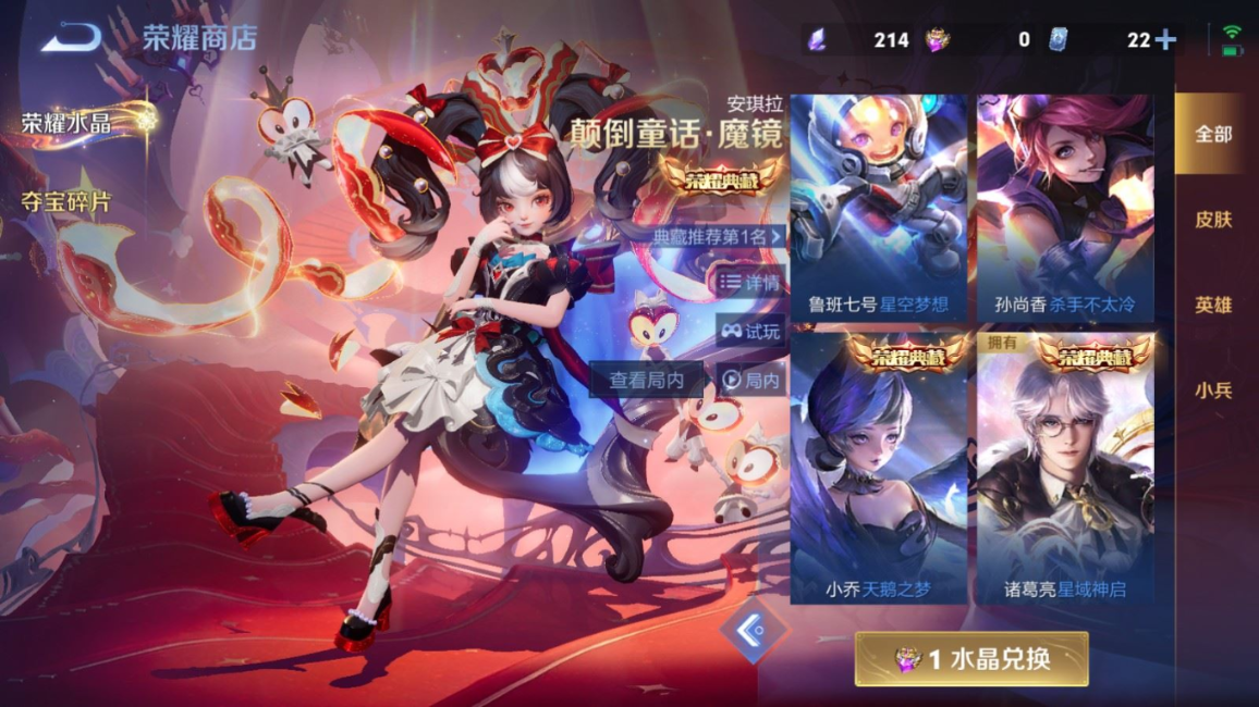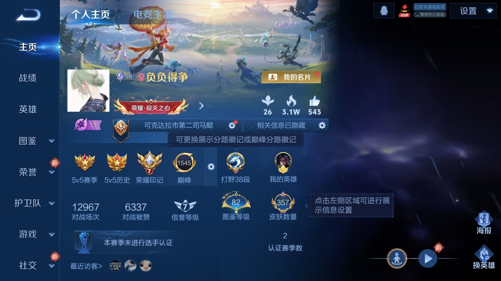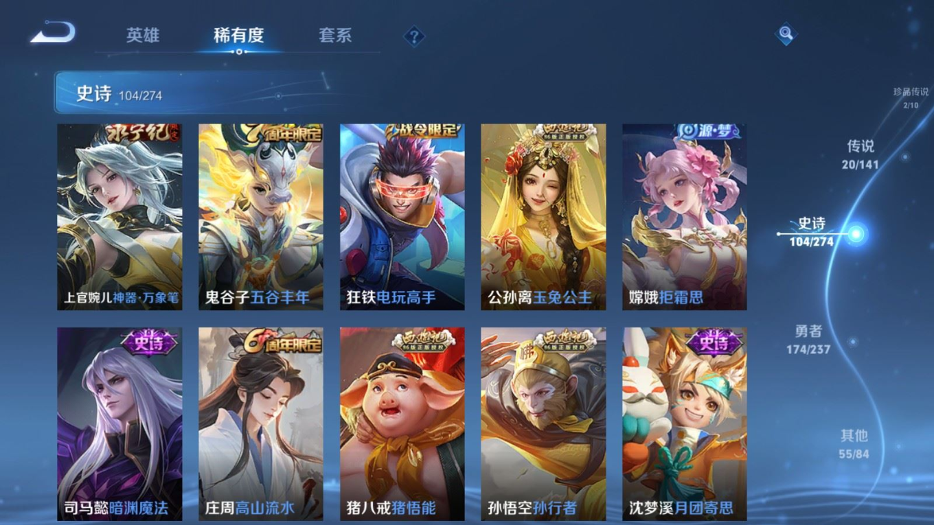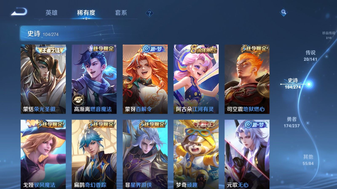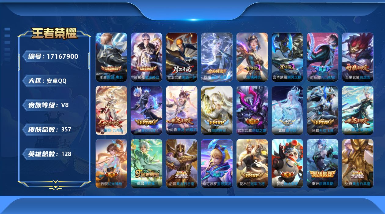 贵族等级:v8皮肤数:357传说品质20 生肖限定7 荣耀典藏2 珍品传说2 英雄数:128