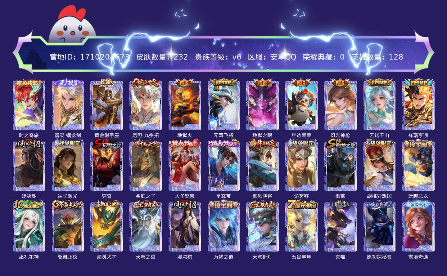贵族等级:v6皮肤数:240传说品质10 生肖限定2 情人节限定2 荣耀典藏1 无双1 珍品传说1 英雄数:128
