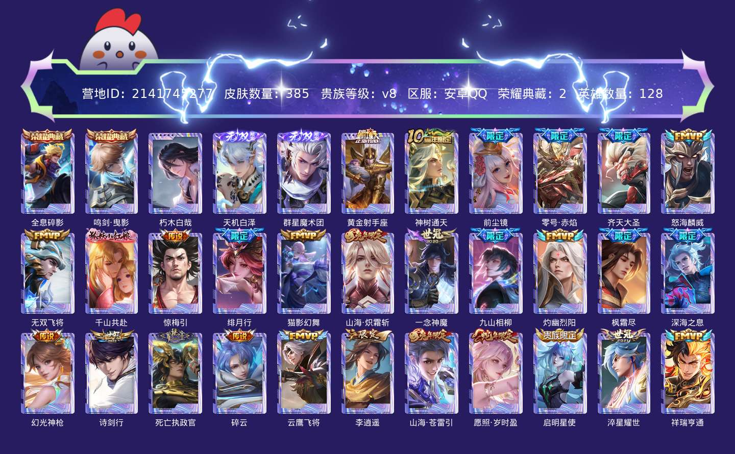 传说品质_后羿_黄金射手座传说品质_后羿_神树通天传说品质_娜可露露_前尘镜传说品质_孙悟空_零号·赤焰传说品质_孙悟空_齐天大圣传说品质_吕布_怒海麟威传说品质_马超_无双飞将传说品质_干将莫邪_千山共赴传说品质_宫本武藏_惊梅引传说品质_不知火舞_绯月行传说品质_貂蝉_猫影幻舞传说品质_李信_一念神魔传说品质_李信_山海·炽霜斩传说品质_司马懿_九山相柳传说品质_东皇太一_灼幽烈阳传说品质_橘右京_枫霜尽传说品质_马可波罗_深海之息传说品质_云缨_幻光神枪传说品质_云缨_神骥·越千峰传说品质_李白_诗剑行传说品质_大司命_死亡执政官传说品质_百里守约_碎云传说品质_曜_云鹰飞将传说品质_曜_李逍遥 传说品质_曜_山海·苍雷引传说品质_虞姬_愿照·岁时盈传说品质_虞姬_启明星使传说品质_赵云_淬星耀世传说品质_裴擒虎_祥瑞亨通