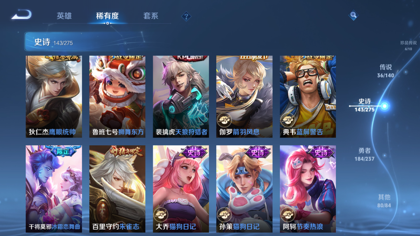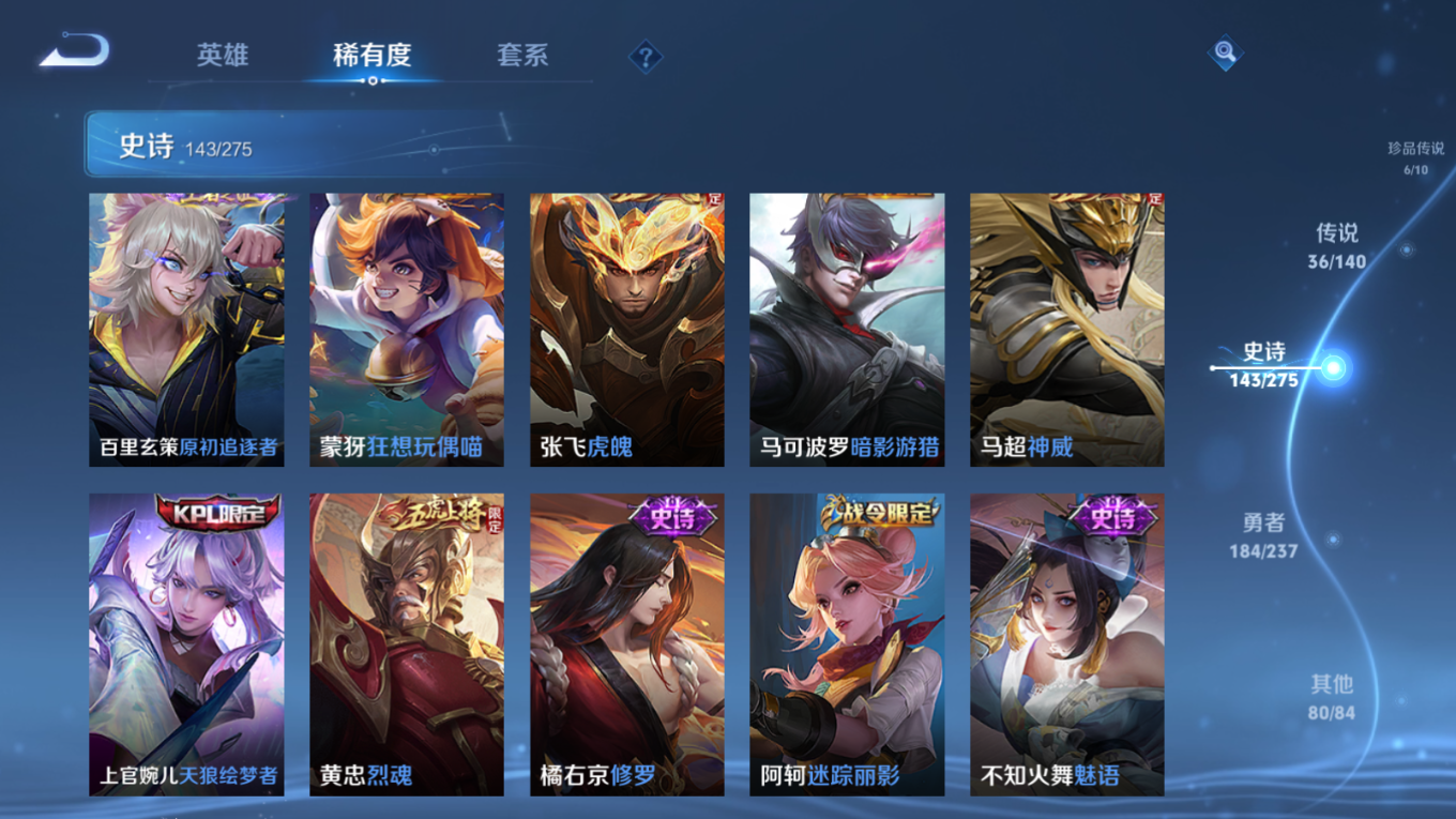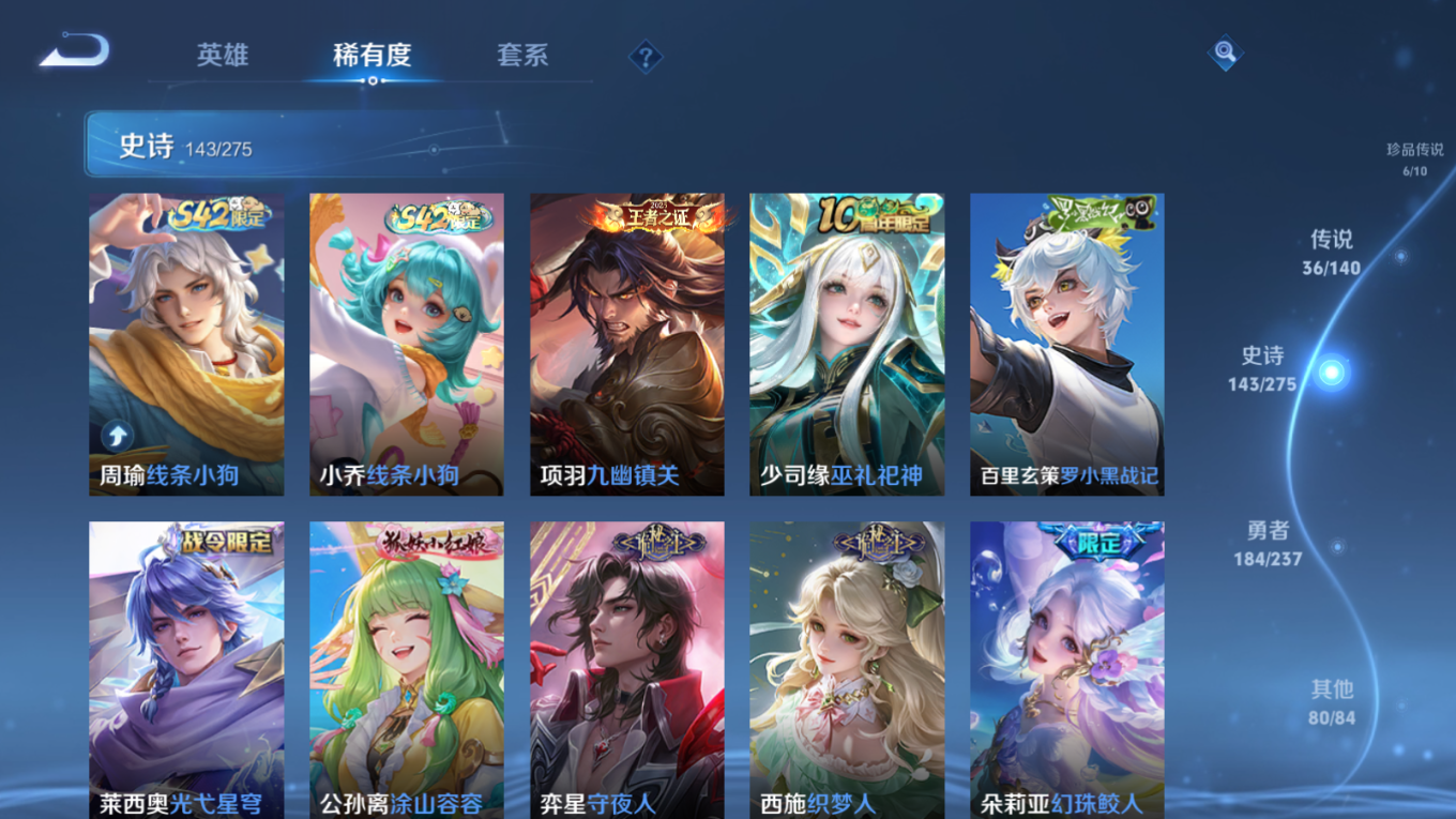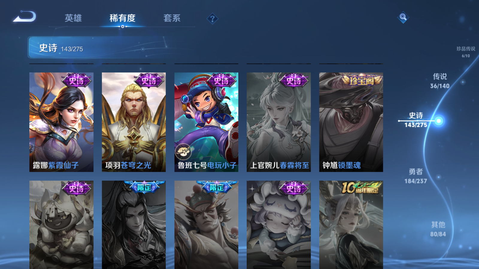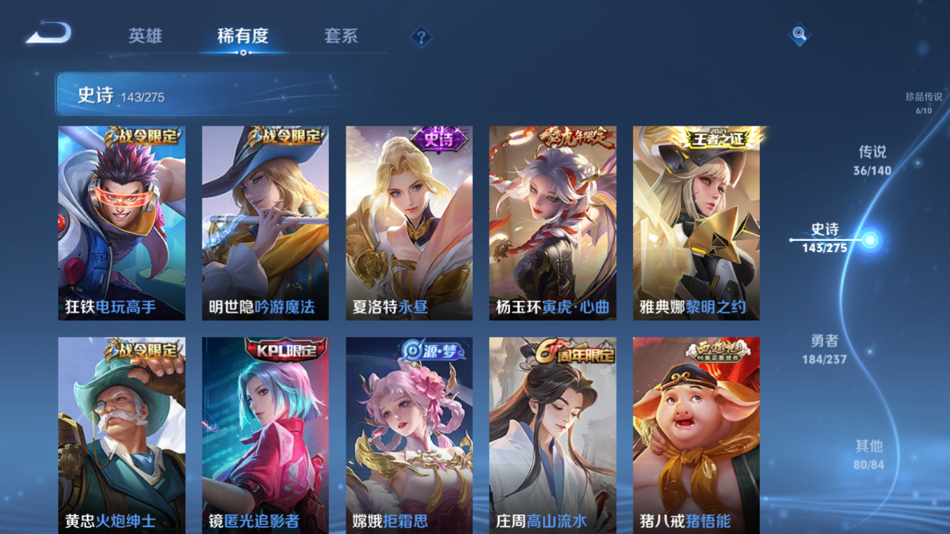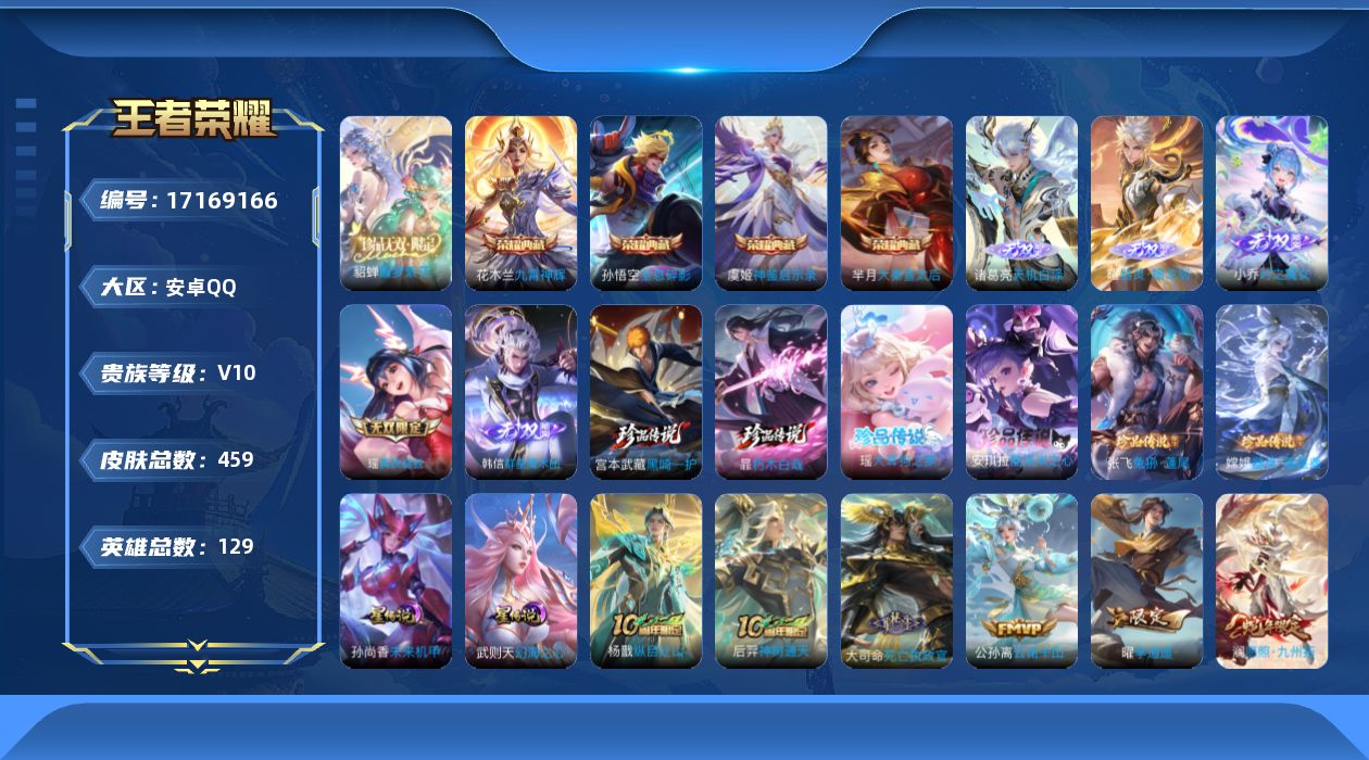 贵族等级:v10皮肤数:459生肖限定16 传说品质36 无双5 荣耀典藏4 珍品传说6 珍品无双1 英雄数:129