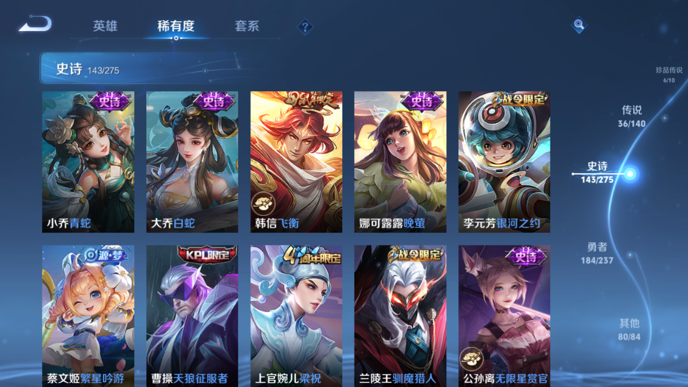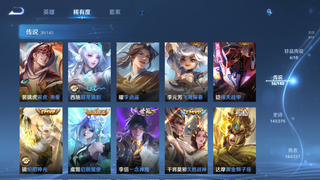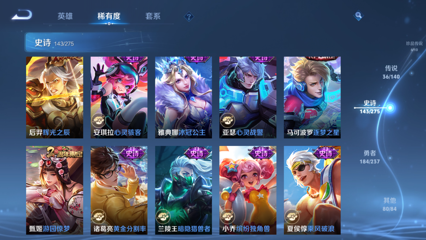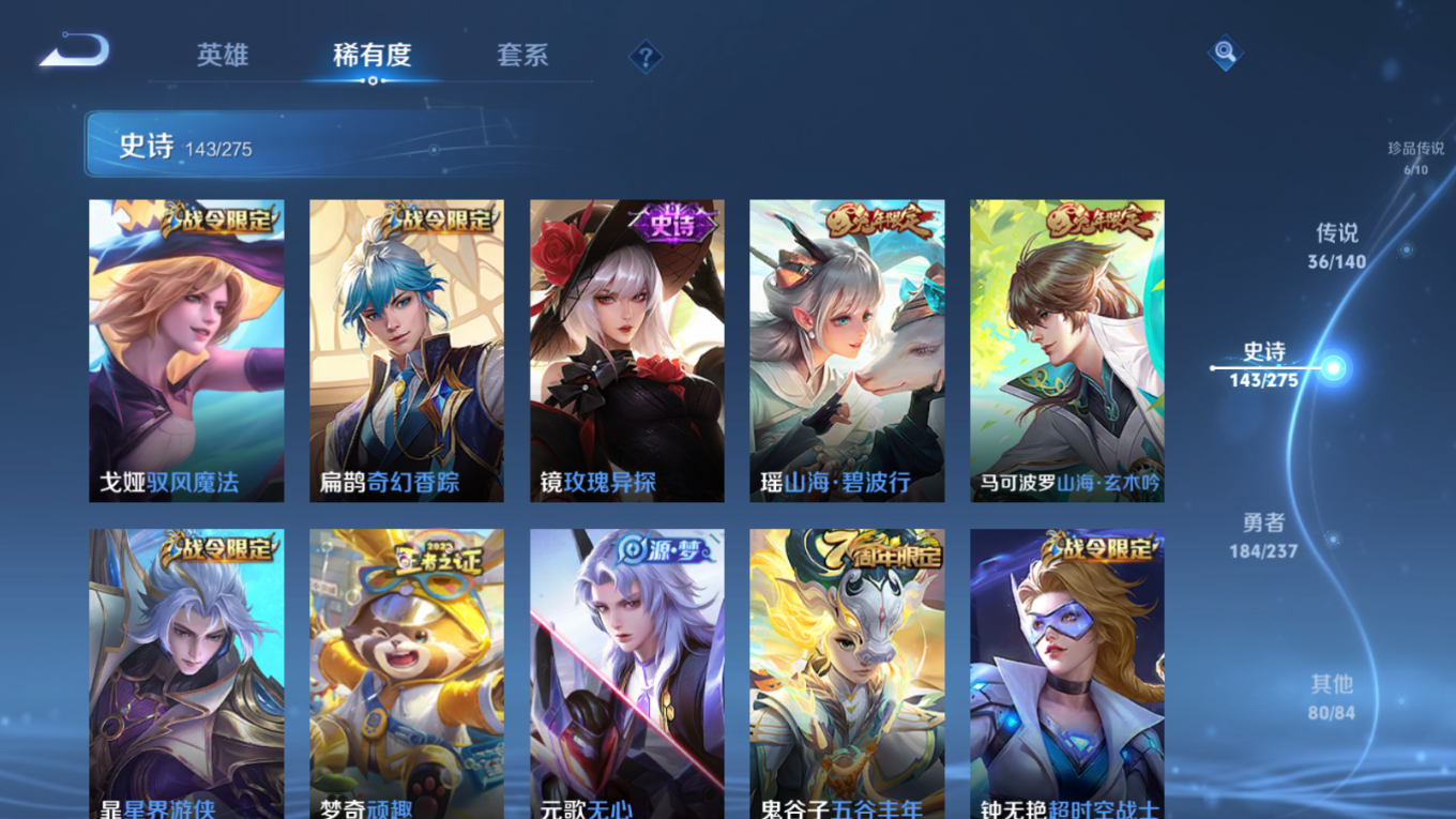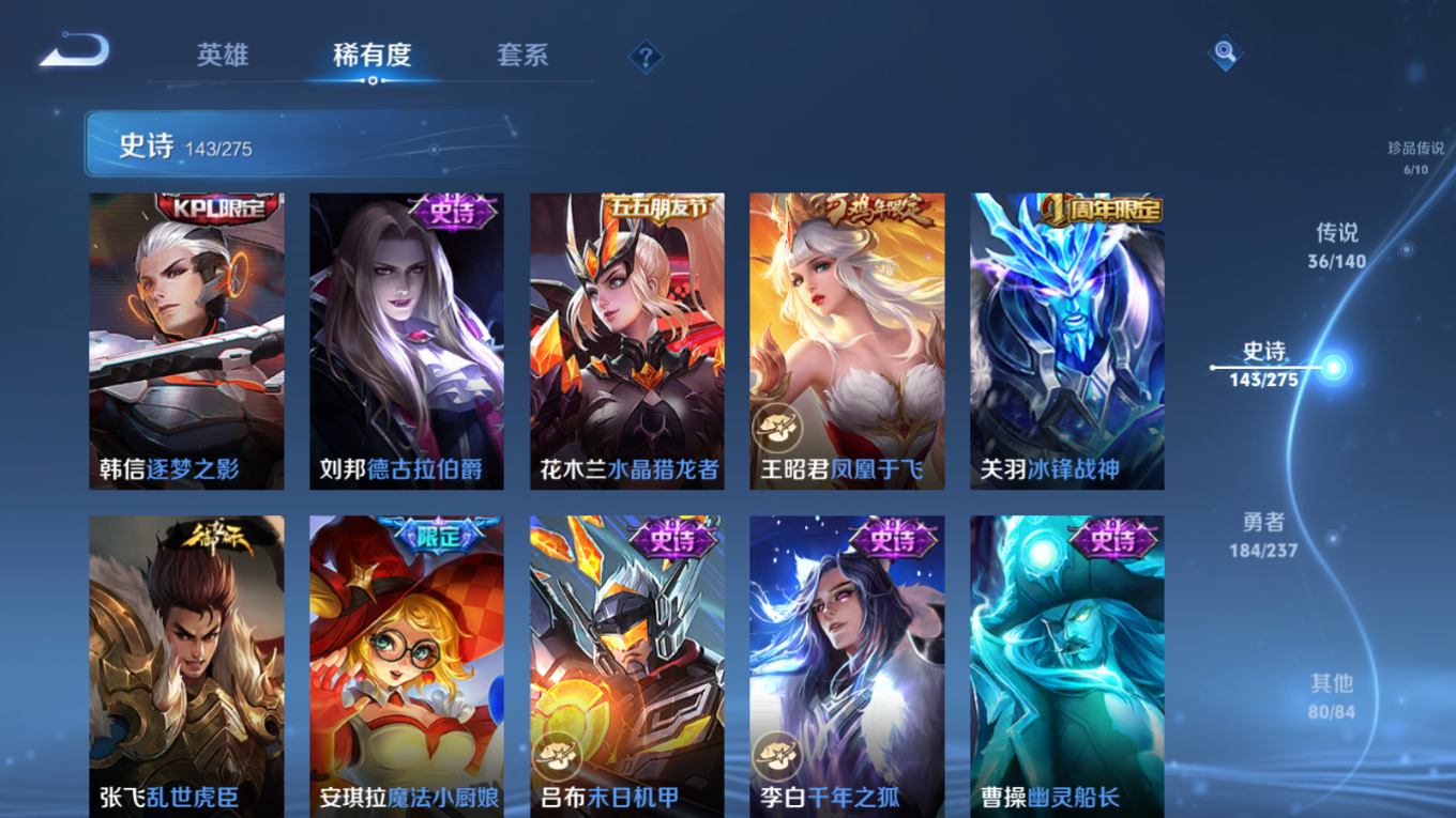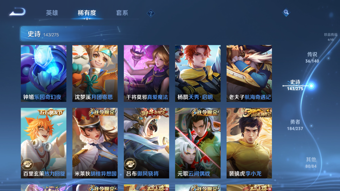 贵族等级:v10皮肤数:459生肖限定16 传说品质36 无双5 荣耀典藏4 珍品传说6 珍品无双1 英雄数:129