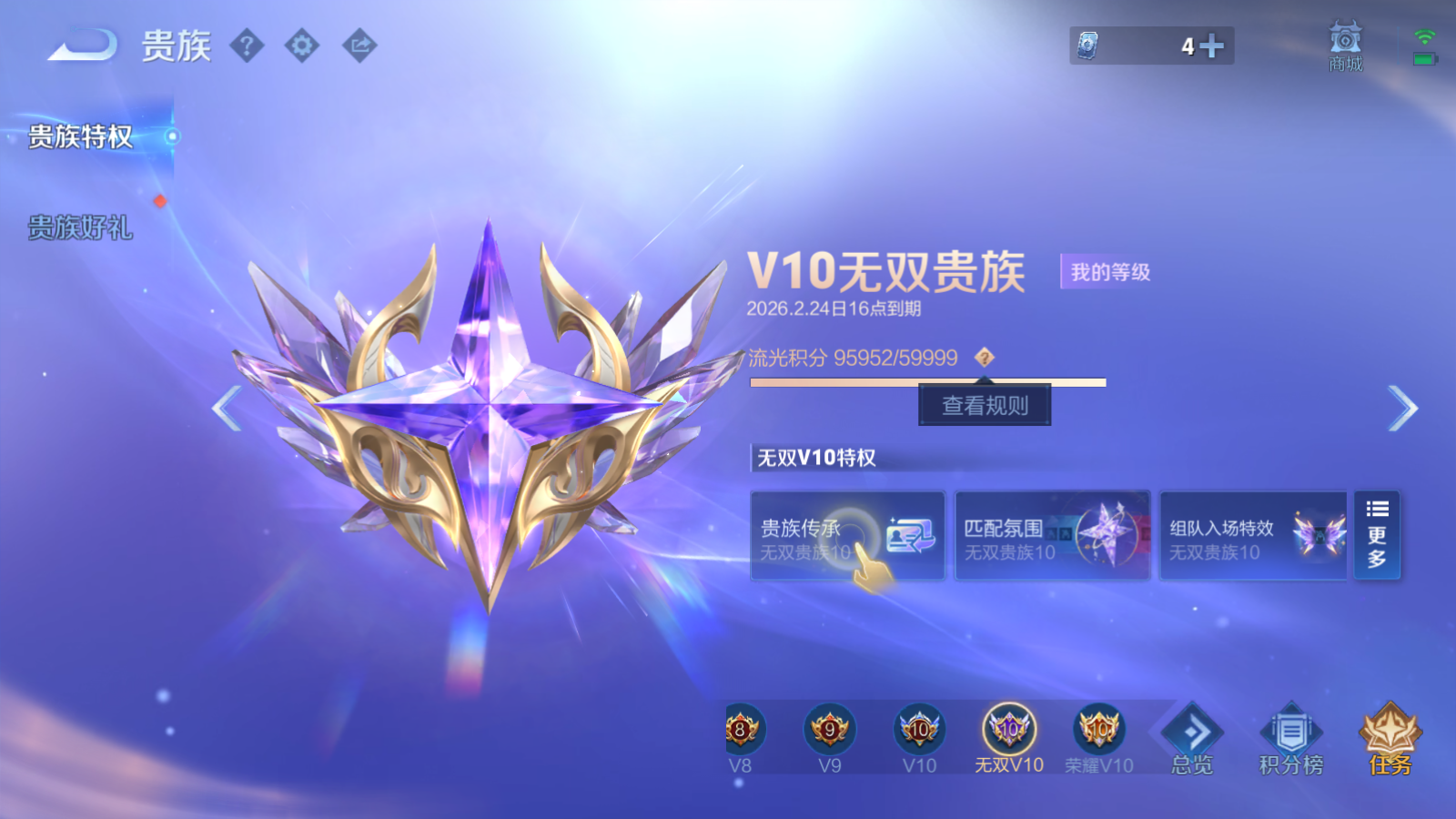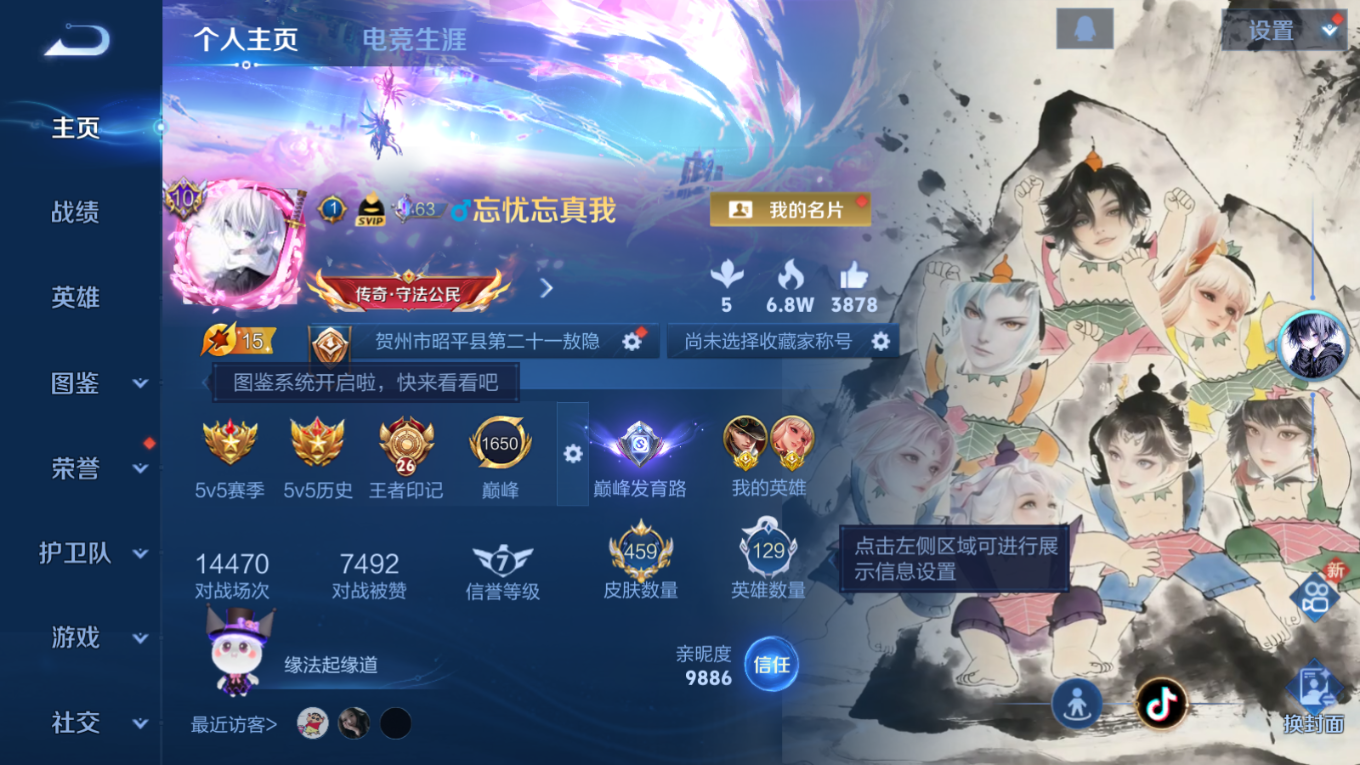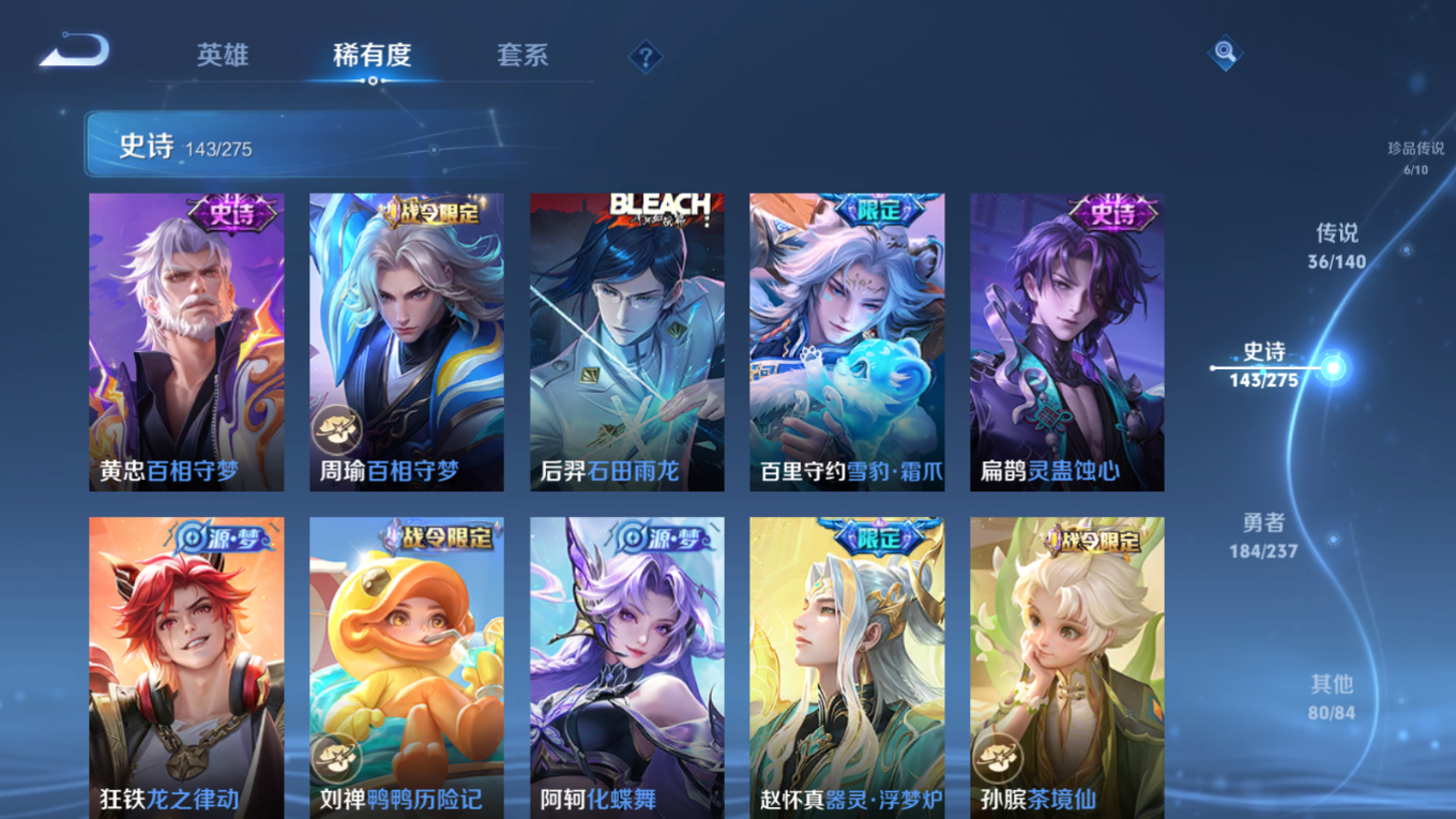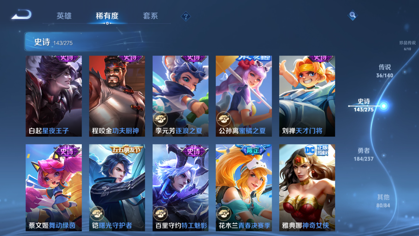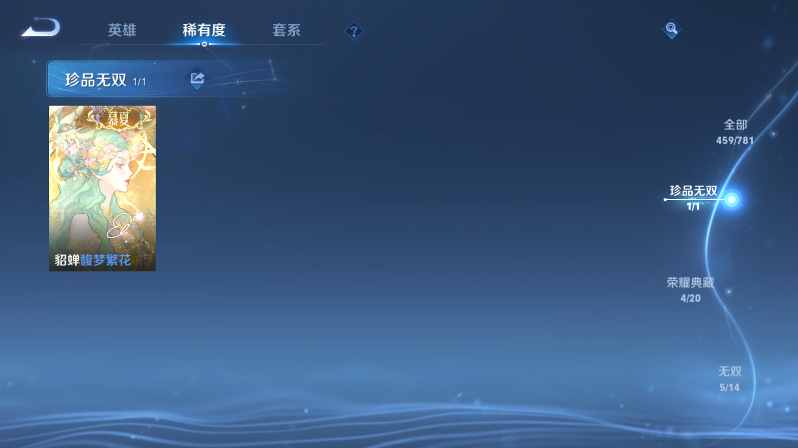贵族等级:v10皮肤数:459生肖限定16 传说品质36 无双5 荣耀典藏4 珍品传说6 珍品无双1 英雄数:129