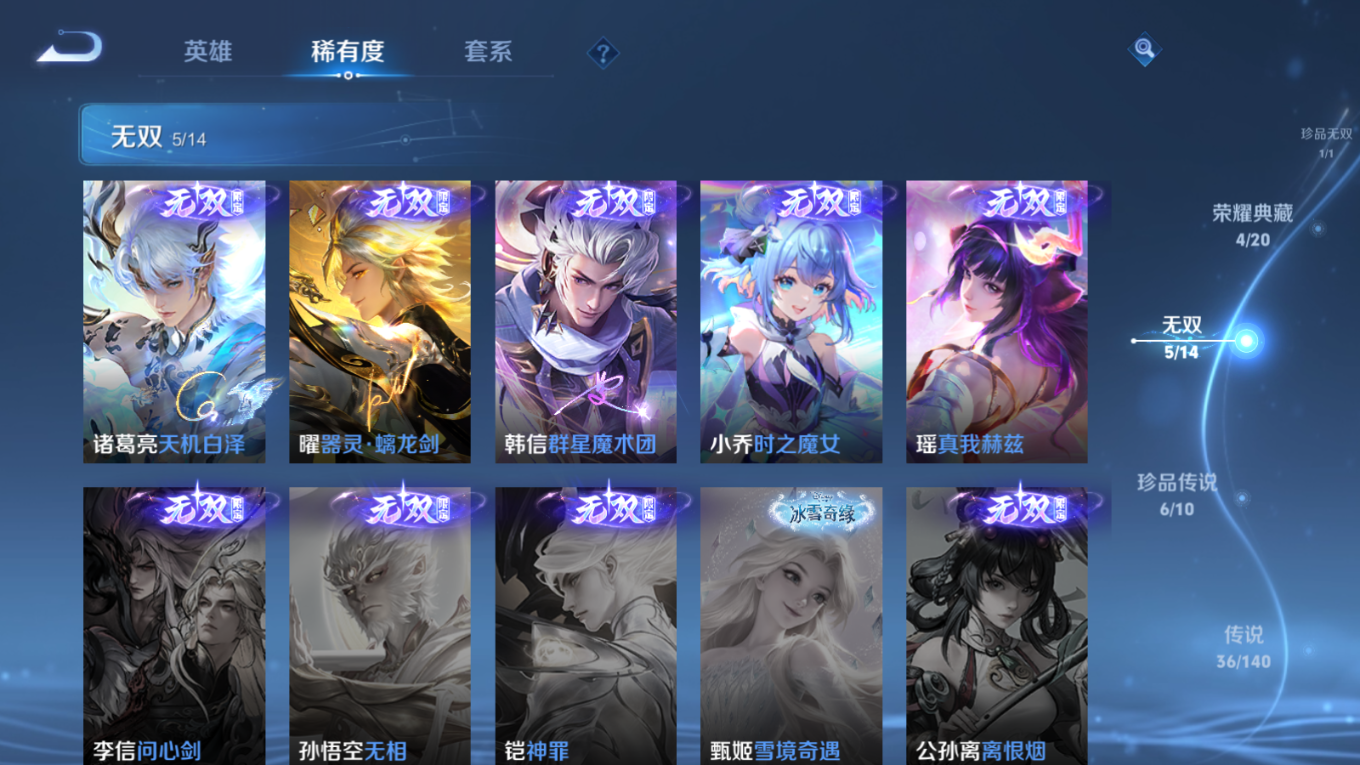 无双_诸葛亮_天机白泽无双_小乔_时之魔女无双_瑶_真我赫兹无双_曜_器灵·螭龙剑无双_韩信_群星魔术团