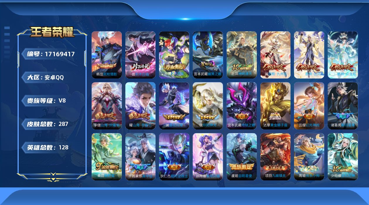 贵族等级:v8皮肤数:288传说品质17 生肖限定9 珍品传说2 荣耀典藏1 英雄数:128