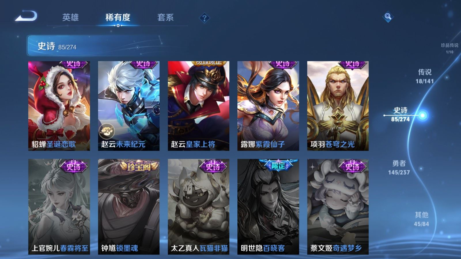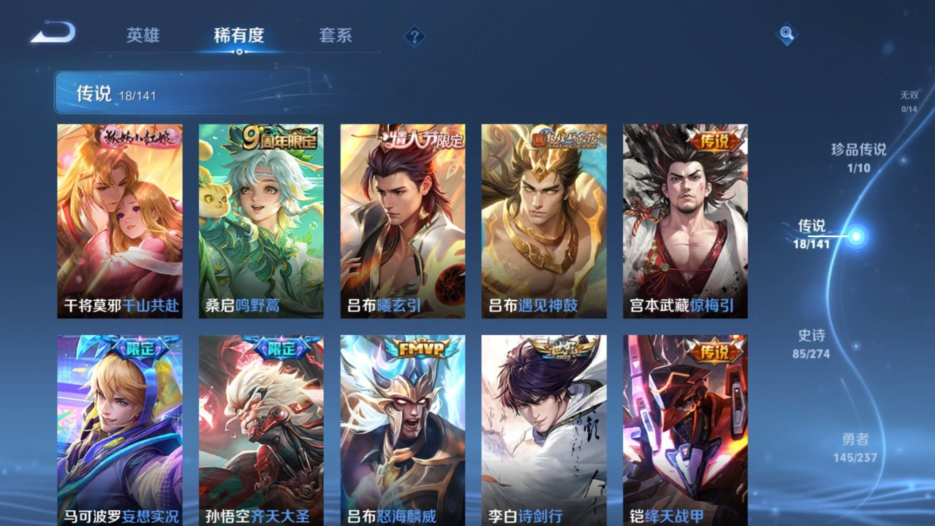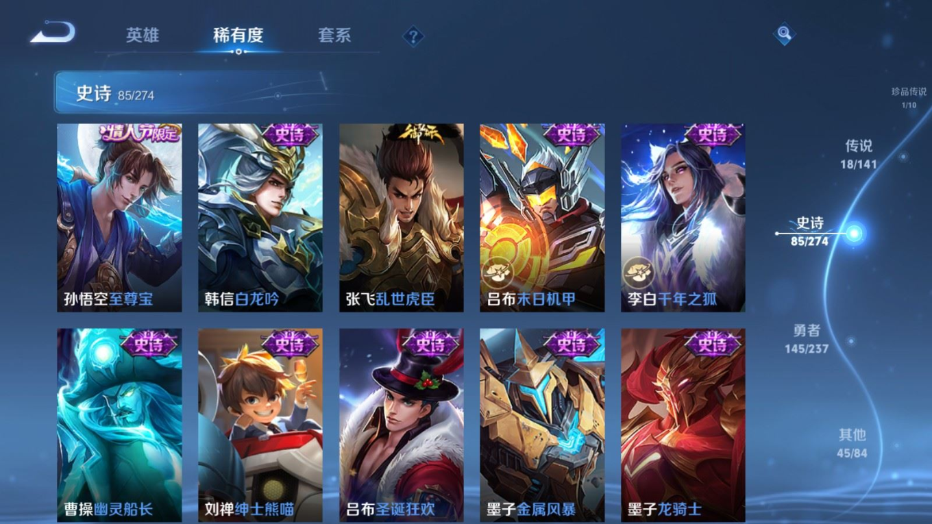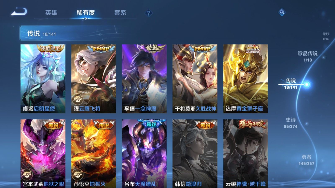贵族等级:v8皮肤数:295情人节限定3 传说品质18 生肖限定1 荣耀典藏1 珍品传说1 英雄数:127