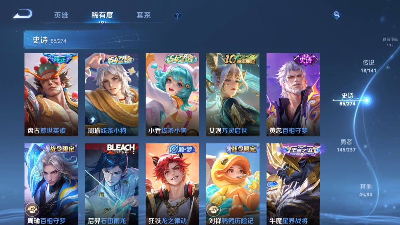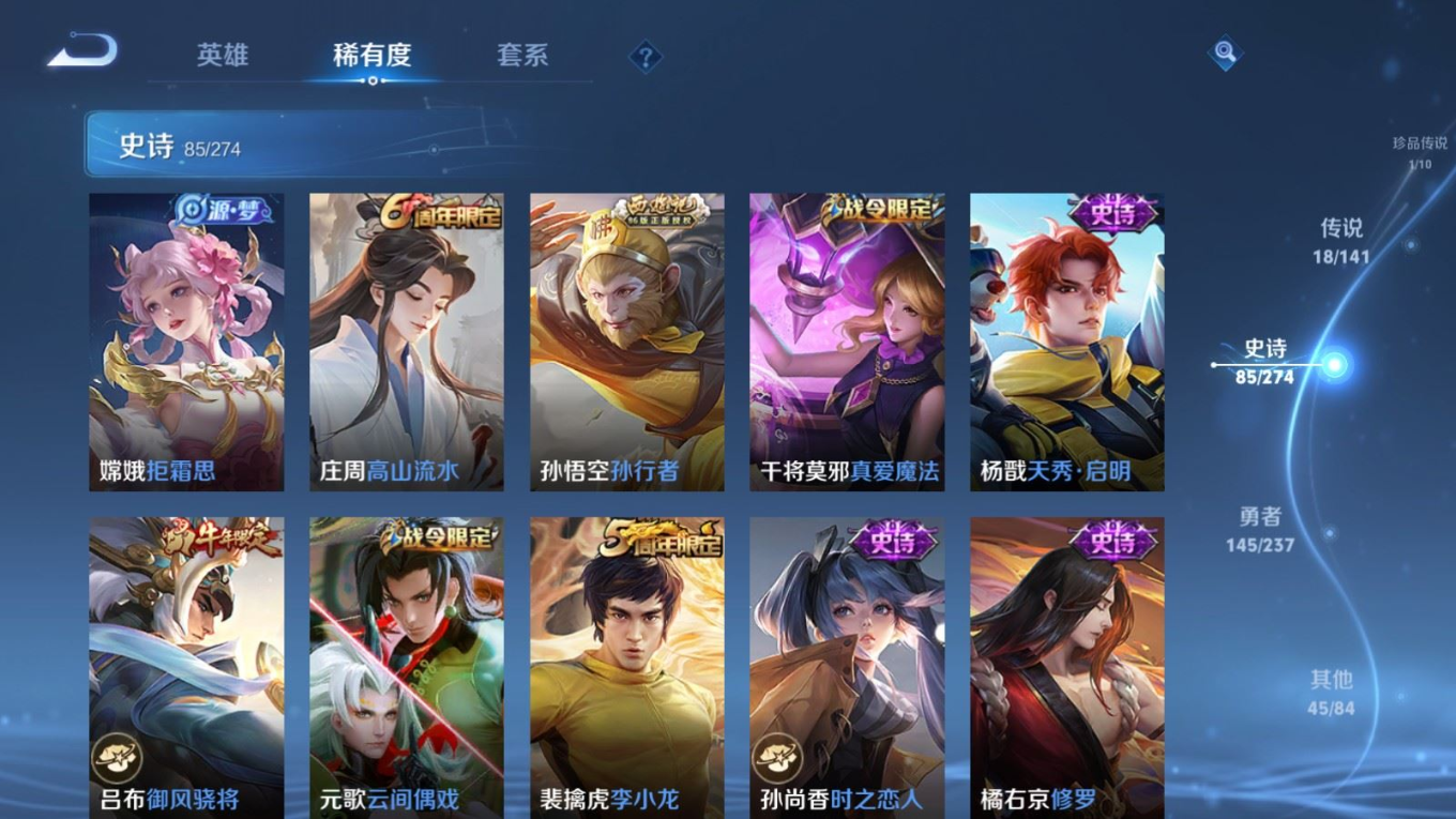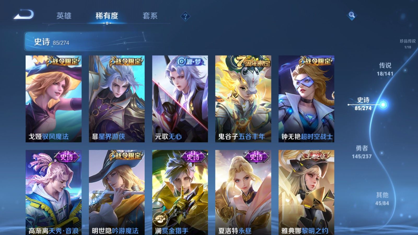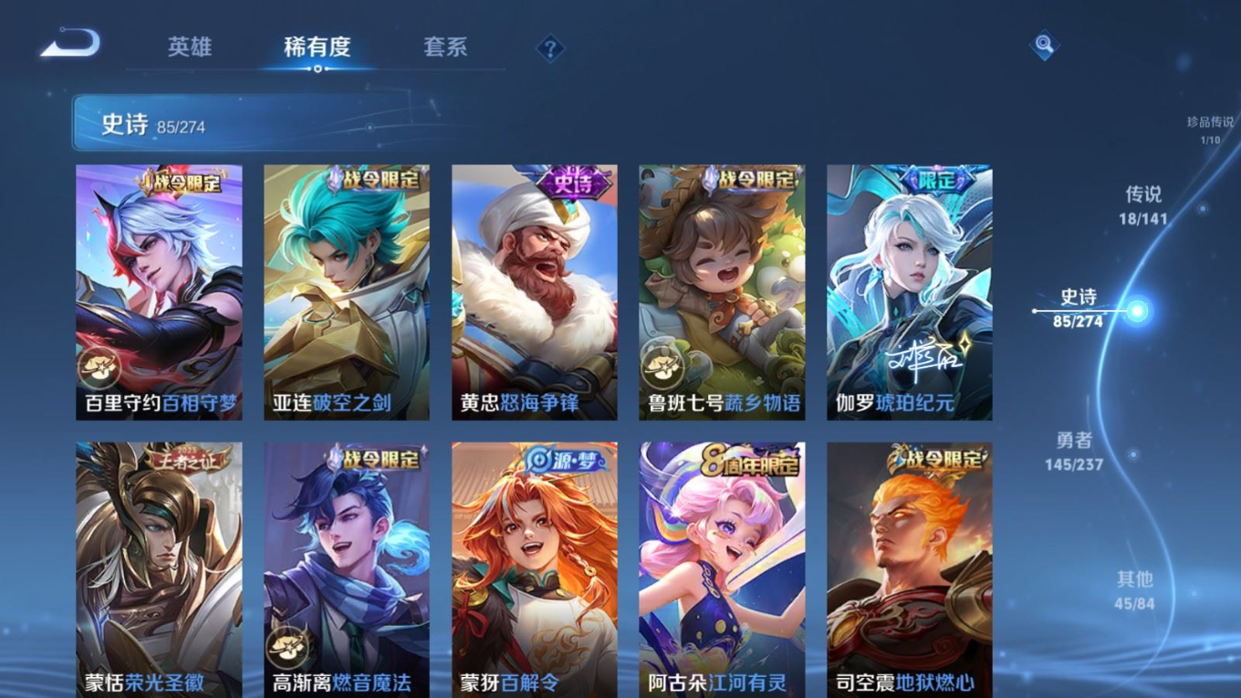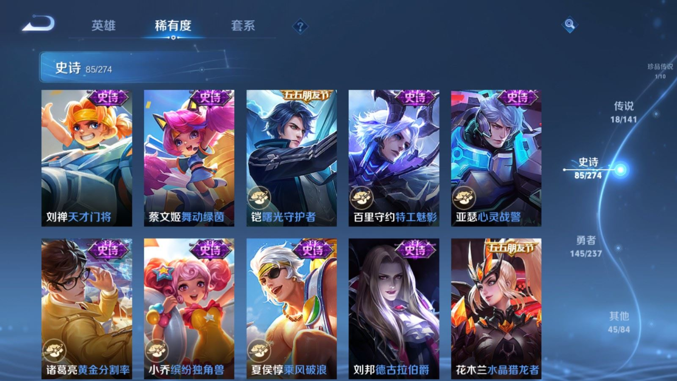 贵族等级:v8皮肤数:295情人节限定3 传说品质18 生肖限定1 荣耀典藏1 珍品传说1 英雄数:127