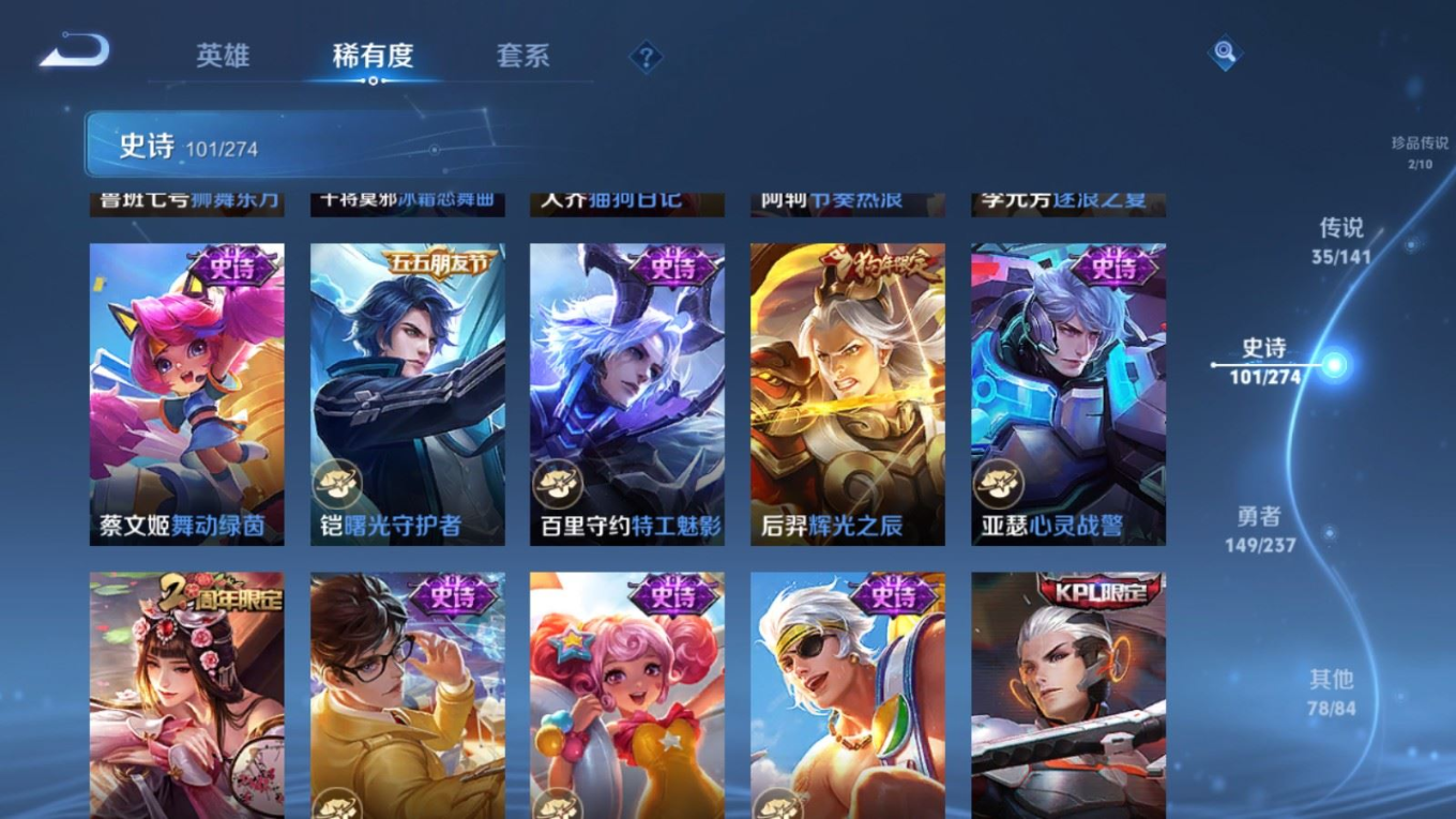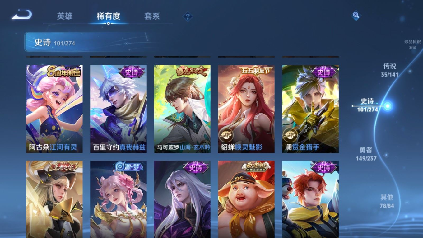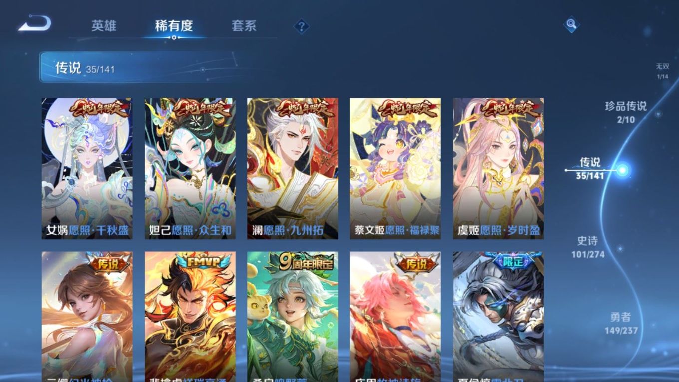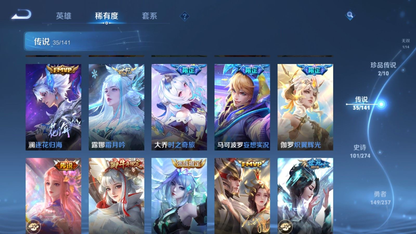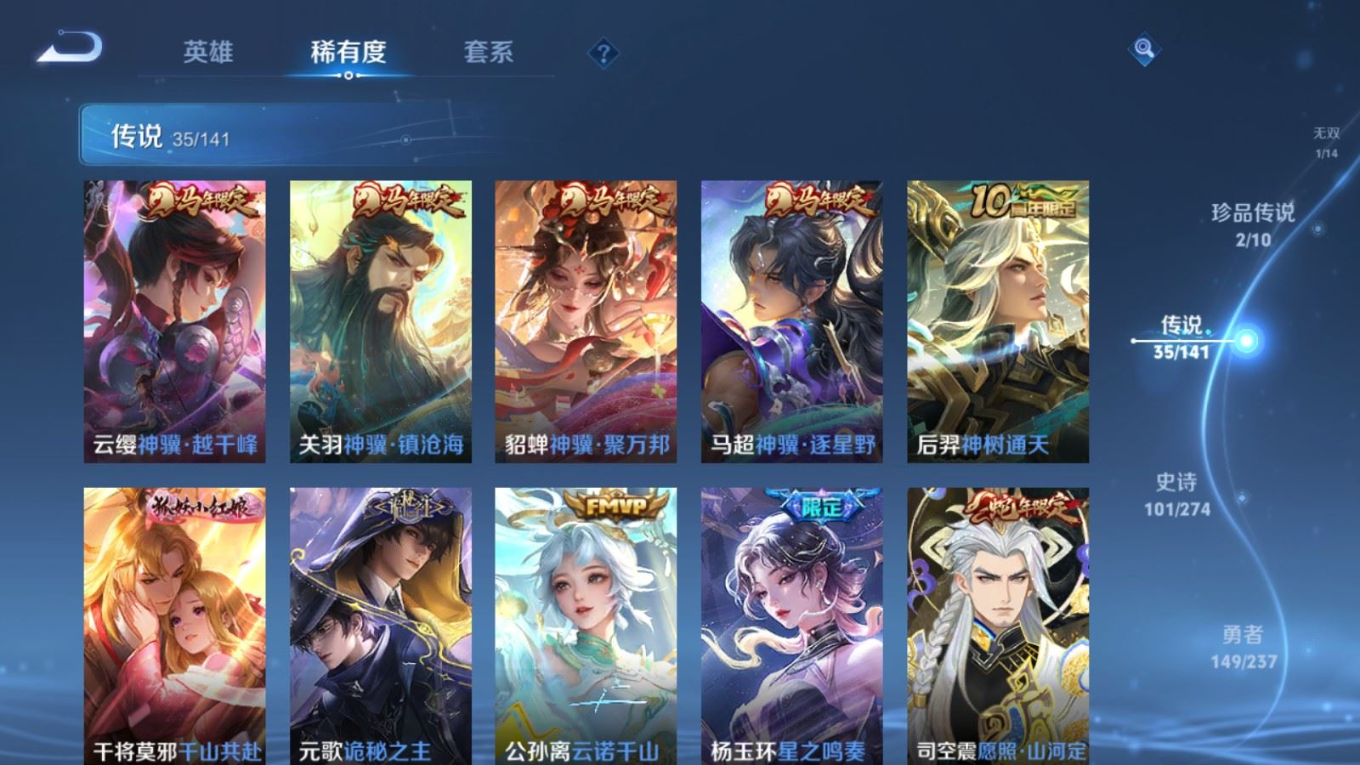 传说品质_后羿_黄金射手座传说品质_后羿_神树通天传说品质_关羽_神骥·镇沧海传说品质_司空震_愿照·山河定传说品质_澜_逐花归海传说品质_澜_愿照·九州拓传说品质_马超_神骥·逐星野传说品质_大乔_时之奇旅传说品质_干将莫邪_千山共赴传说品质_干将莫邪_久胜战神传说品质_宫本武藏_地狱之眼传说品质_元歌_诡秘之主传说品质_貂蝉_神骥·聚万邦传说品质_孙尚香_末日机甲传说品质_夏侯惇_霜北刀传说品质_庄周_牧神诗旅传说品质_桑启_鸣野蒿传说品质_露娜_霜月吟传说品质_女娲_愿照·千秋盛传说品质_杨玉环_星之鸣奏传说品质_马可波罗_妄想实况传说品质_妲己_愿照·众生和传说品质_云缨_幻光神枪传说品质_云缨_神骥·越千峰传说品质_蔡文姬_愿照·福禄聚传说品质_公孙离_祈雪灵祝传说品质_公孙离_云诺千山传说品质_伽罗_炽翼辉光传说品质_狄仁杰_超时空战士传说品质_虞姬_云霓雀翎传说品质_虞姬_愿照·岁时盈传说品质_虞姬_启明星使传说品质_百里玄策_白虎志传说品质_裴擒虎_祥瑞亨通传说品质_王昭君_乞巧织情