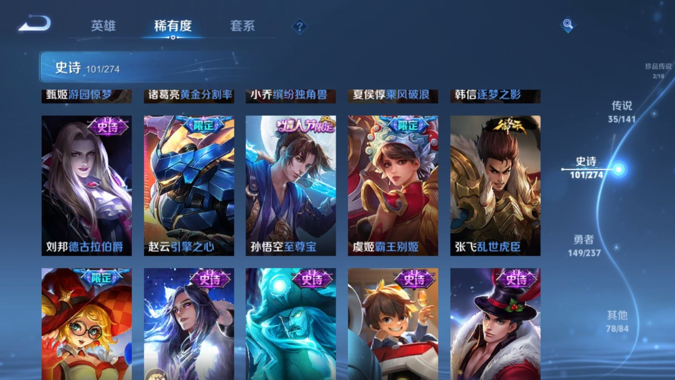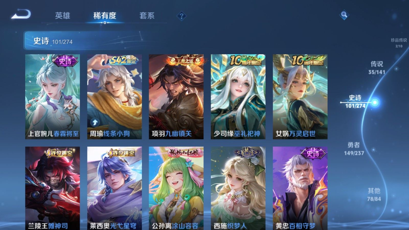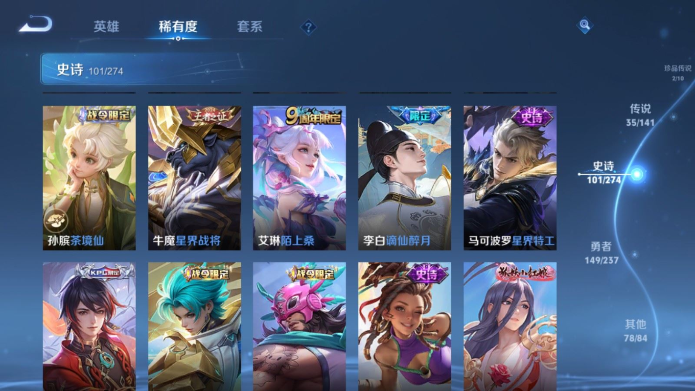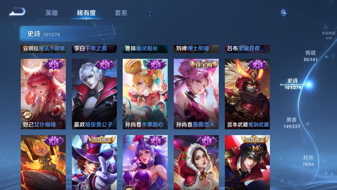 传说品质_后羿_黄金射手座传说品质_后羿_神树通天传说品质_关羽_神骥·镇沧海传说品质_司空震_愿照·山河定传说品质_澜_逐花归海传说品质_澜_愿照·九州拓传说品质_马超_神骥·逐星野传说品质_大乔_时之奇旅传说品质_干将莫邪_千山共赴传说品质_干将莫邪_久胜战神传说品质_宫本武藏_地狱之眼传说品质_元歌_诡秘之主传说品质_貂蝉_神骥·聚万邦传说品质_孙尚香_末日机甲传说品质_夏侯惇_霜北刀传说品质_庄周_牧神诗旅传说品质_桑启_鸣野蒿传说品质_露娜_霜月吟传说品质_女娲_愿照·千秋盛传说品质_杨玉环_星之鸣奏传说品质_马可波罗_妄想实况传说品质_妲己_愿照·众生和传说品质_云缨_幻光神枪传说品质_云缨_神骥·越千峰传说品质_蔡文姬_愿照·福禄聚传说品质_公孙离_祈雪灵祝传说品质_公孙离_云诺千山传说品质_伽罗_炽翼辉光传说品质_狄仁杰_超时空战士传说品质_虞姬_云霓雀翎传说品质_虞姬_愿照·岁时盈传说品质_虞姬_启明星使传说品质_百里玄策_白虎志传说品质_裴擒虎_祥瑞亨通传说品质_王昭君_乞巧织情
