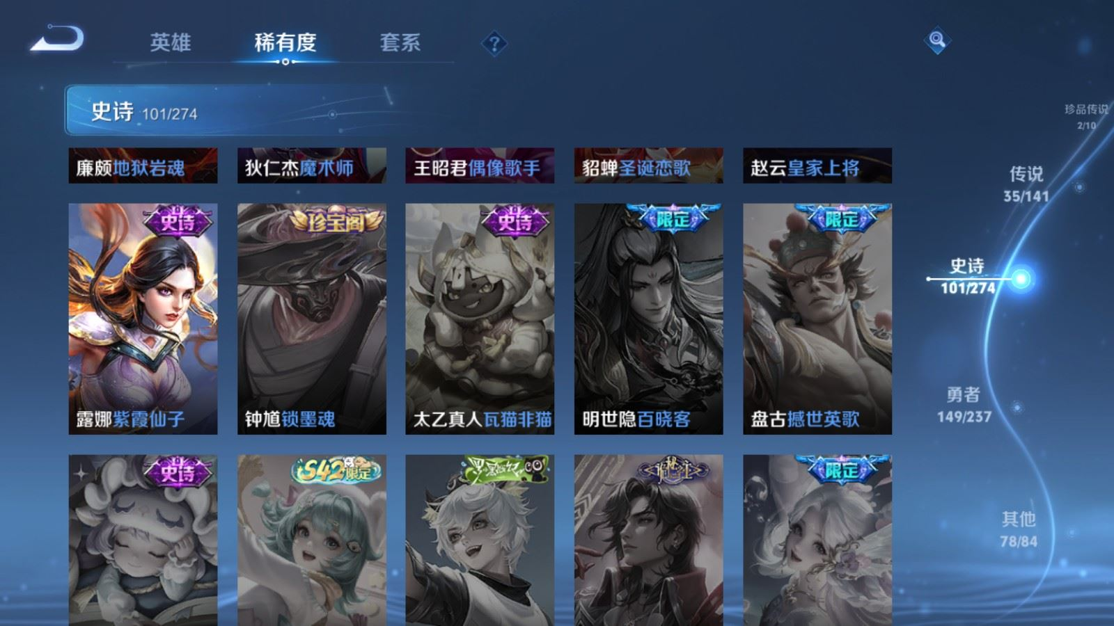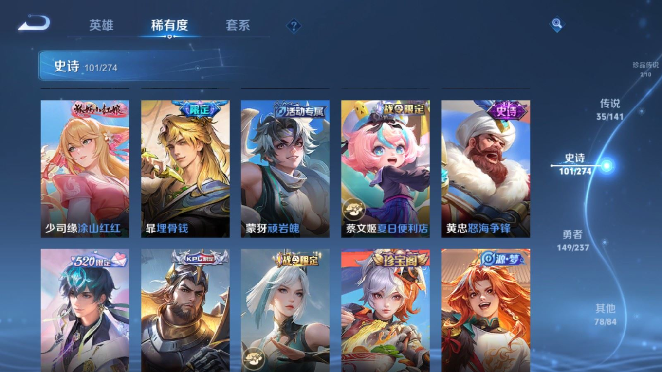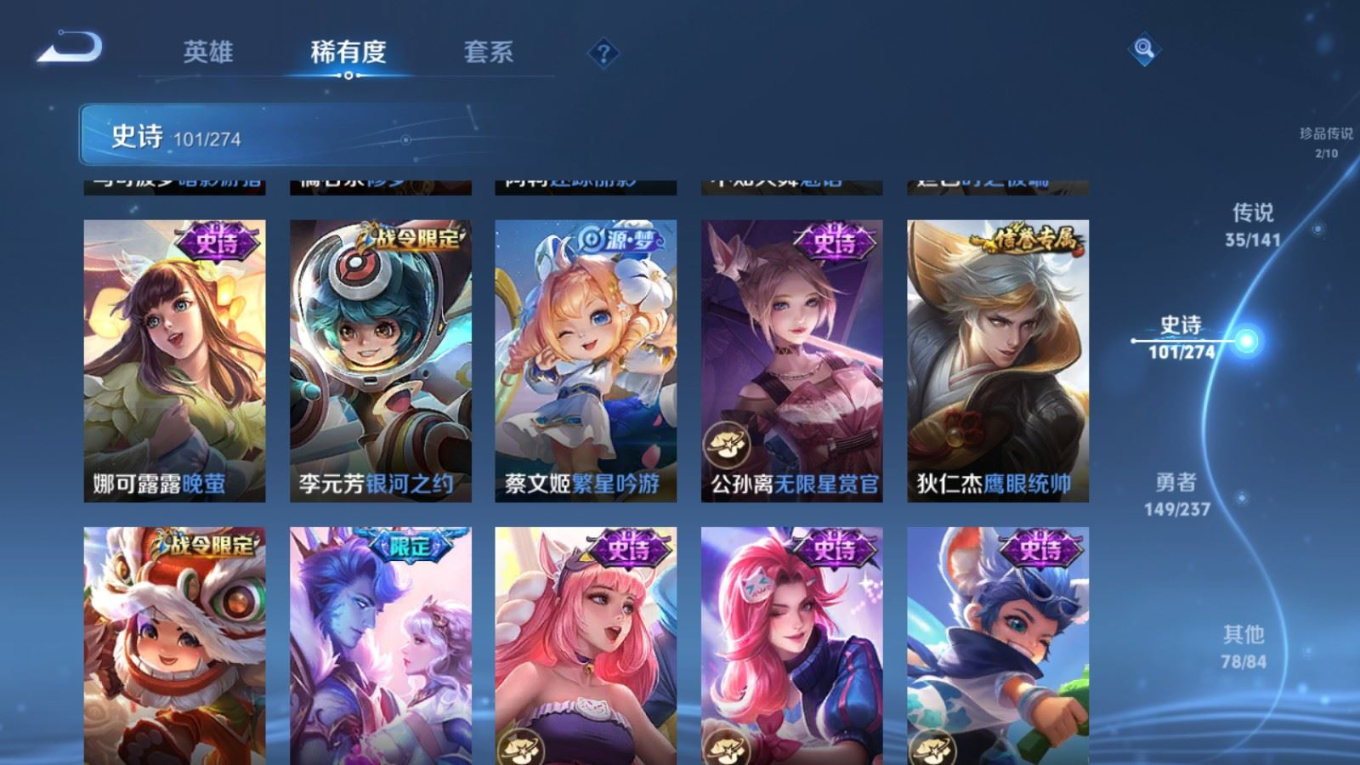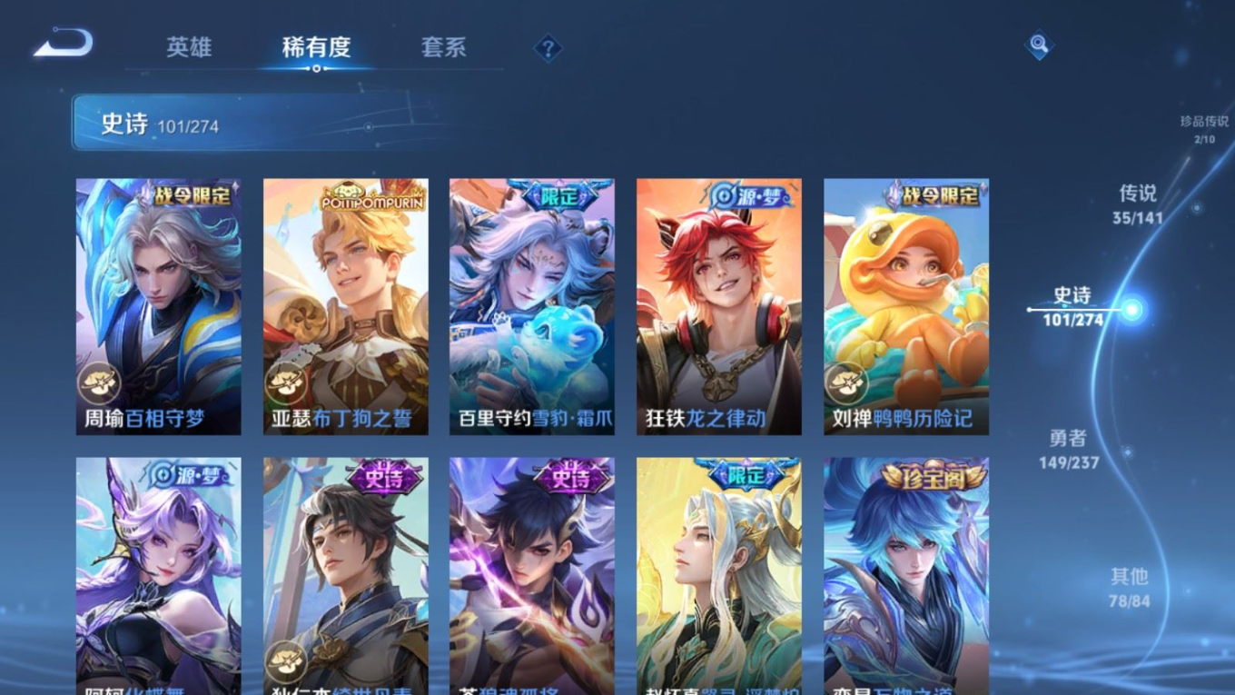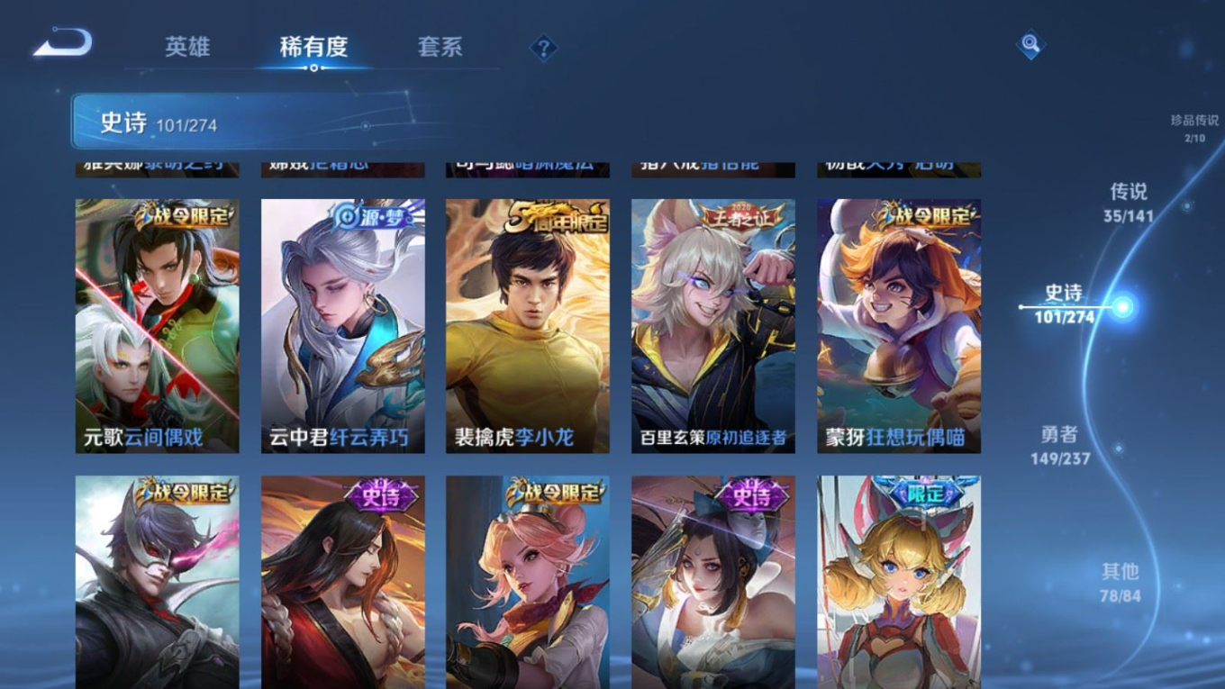 传说品质_后羿_黄金射手座传说品质_后羿_神树通天传说品质_关羽_神骥·镇沧海传说品质_司空震_愿照·山河定传说品质_澜_逐花归海传说品质_澜_愿照·九州拓传说品质_马超_神骥·逐星野传说品质_大乔_时之奇旅传说品质_干将莫邪_千山共赴传说品质_干将莫邪_久胜战神传说品质_宫本武藏_地狱之眼传说品质_元歌_诡秘之主传说品质_貂蝉_神骥·聚万邦传说品质_孙尚香_末日机甲传说品质_夏侯惇_霜北刀传说品质_庄周_牧神诗旅传说品质_桑启_鸣野蒿传说品质_露娜_霜月吟传说品质_女娲_愿照·千秋盛传说品质_杨玉环_星之鸣奏传说品质_马可波罗_妄想实况传说品质_妲己_愿照·众生和传说品质_云缨_幻光神枪传说品质_云缨_神骥·越千峰传说品质_蔡文姬_愿照·福禄聚传说品质_公孙离_祈雪灵祝传说品质_公孙离_云诺千山传说品质_伽罗_炽翼辉光传说品质_狄仁杰_超时空战士传说品质_虞姬_云霓雀翎传说品质_虞姬_愿照·岁时盈传说品质_虞姬_启明星使传说品质_百里玄策_白虎志传说品质_裴擒虎_祥瑞亨通传说品质_王昭君_乞巧织情