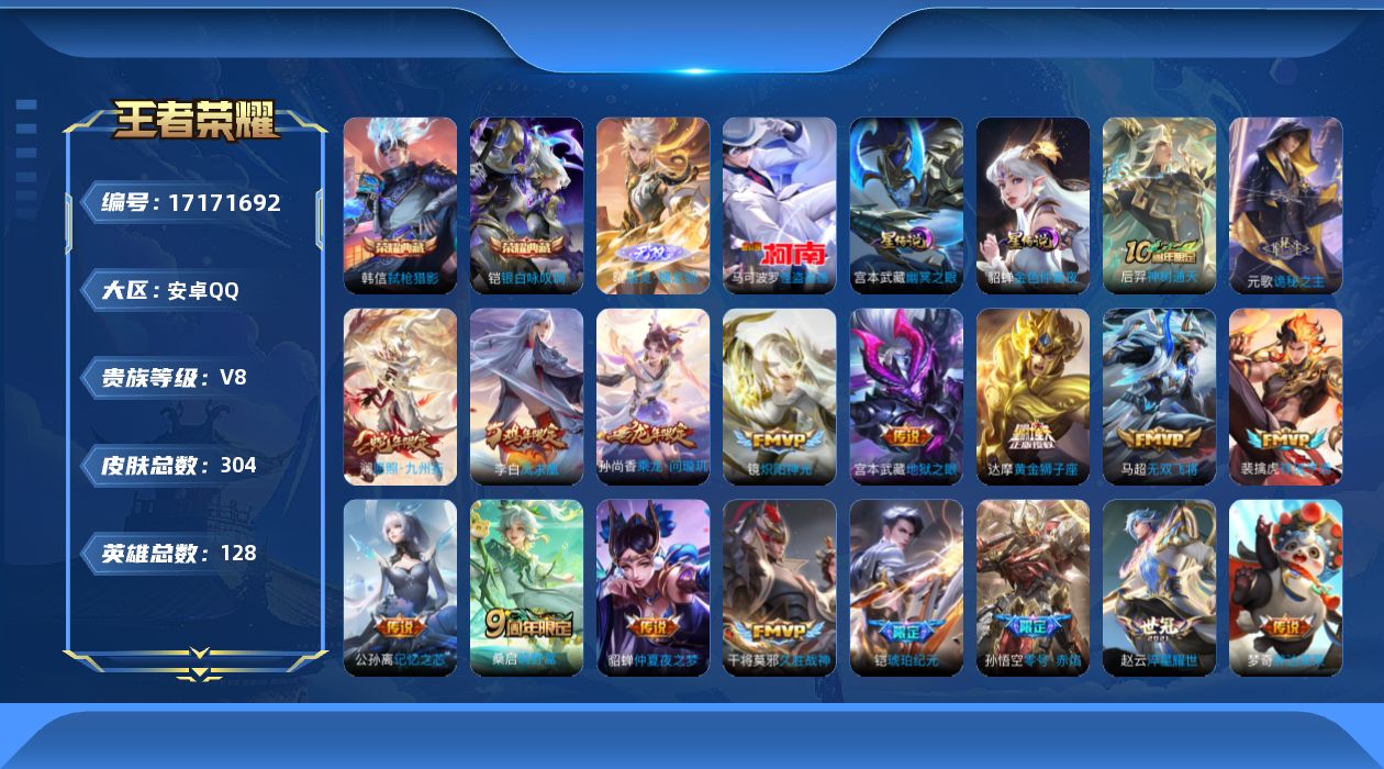 贵族等级:v8皮肤数:304传说品质21 生肖限定6 情人节限定2 珍品传说1 无双1 荣耀典藏2 英雄数:128