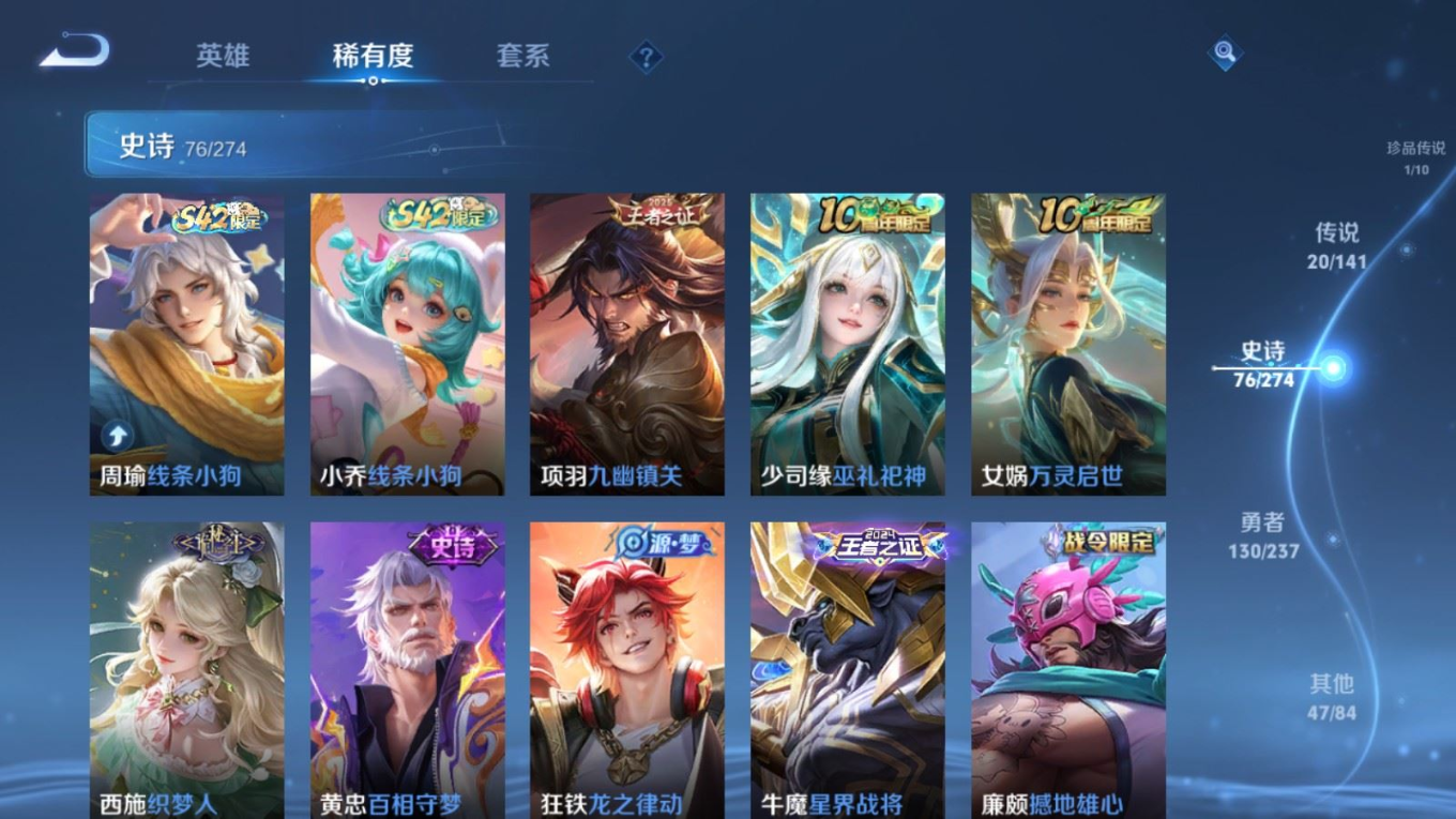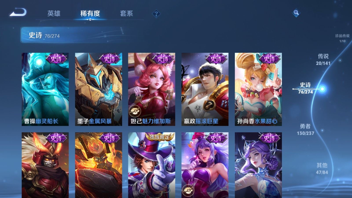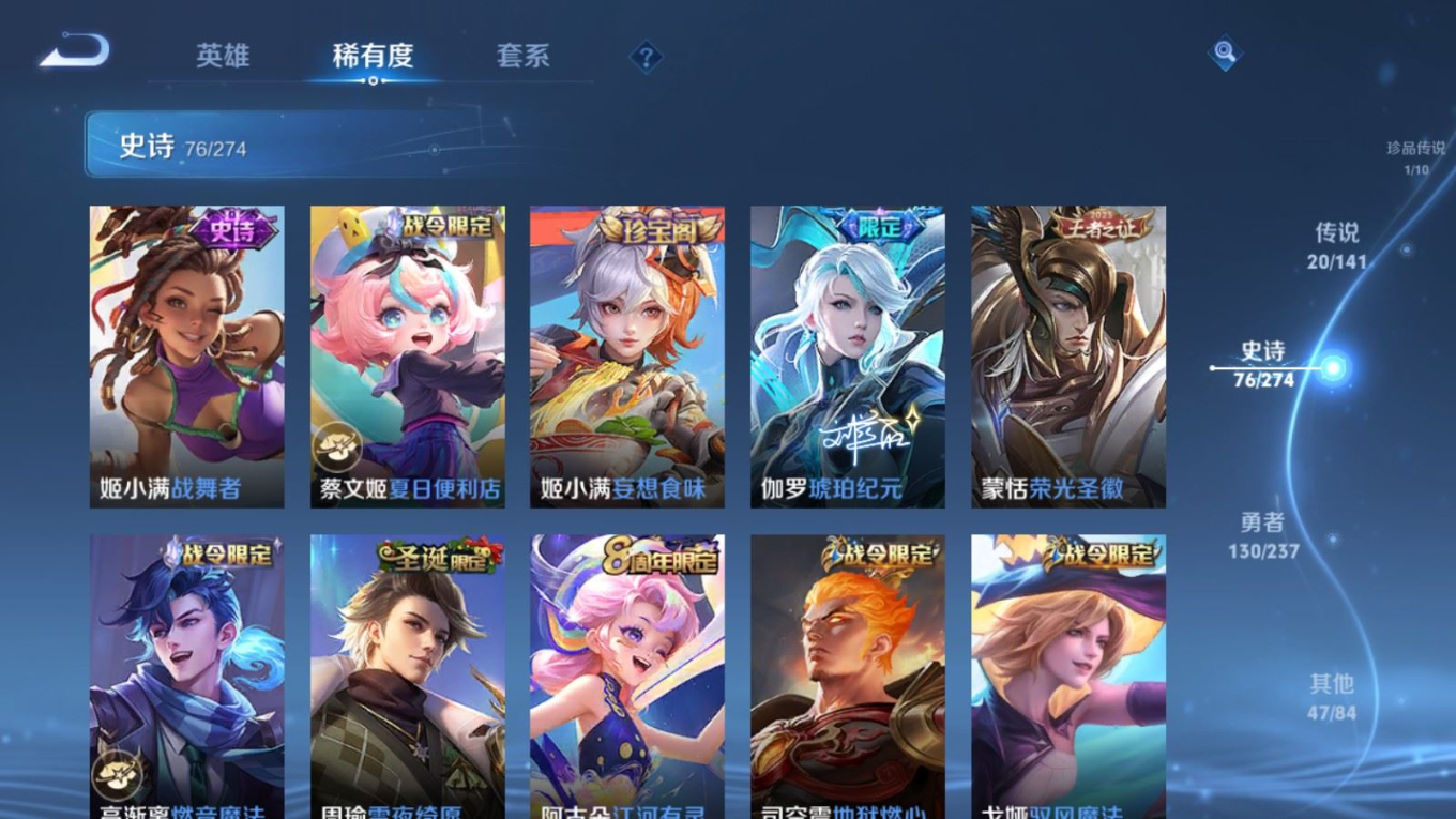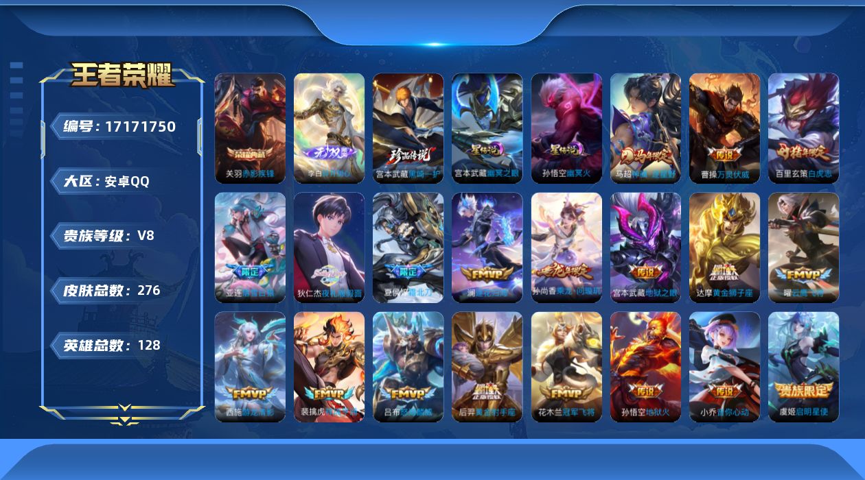 贵族等级:v8皮肤数:276生肖限定5 传说品质20 荣耀典藏1 珍品传说1 无双1 英雄数:128