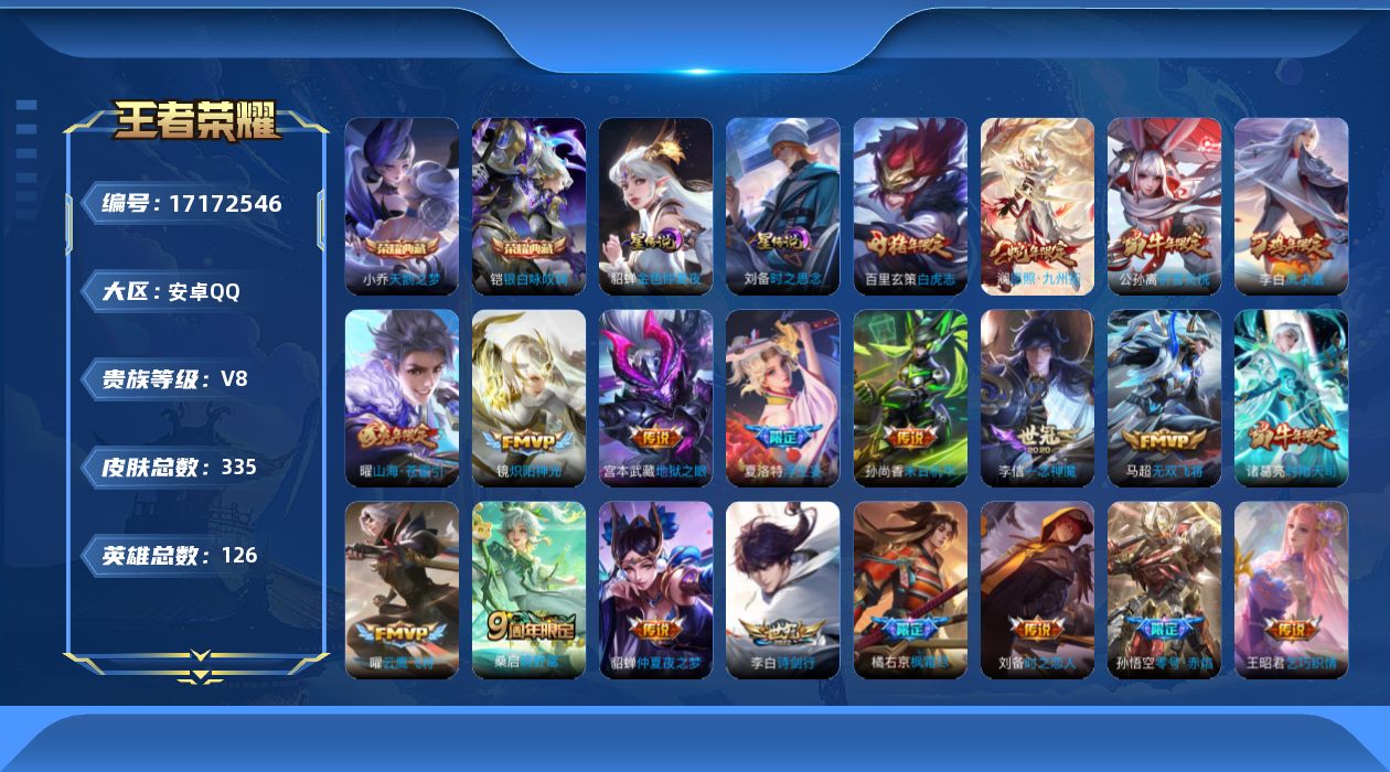 贵族等级:v8皮肤数:335生肖限定11 传说品质23 情人节限定3 荣耀典藏2 英雄数:126