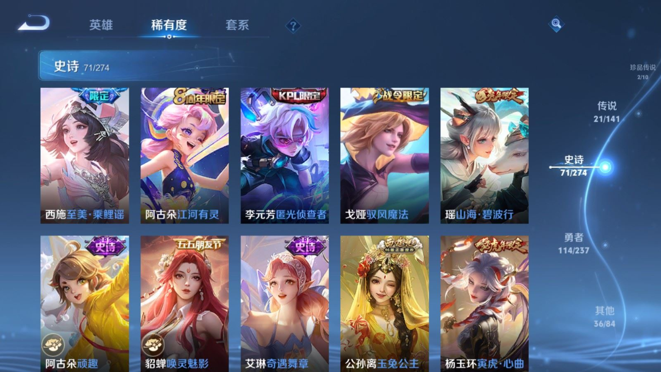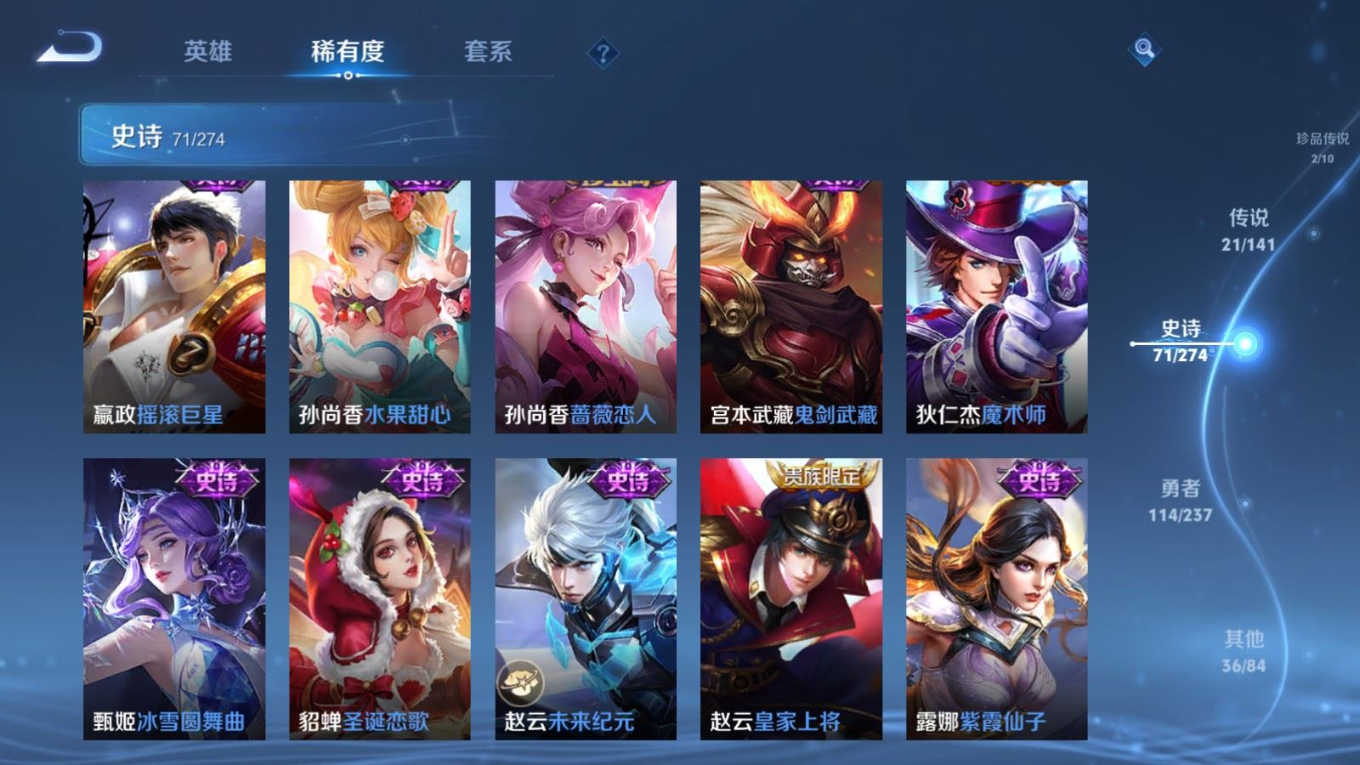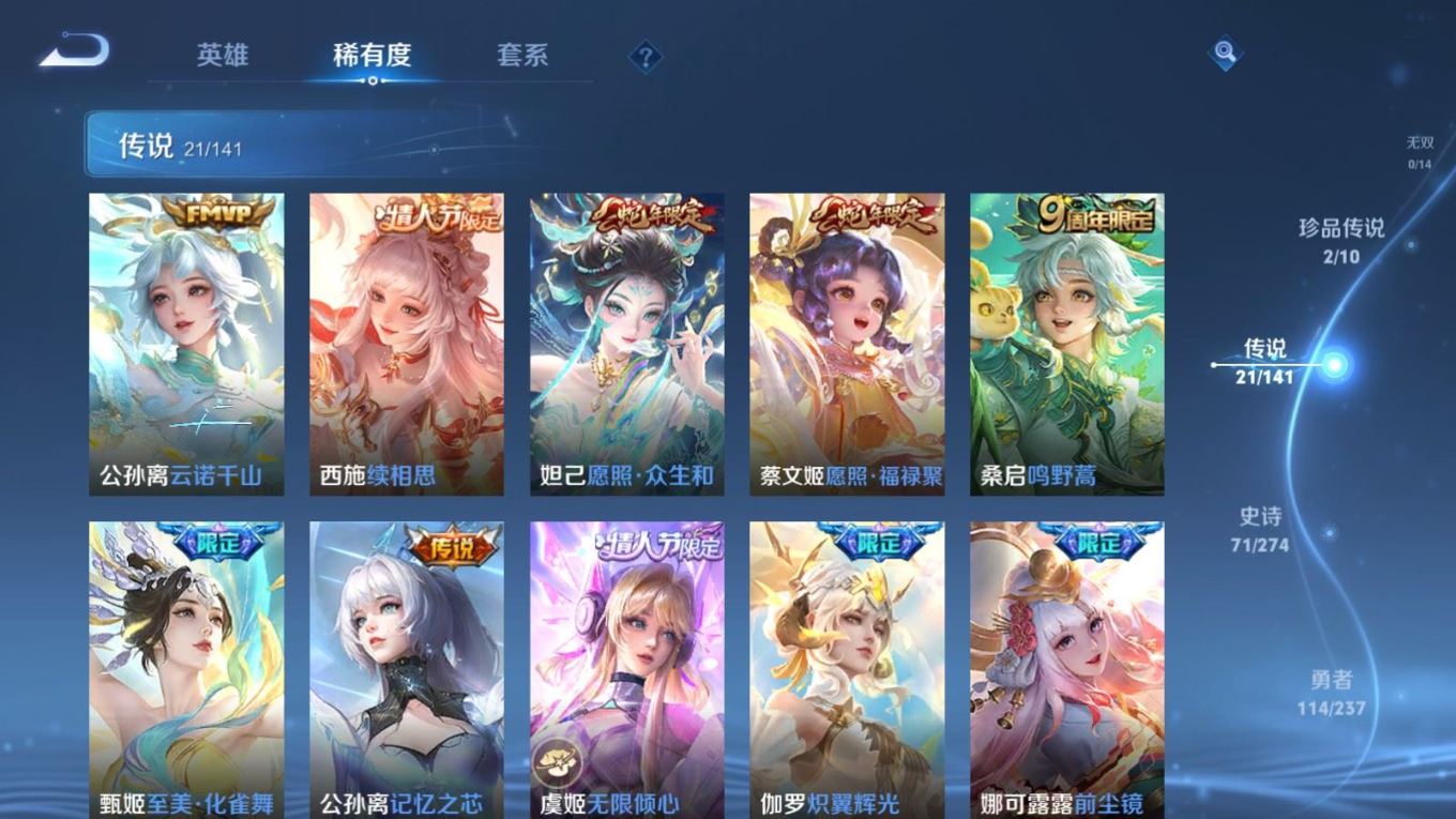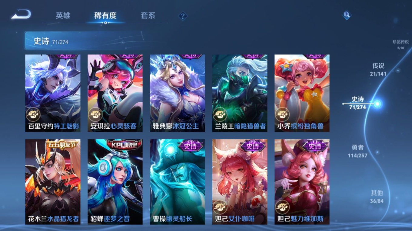 贵族等级:v8皮肤数:246传说品质21 情人节限定2 荣耀典藏2 珍品传说2 生肖限定4 英雄数:126