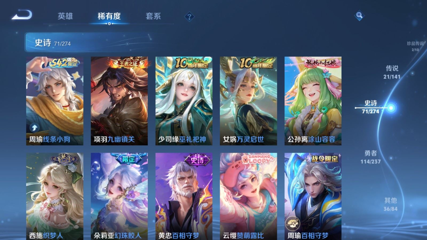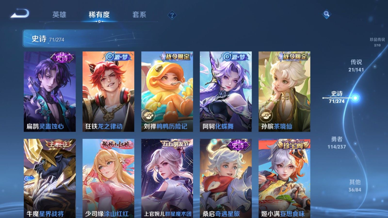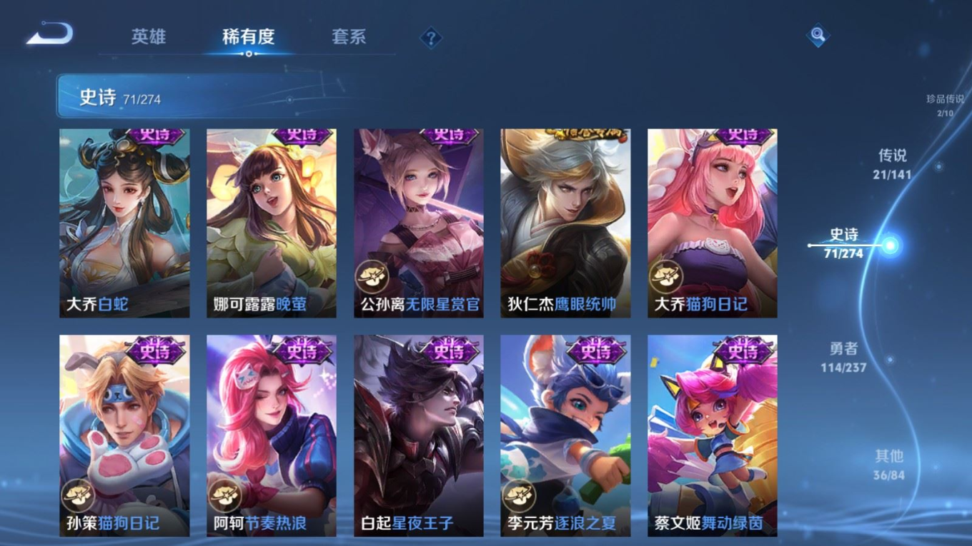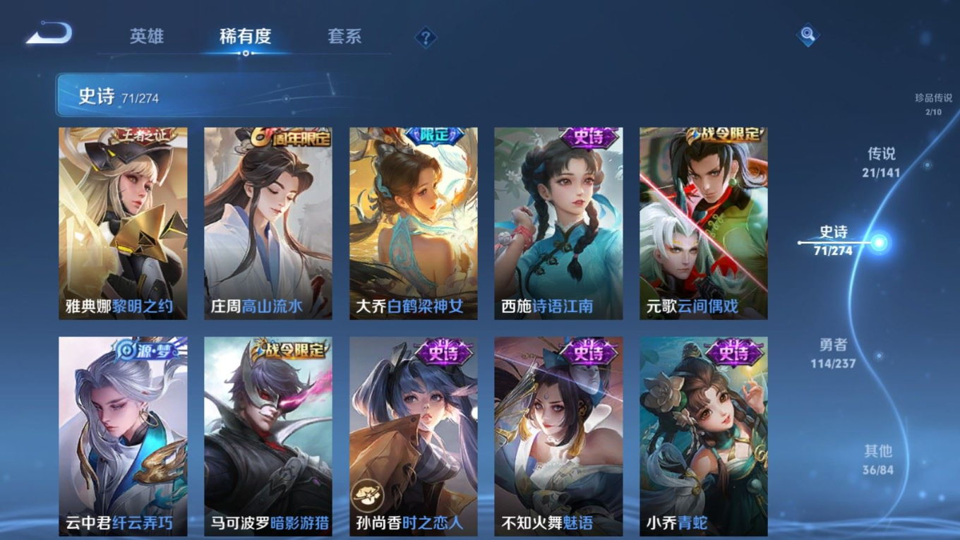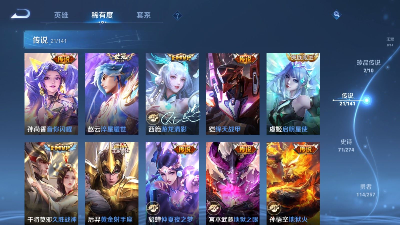 贵族等级:v8皮肤数:246传说品质21 情人节限定2 荣耀典藏2 珍品传说2 生肖限定4 英雄数:126