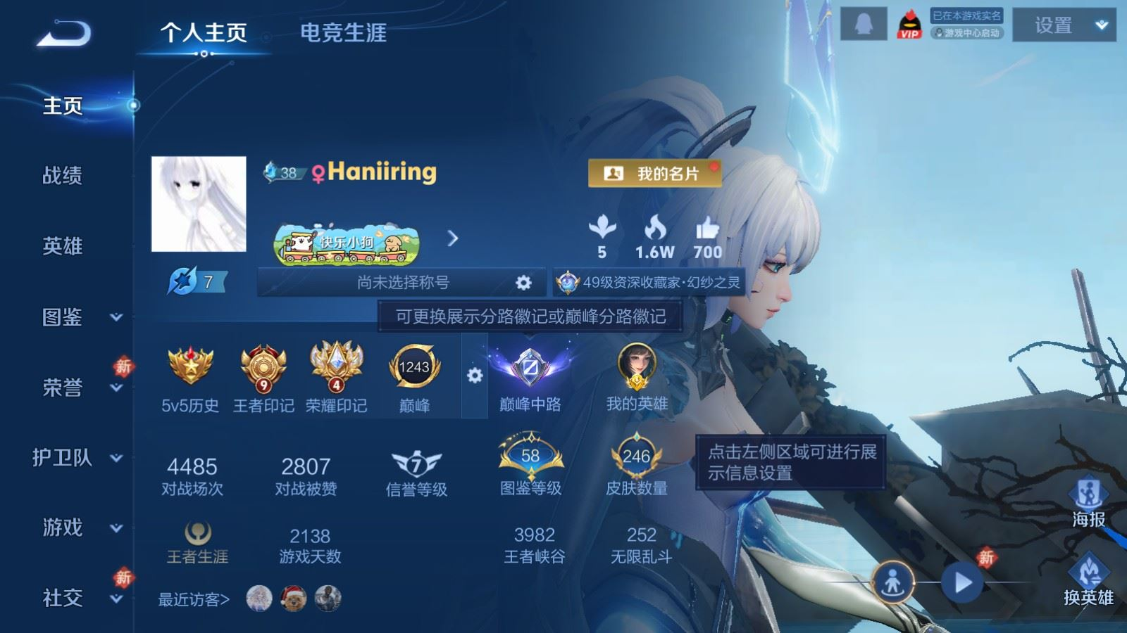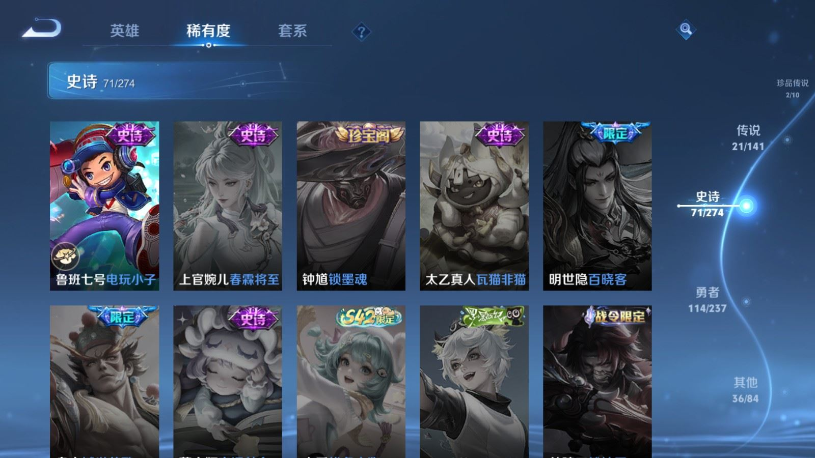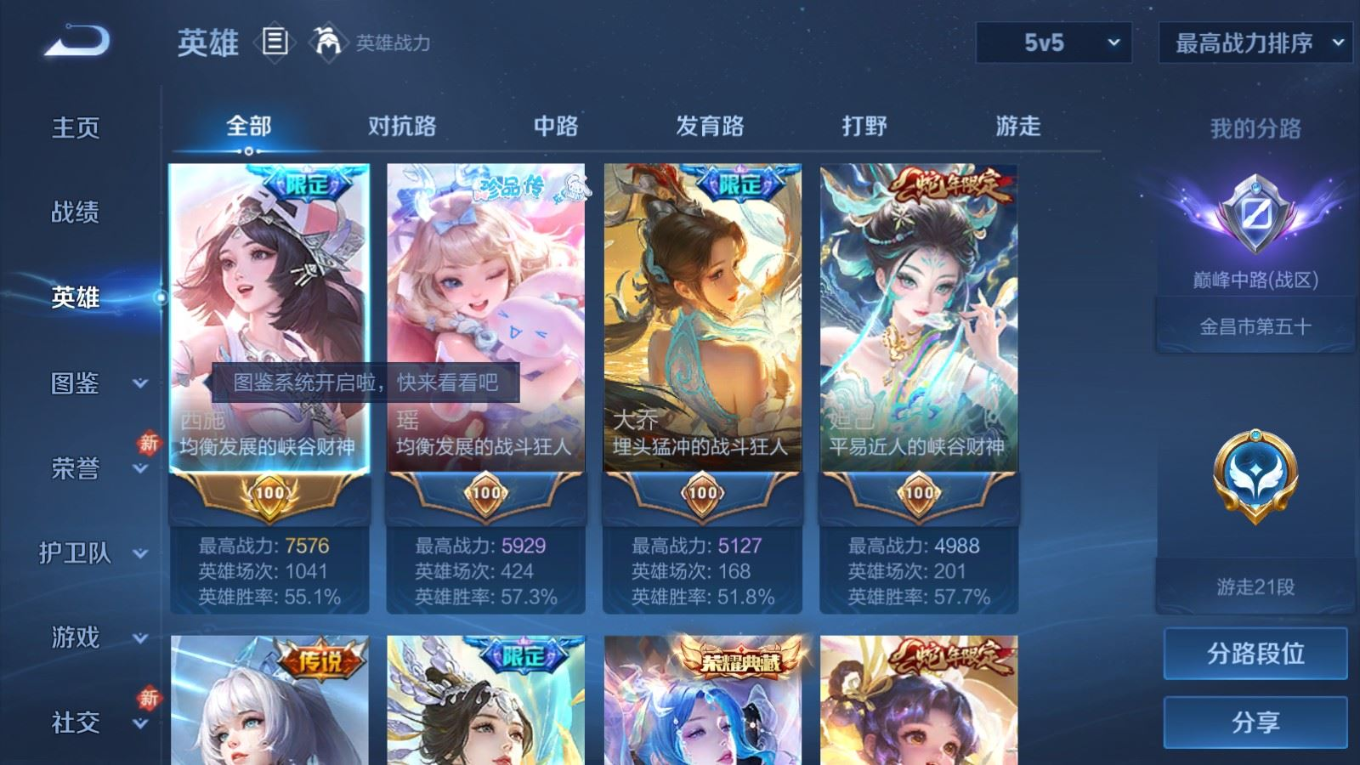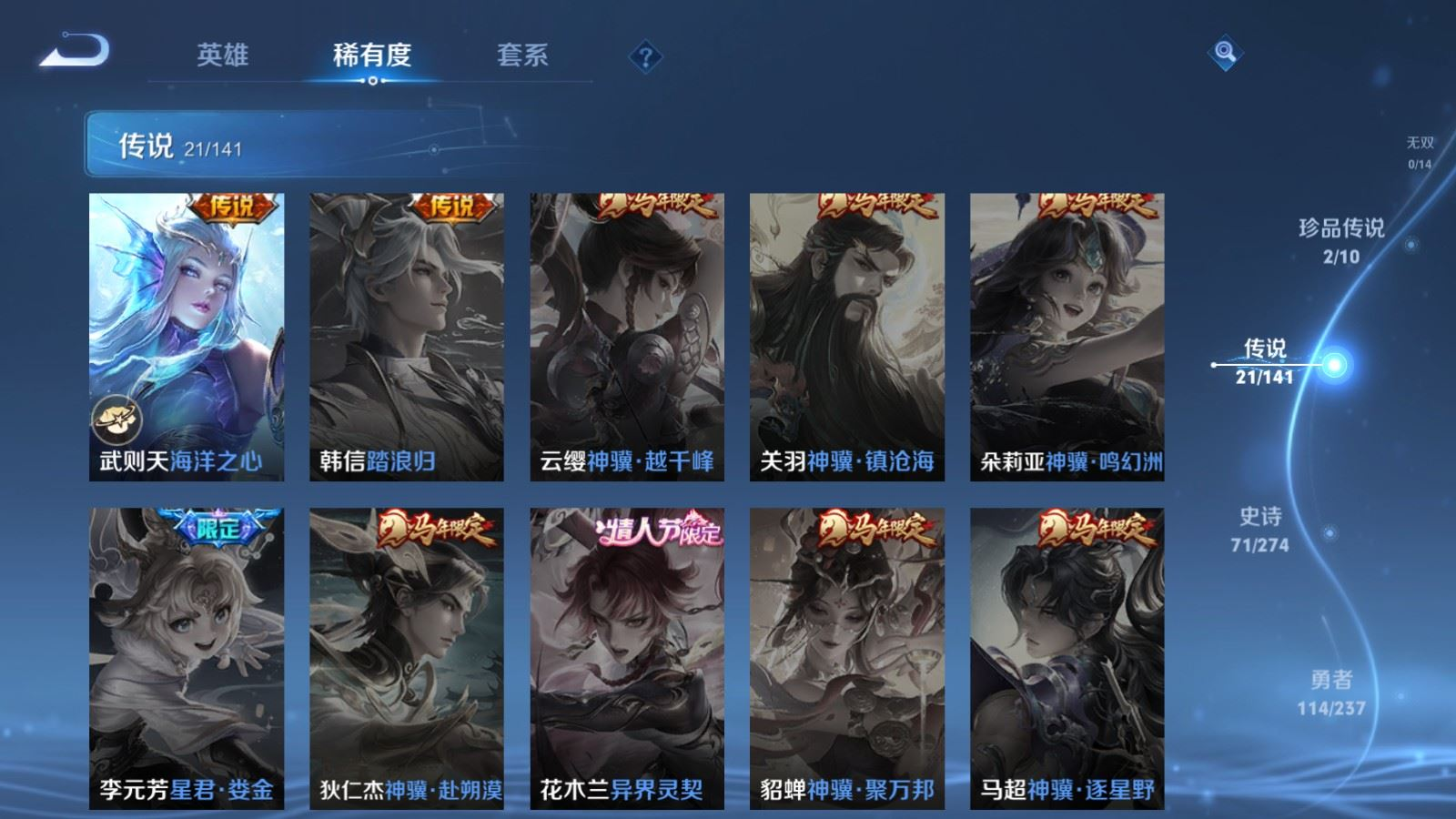 贵族等级:v8皮肤数:246传说品质21 情人节限定2 荣耀典藏2 珍品传说2 生肖限定4 英雄数:126