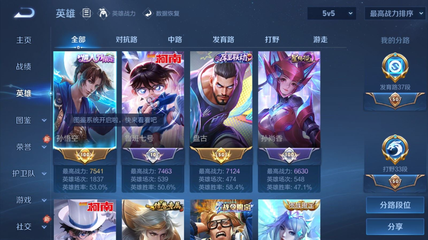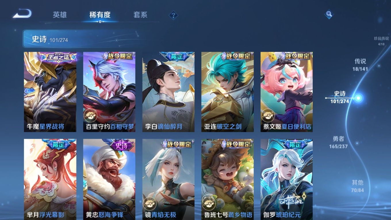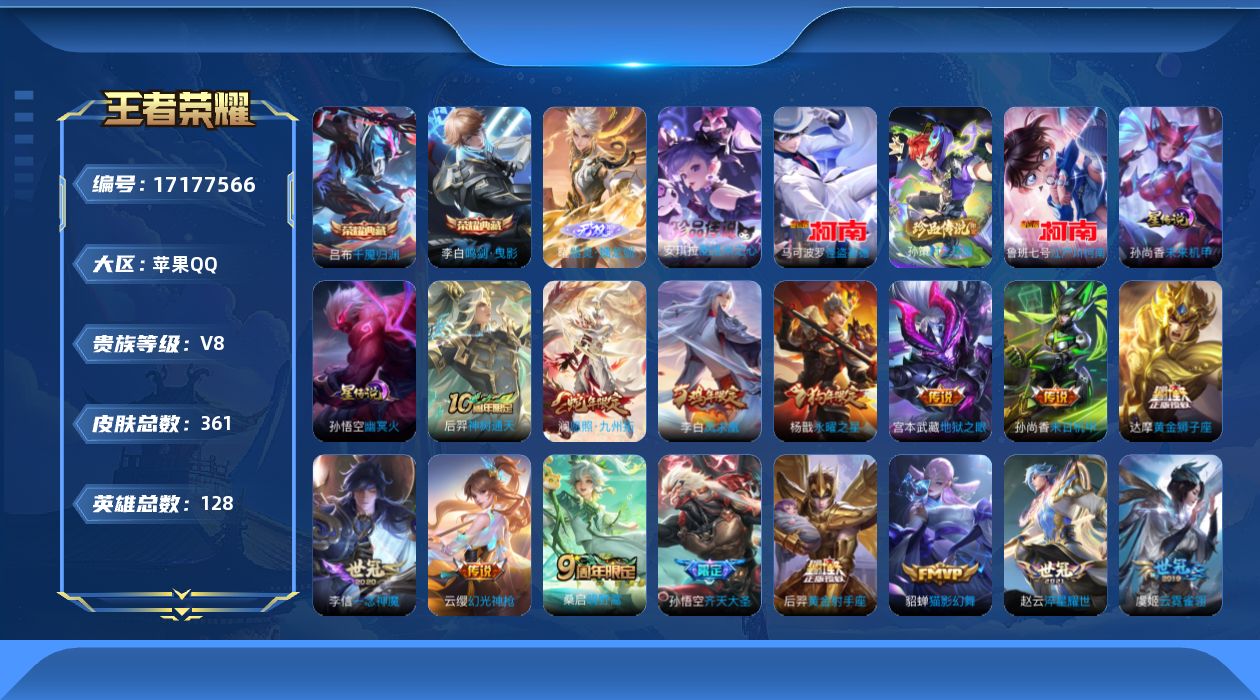 贵族等级:v8皮肤数:361传说品质18 生肖限定6 情人节限定1 荣耀典藏2 珍品传说4 无双1 英雄数:128