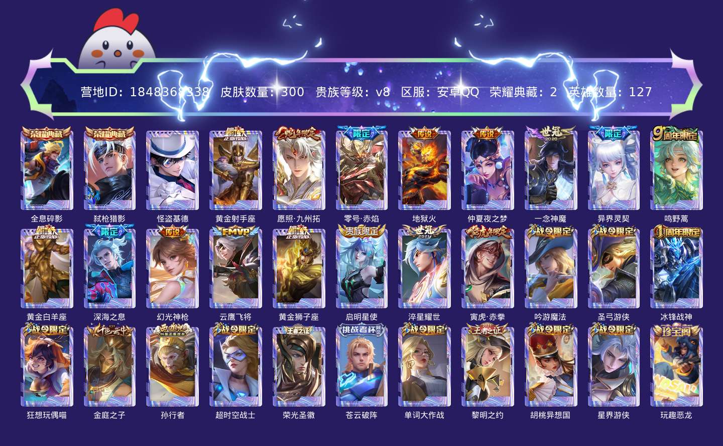 贵族等级:v8皮肤数:300传说品质16 生肖限定4 荣耀典藏2 情人节限定2 珍品传说1 英雄数:127