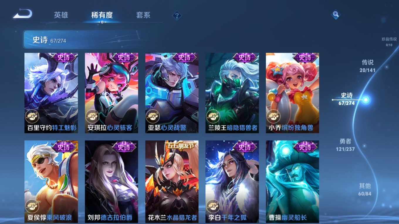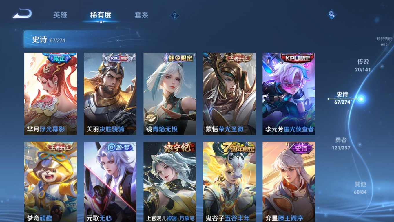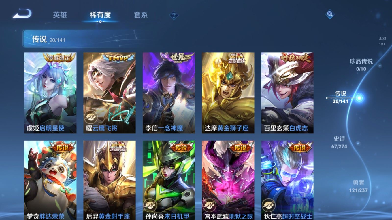 贵族等级:v8皮肤数:270传说品质20 情人节限定1 无双1 荣耀典藏1 生肖限定1 英雄数:126