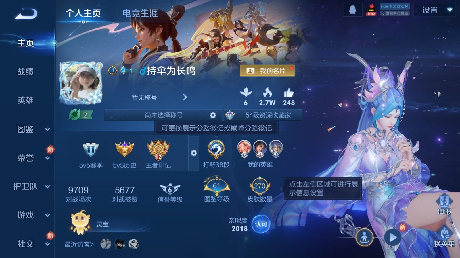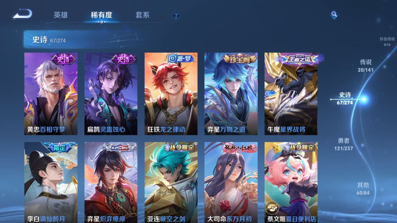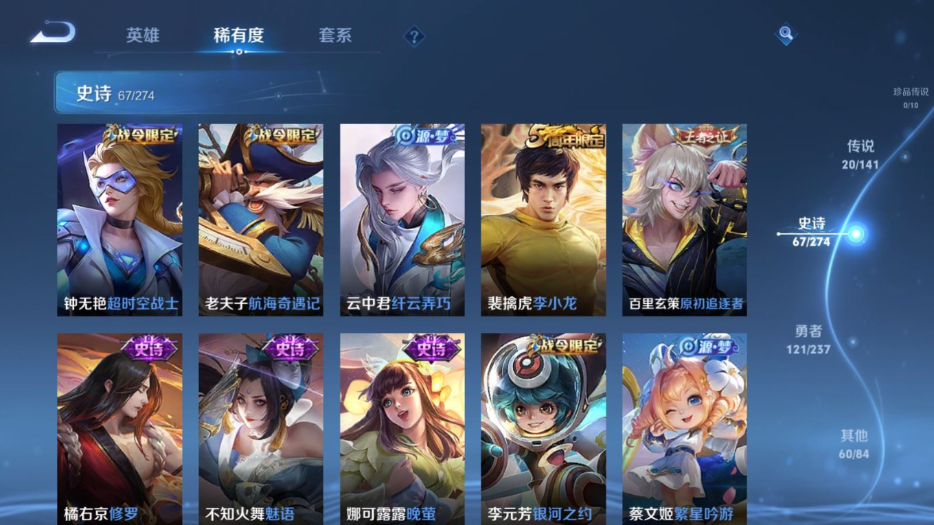 贵族等级:v8皮肤数:270传说品质20 情人节限定1 无双1 荣耀典藏1 生肖限定1 英雄数:126
