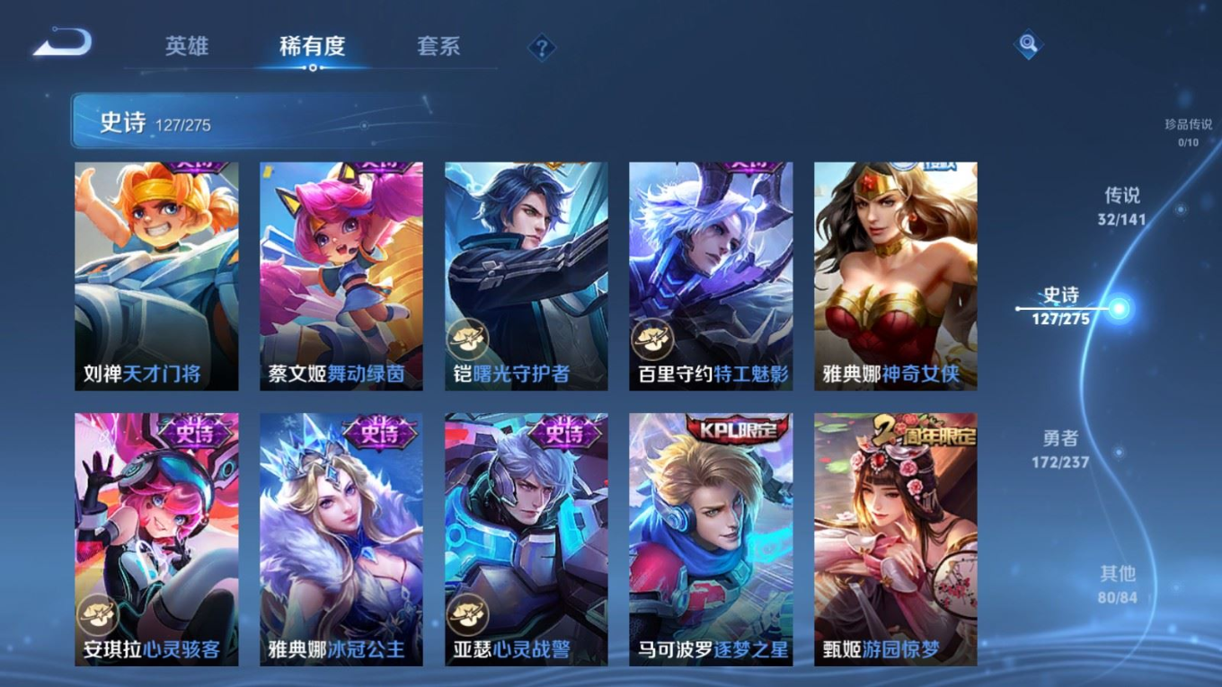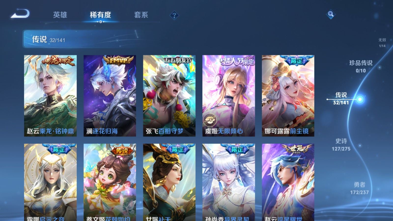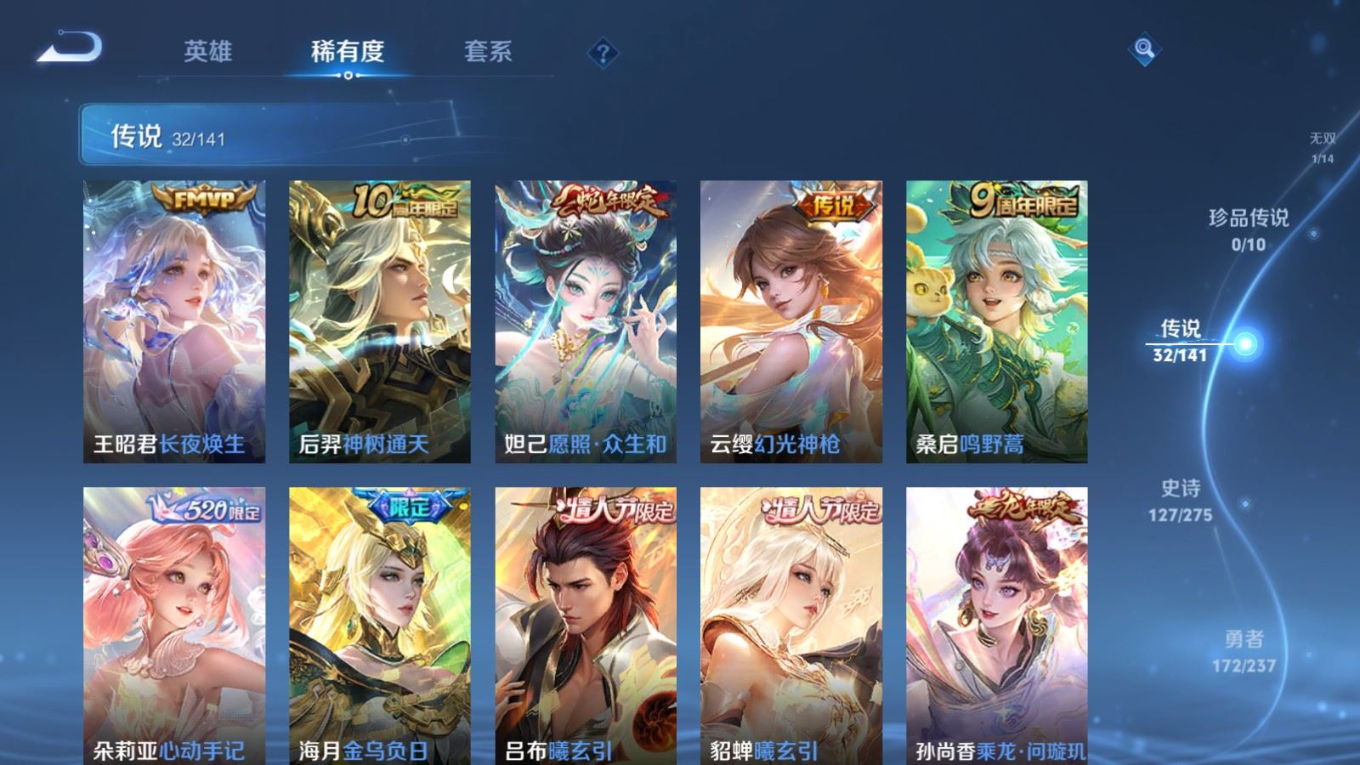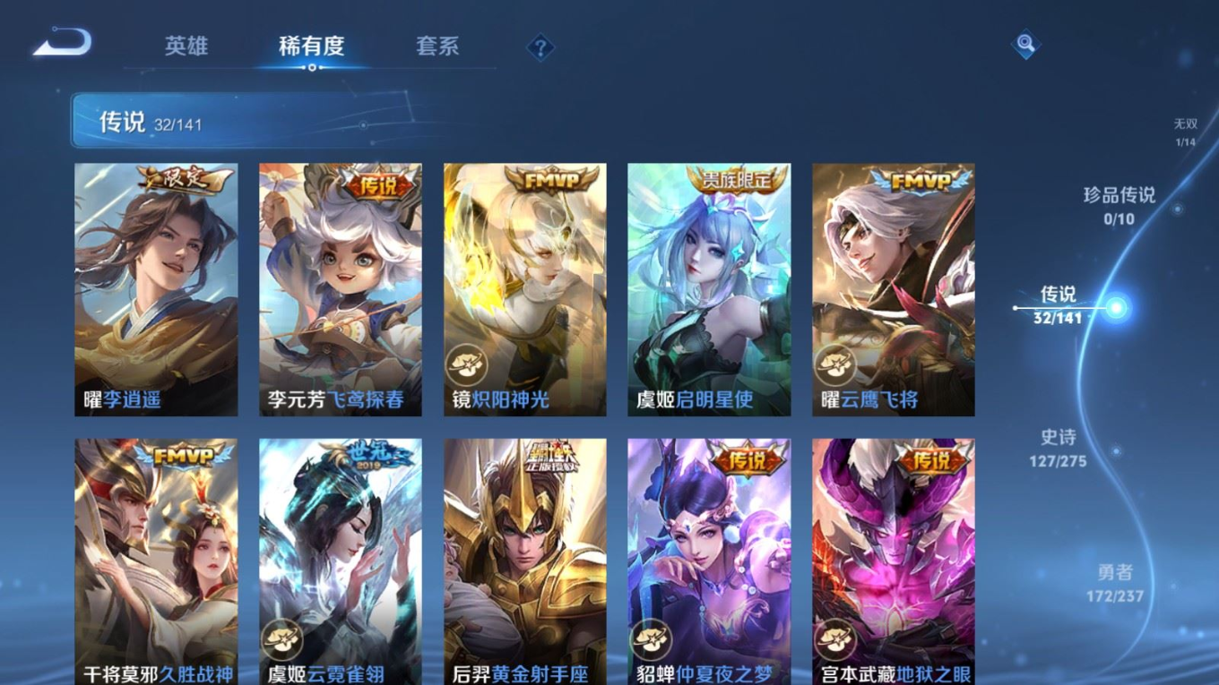 传说品质_后羿_黄金射手座传说品质_后羿_神树通天传说品质_娜可露露_前尘镜传说品质_澜_逐花归海传说品质_吕布_曦玄引传说品质_海月_金乌负日传说品质_武则天_海洋之心传说品质_干将莫邪_久胜战神传说品质_宫本武藏_地狱之眼传说品质_镜_炽阳神光传说品质_貂蝉_曦玄引传说品质_貂蝉_仲夏夜之梦传说品质_孙尚香_乘龙·问璇玑传说品质_孙尚香_异界灵契传说品质_桑启_鸣野蒿传说品质_露娜_启示之音传说品质_王昭君_长夜焕生传说品质_女娲_补天传说品质_妲己_愿照·众生和传说品质_云缨_幻光神枪传说品质_朵莉亚_心动手记传说品质_张飞_百相守梦传说品质_蔡文姬_花朝如约传说品质_曜_云鹰飞将传说品质_曜_李逍遥 传说品质_狄仁杰_超时空战士传说品质_虞姬_无限倾心传说品质_虞姬_云霓雀翎传说品质_虞姬_启明星使传说品质_李元芳_飞鸢探春传说品质_赵云_乘龙·铭钟鼎传说品质_赵云_淬星耀世