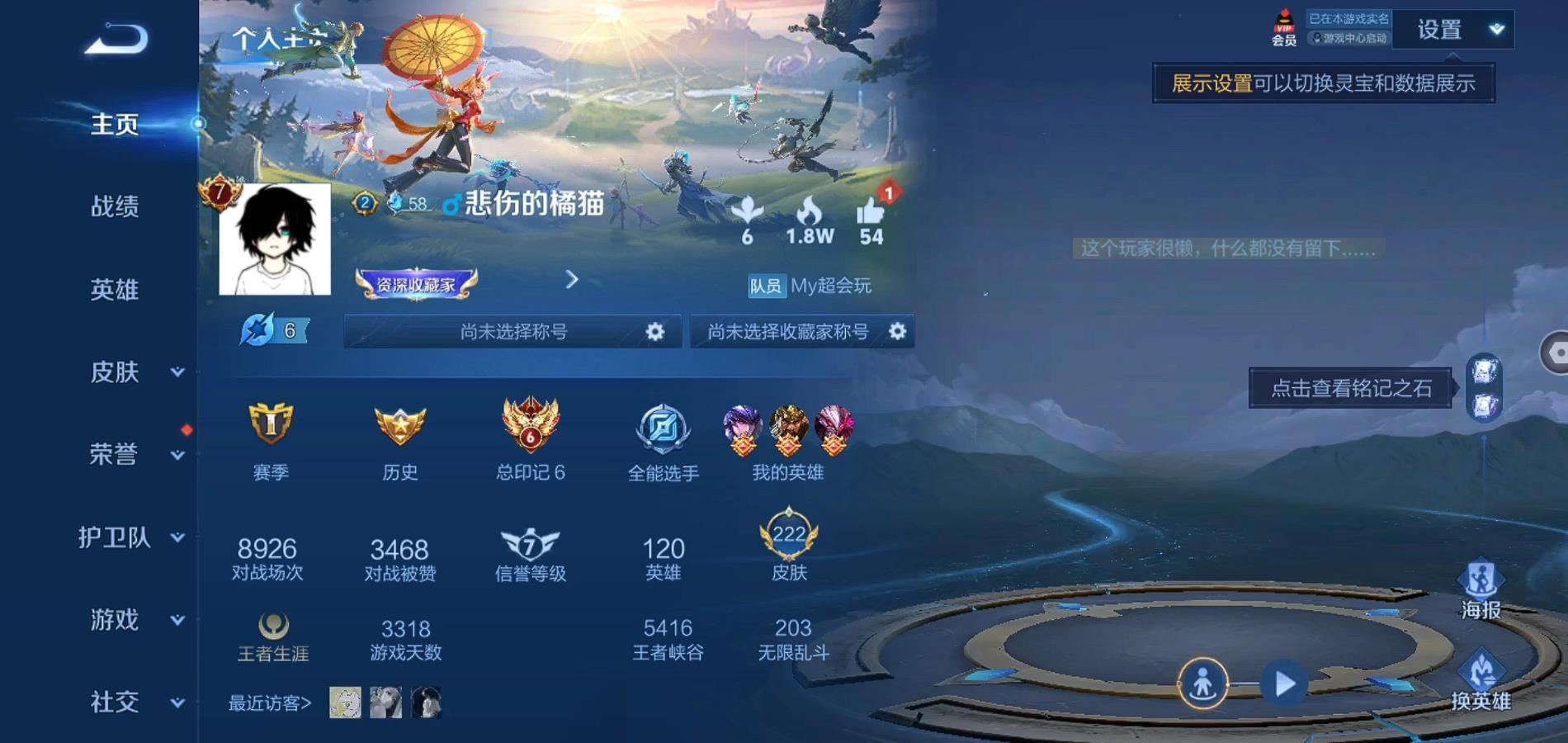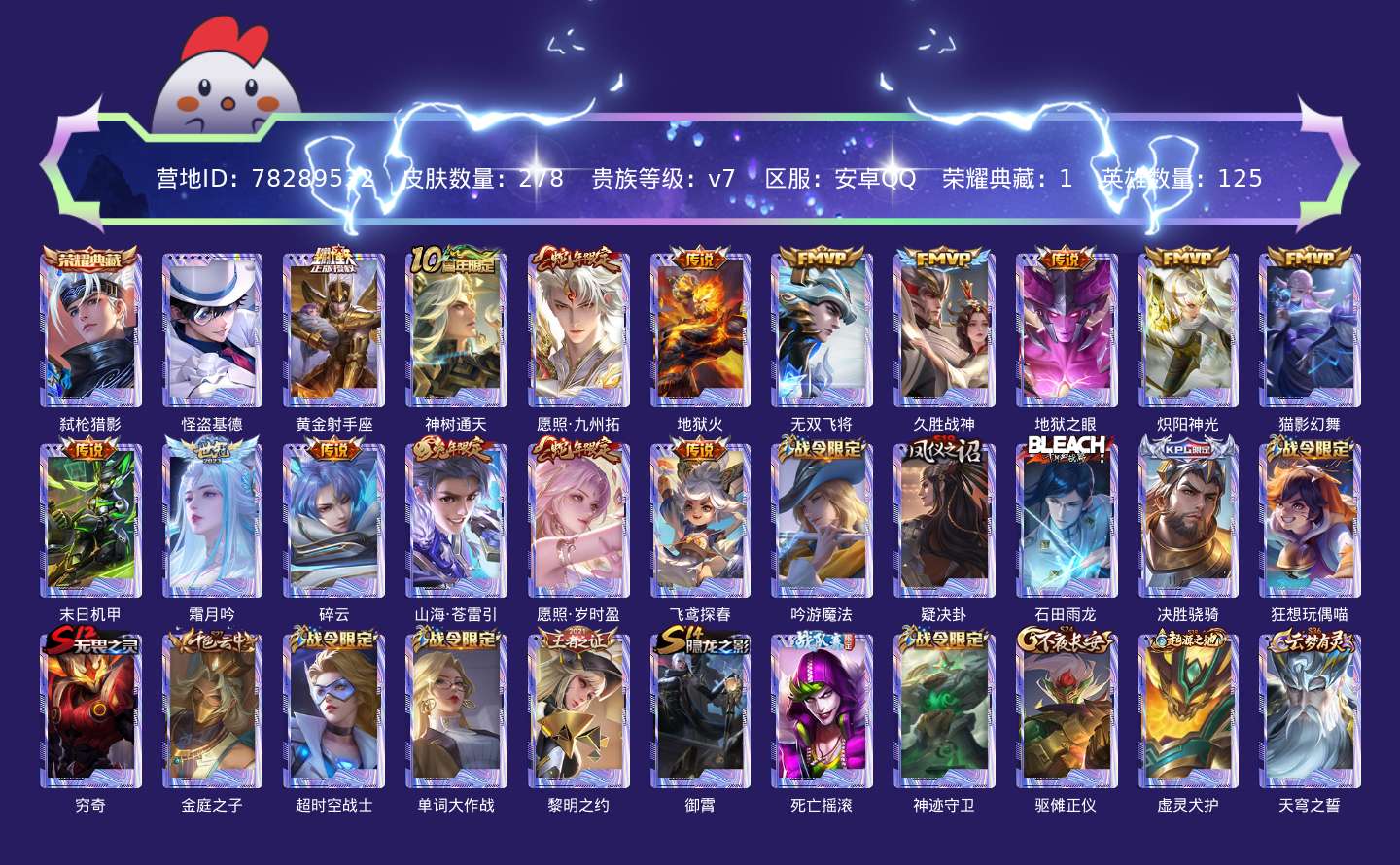 贵族等级:v7皮肤数:278传说品质15 生肖限定4 珍品传说1 荣耀典藏1 英雄数:125