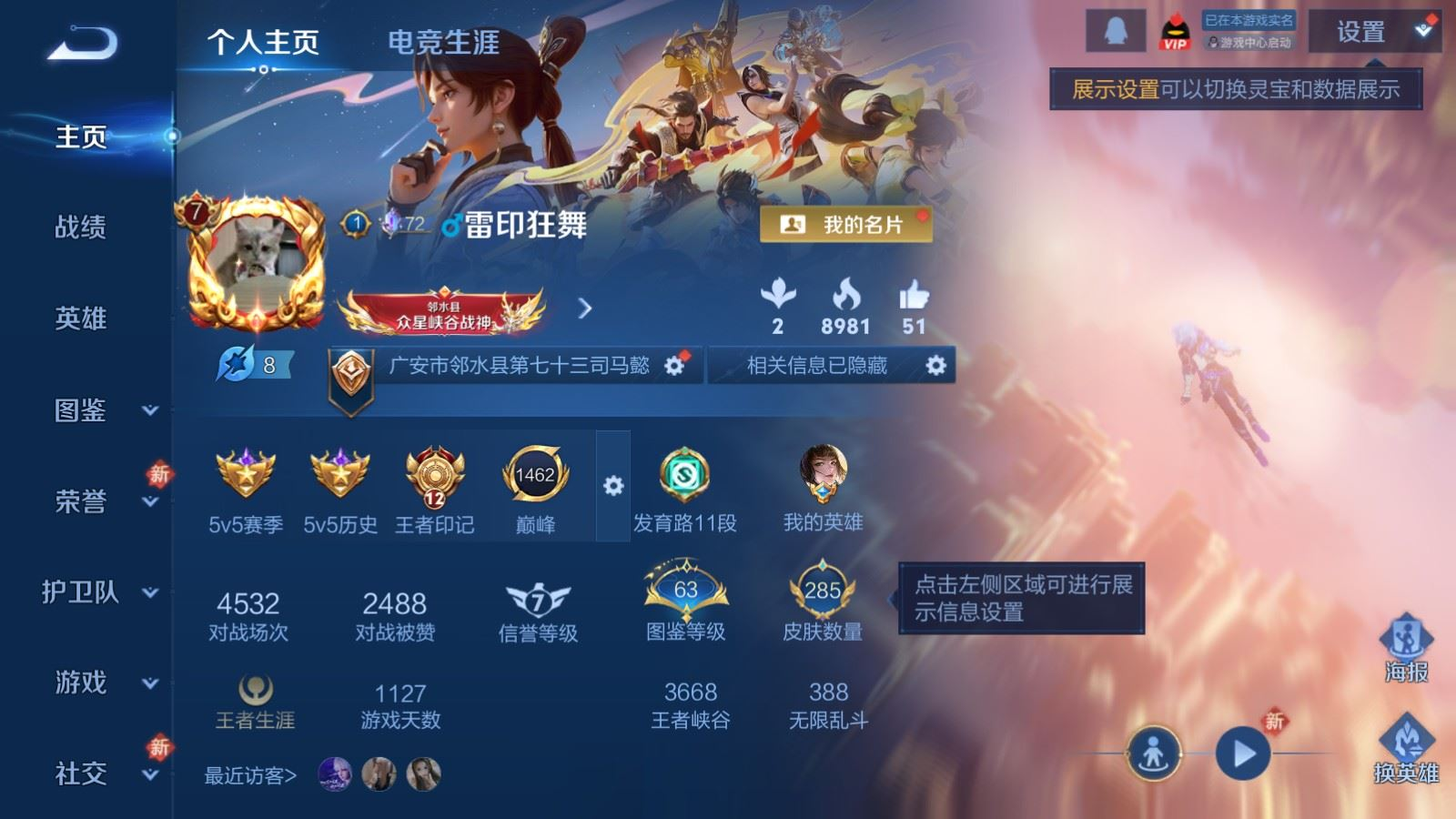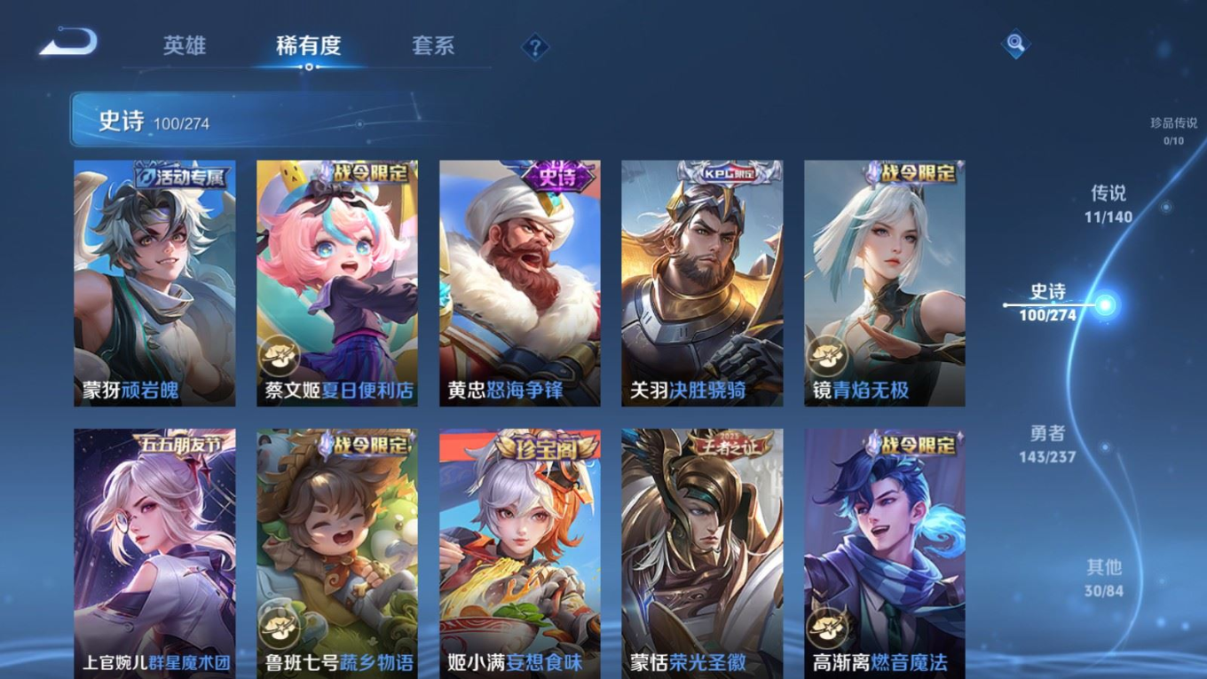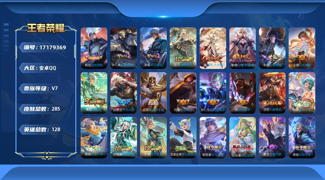 贵族等级:v7皮肤数:285传说品质11 生肖限定2 荣耀典藏1 英雄数:128