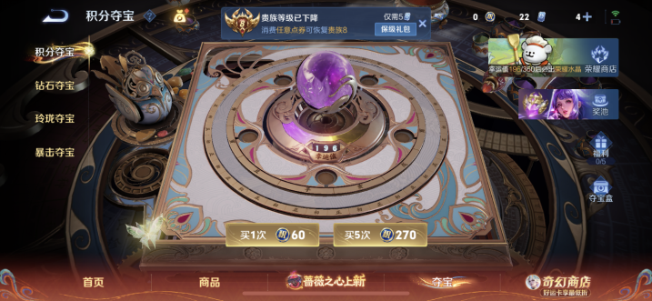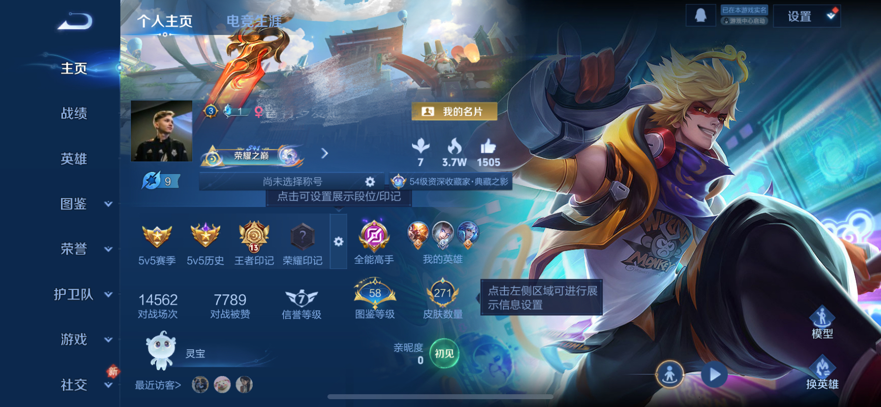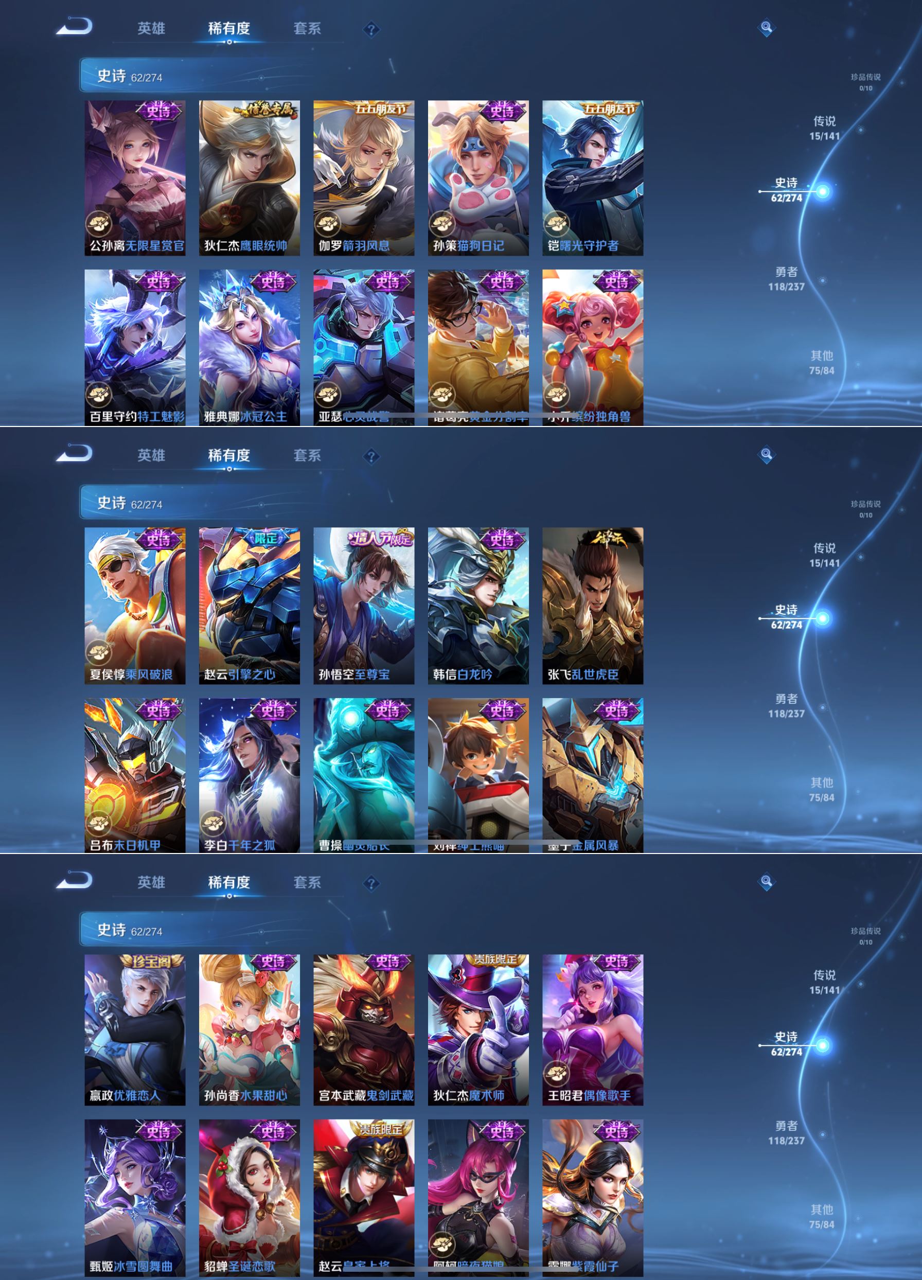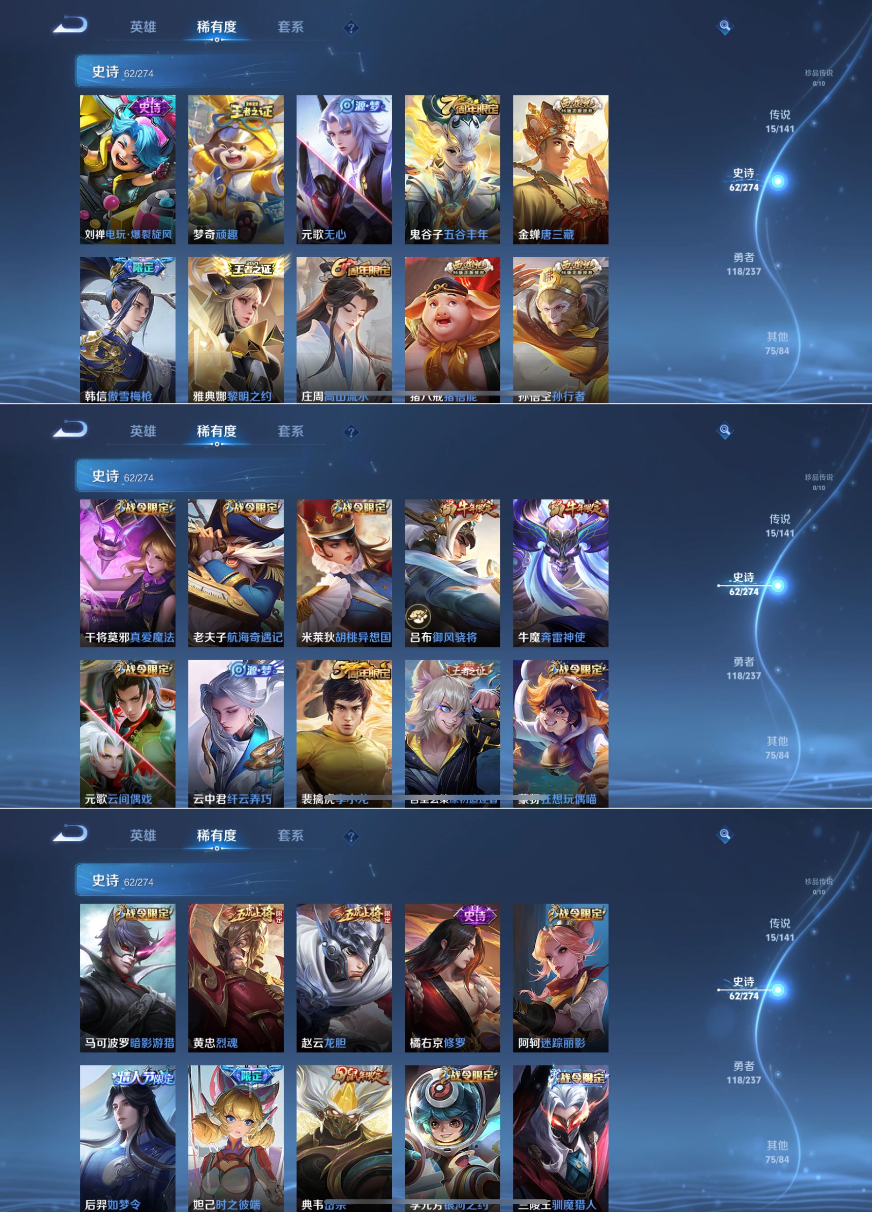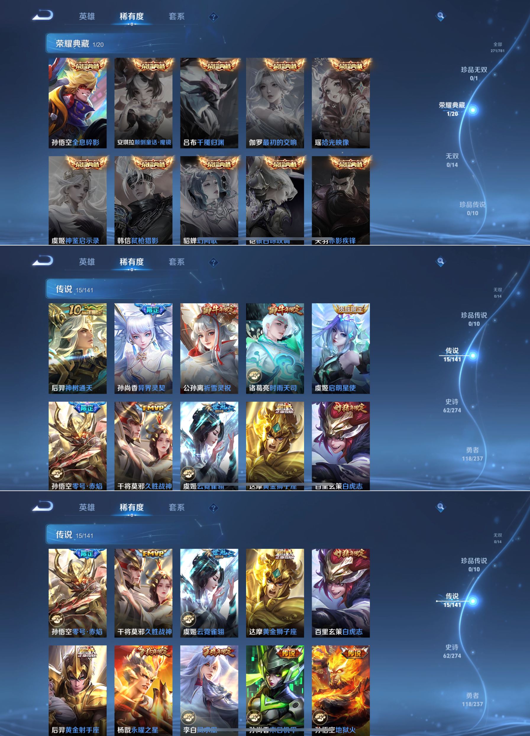 贵族等级:v8皮肤数:271传说品质15 情人节限定2 生肖限定8 荣耀典藏1 英雄数:126