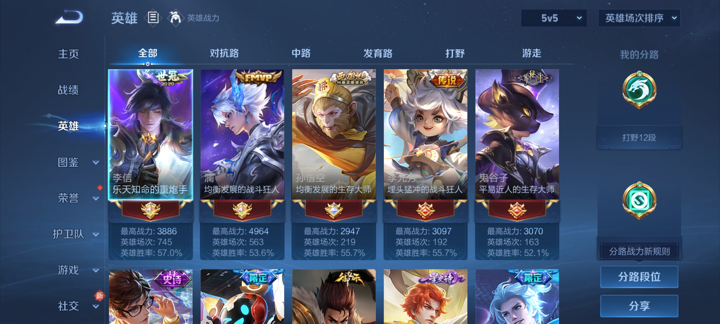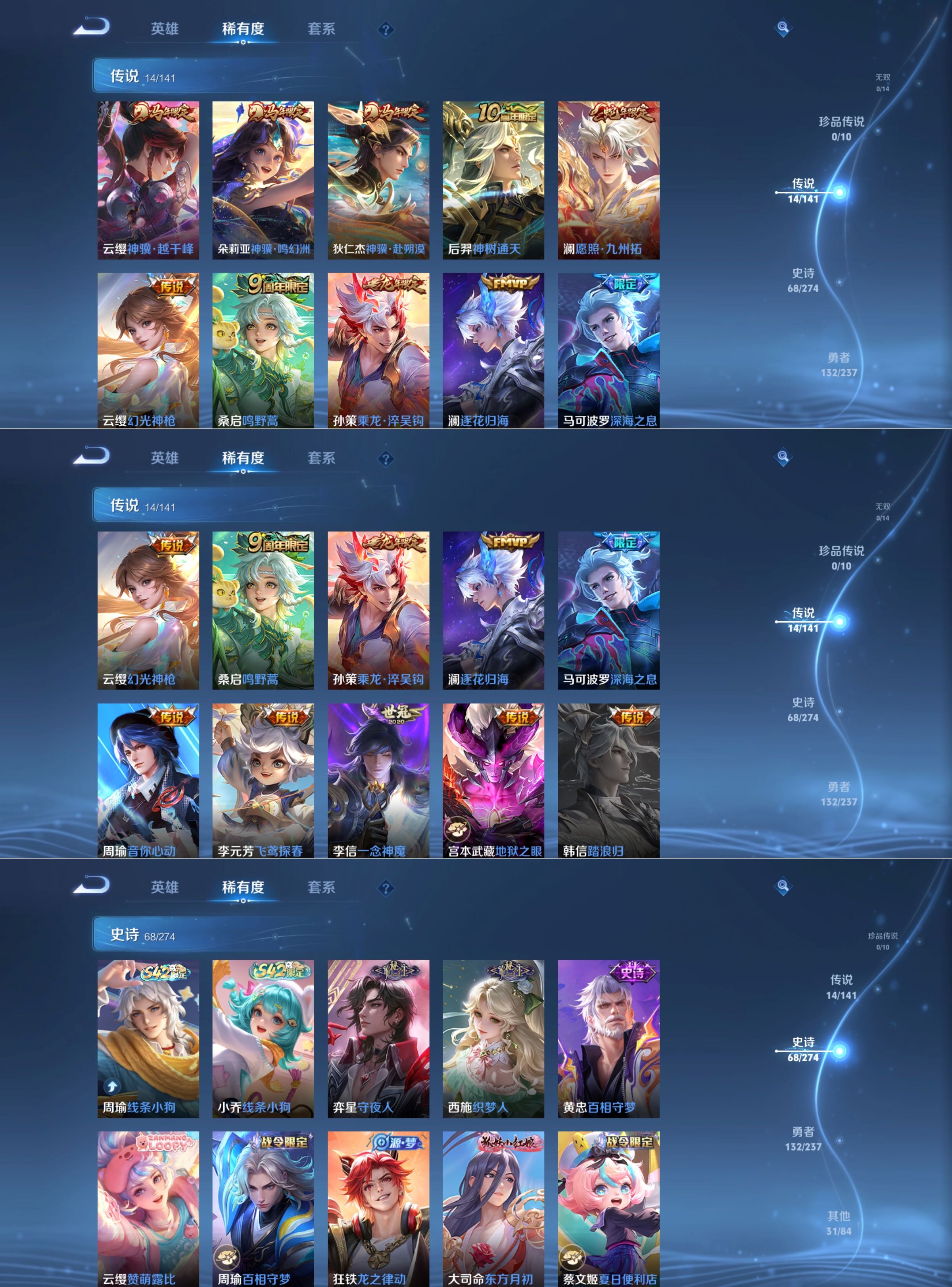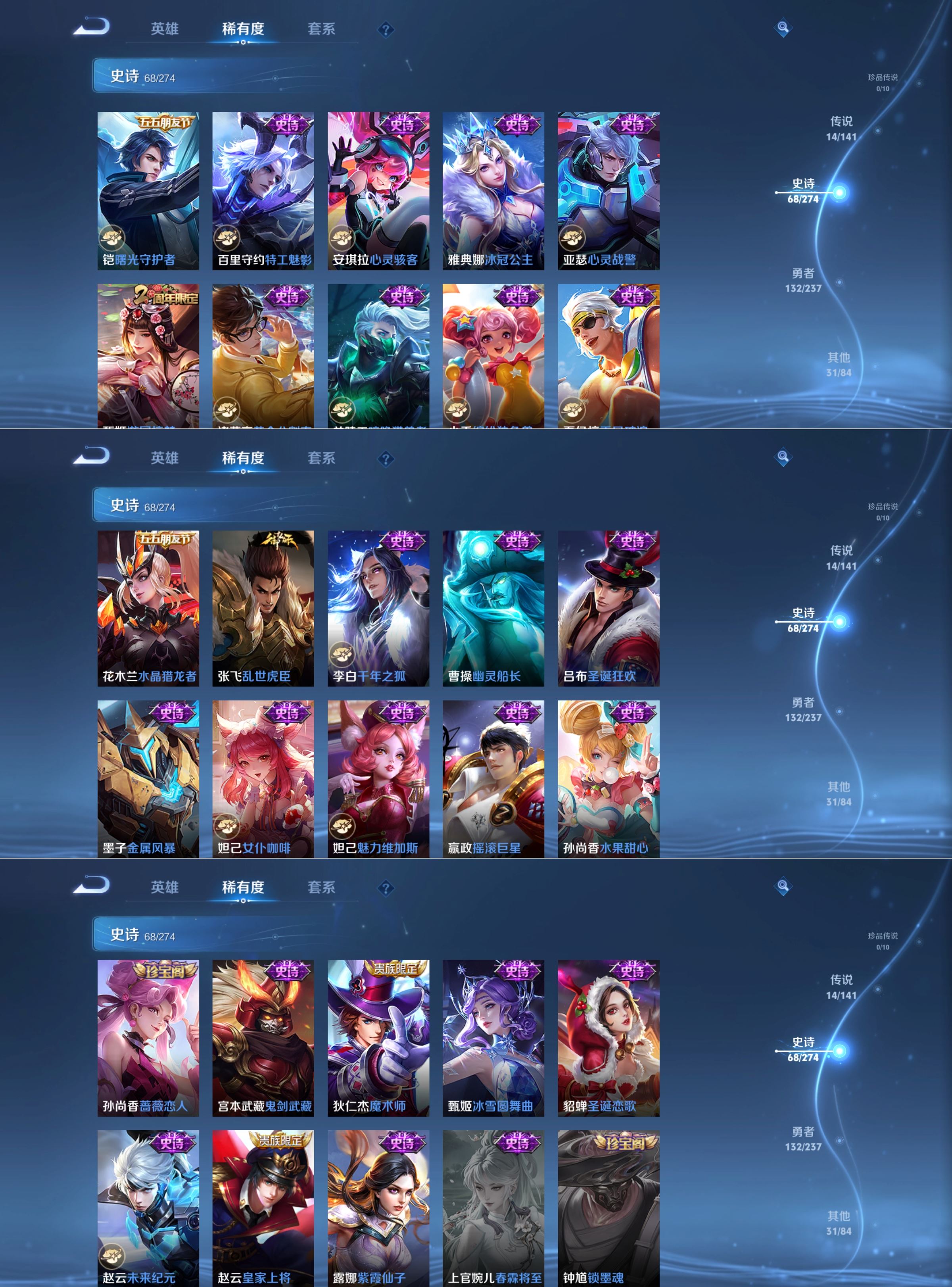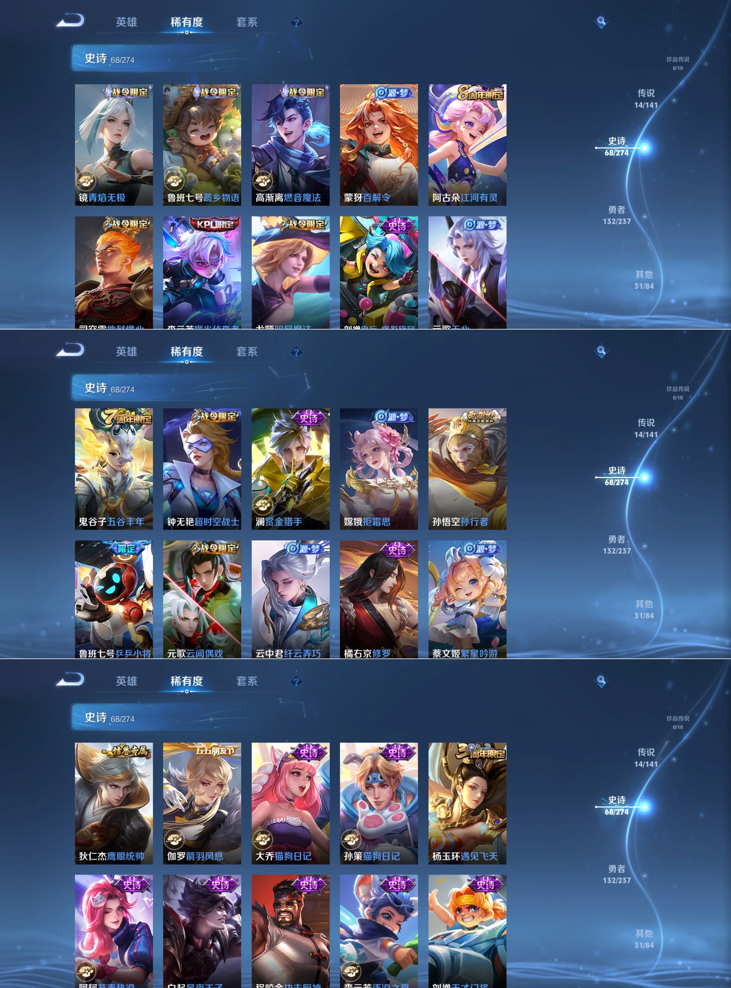 贵族等级:v7皮肤数:245传说品质14 生肖限定5 英雄数:126