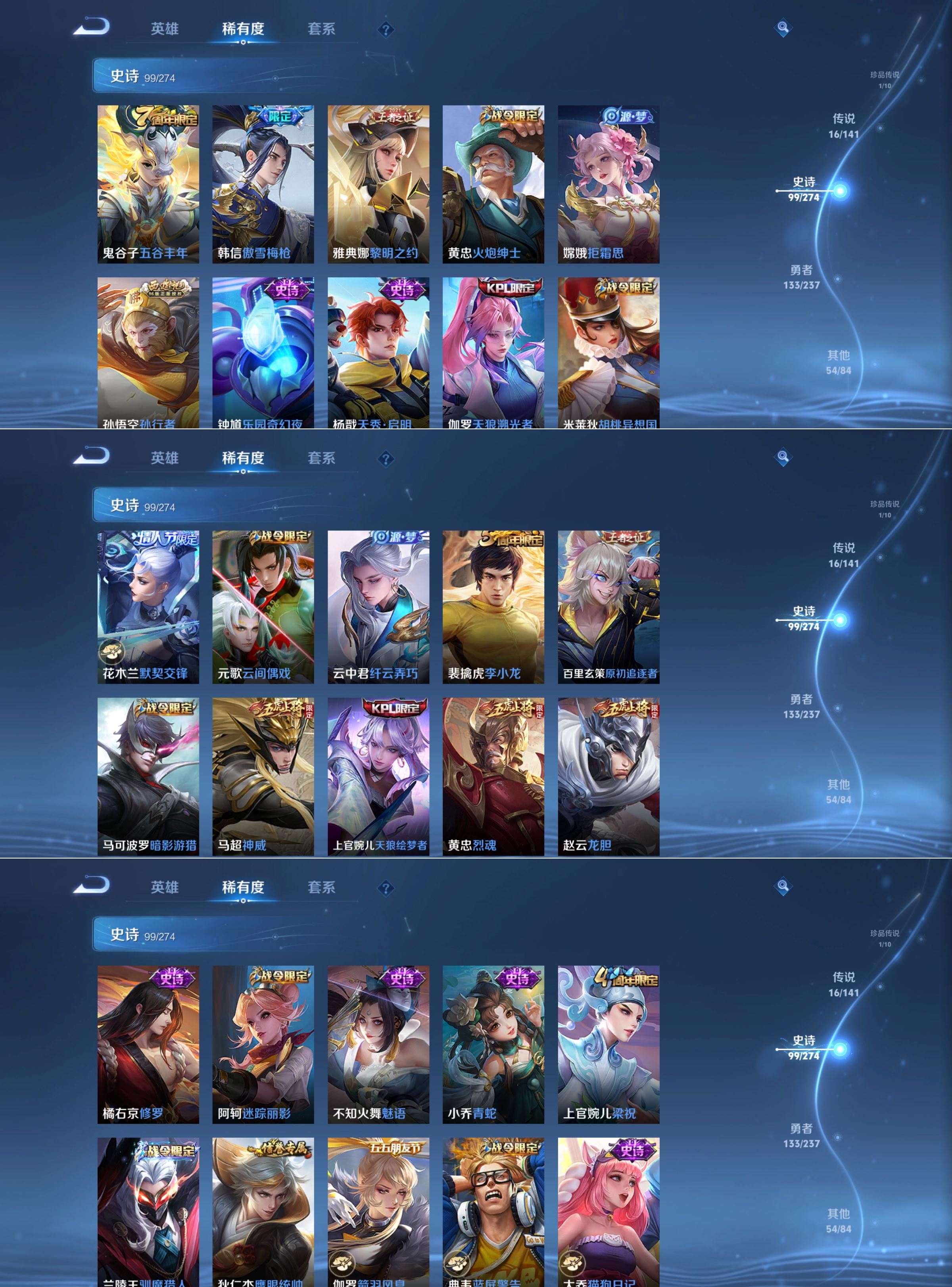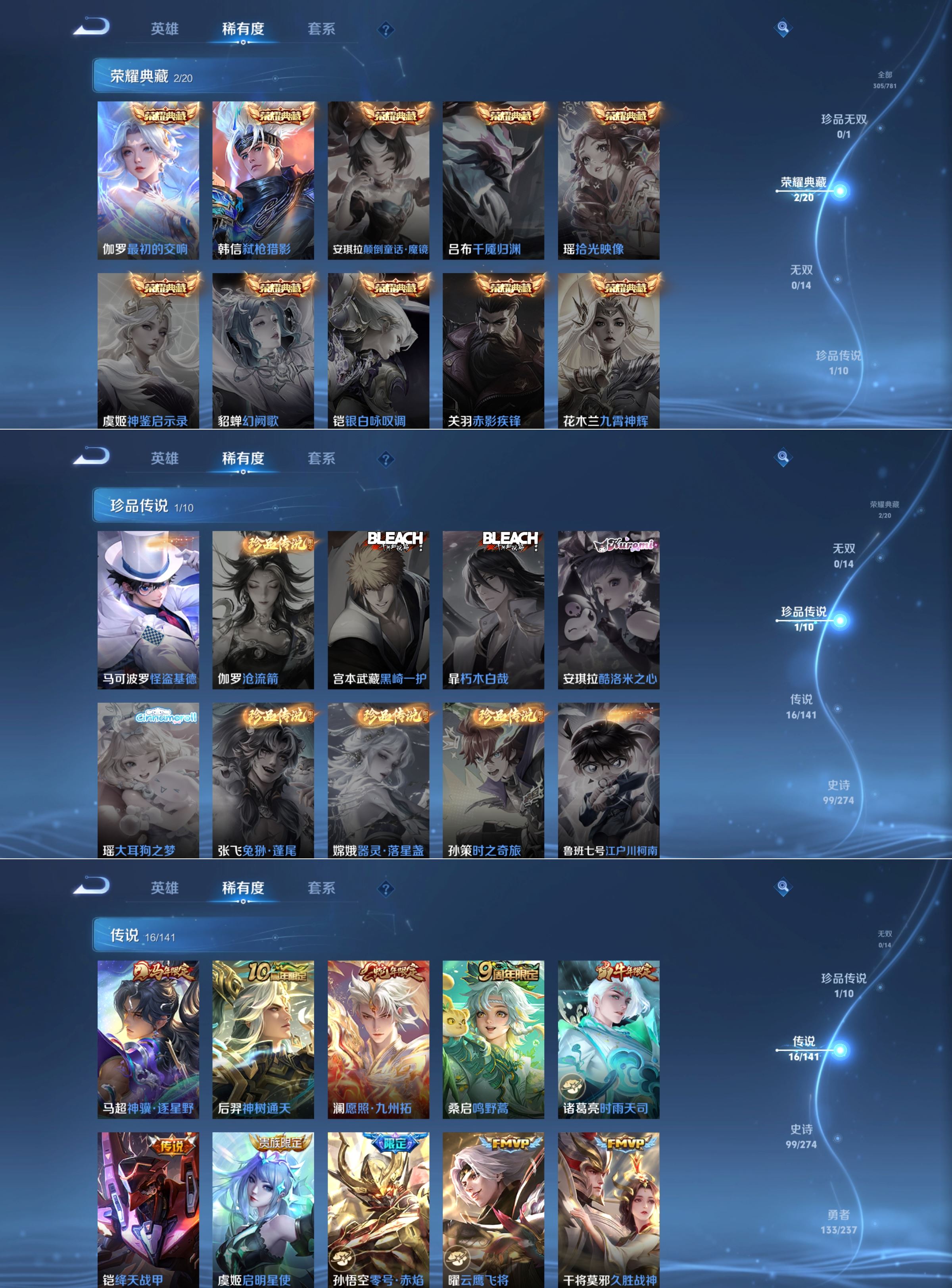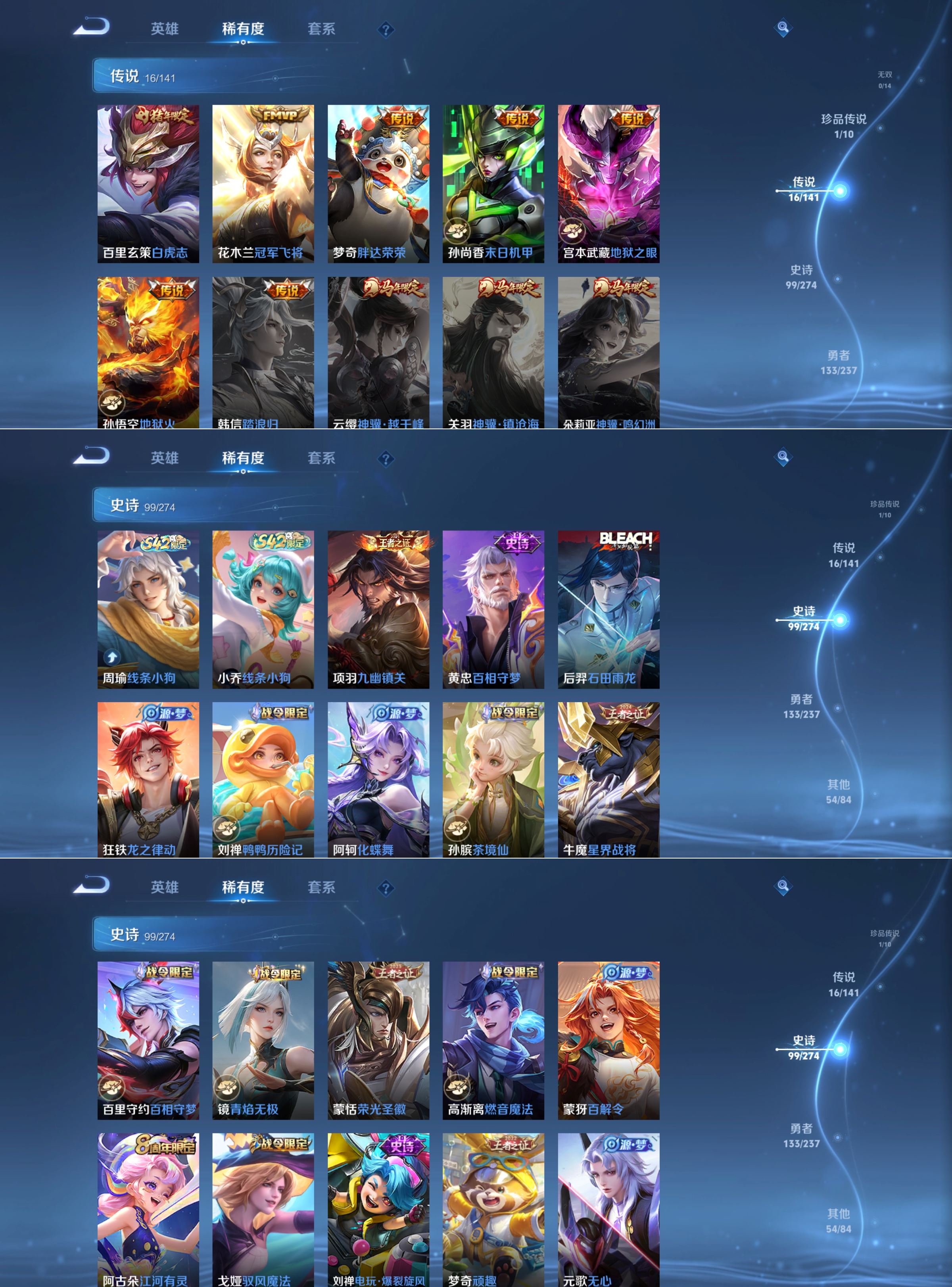 贵族等级:v8皮肤数:305传说品质16 生肖限定4 情人节限定2 珍品传说1 荣耀典藏2 英雄数:128